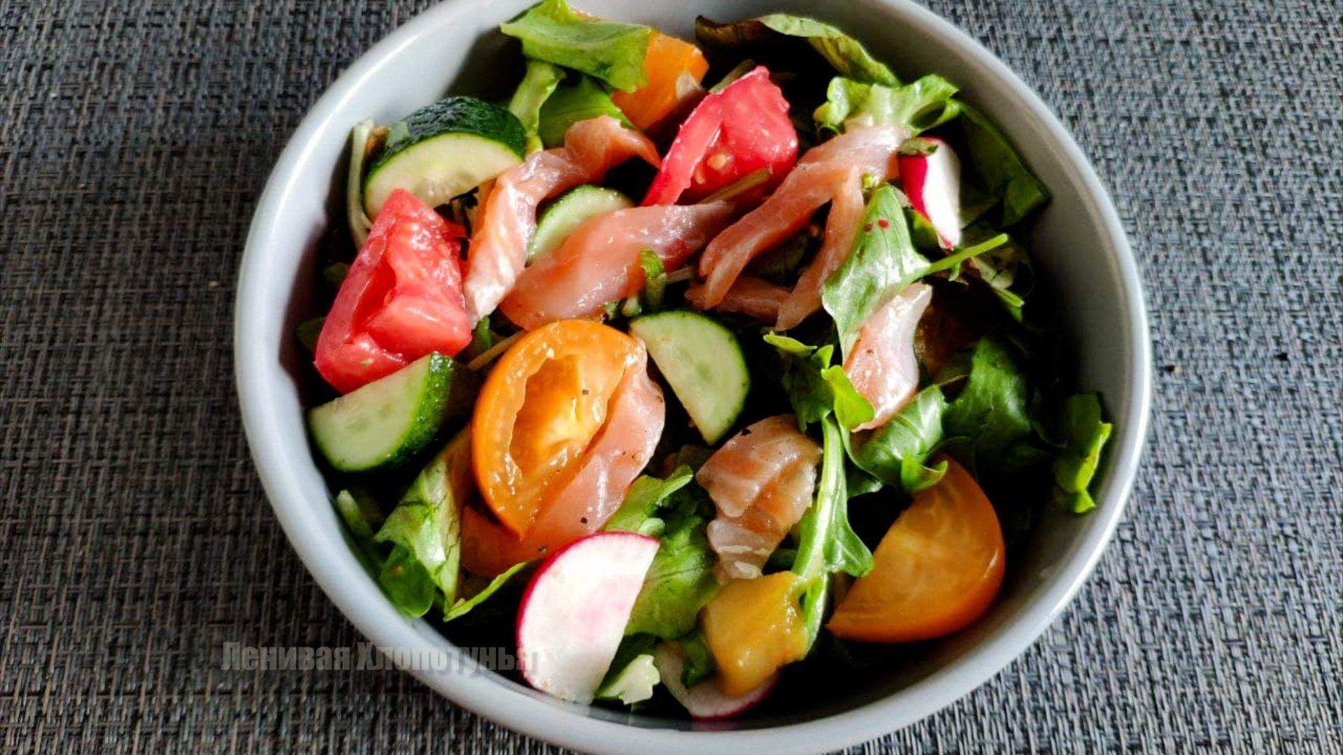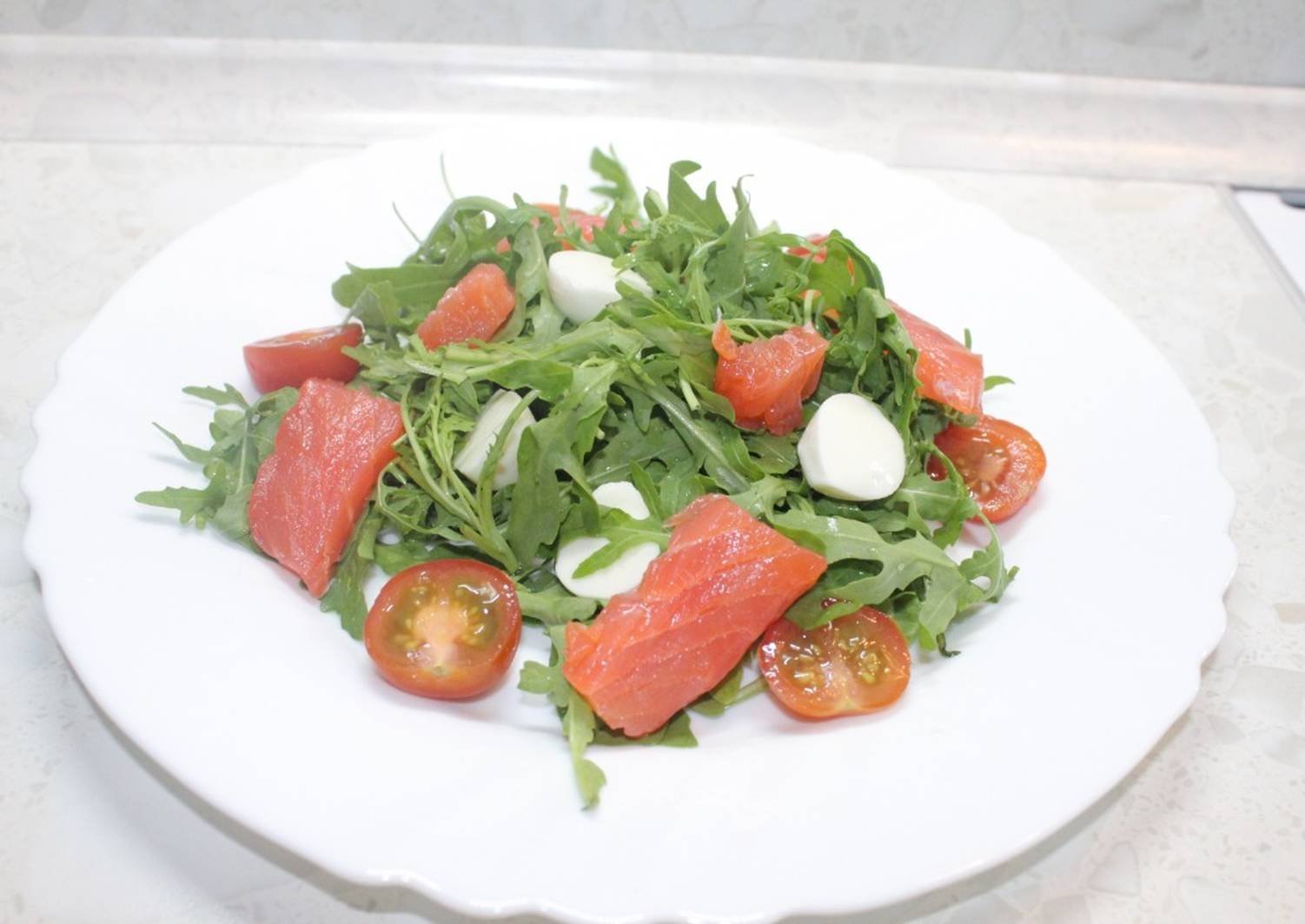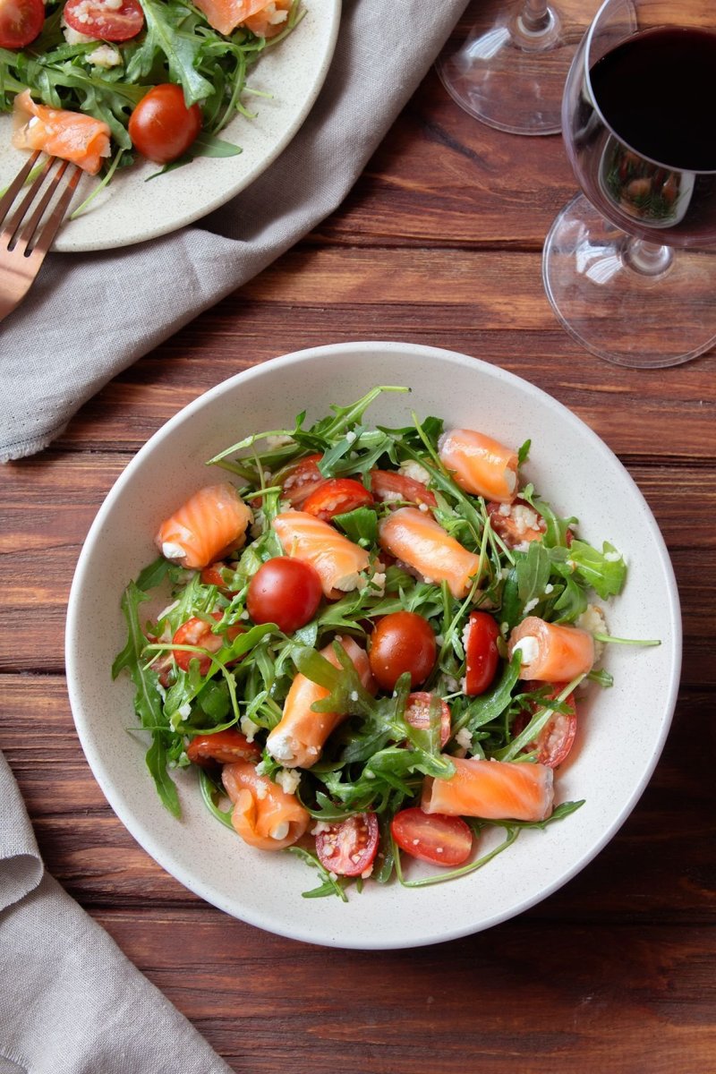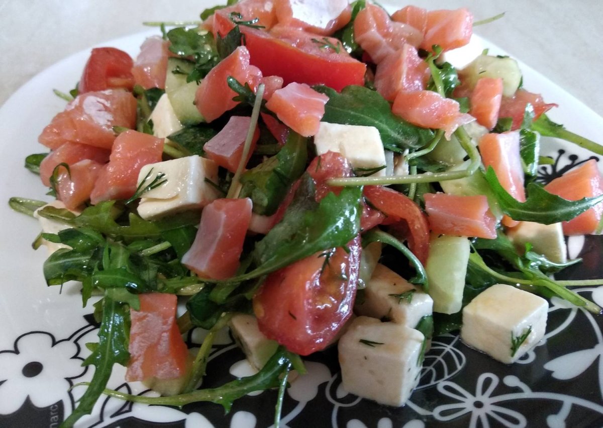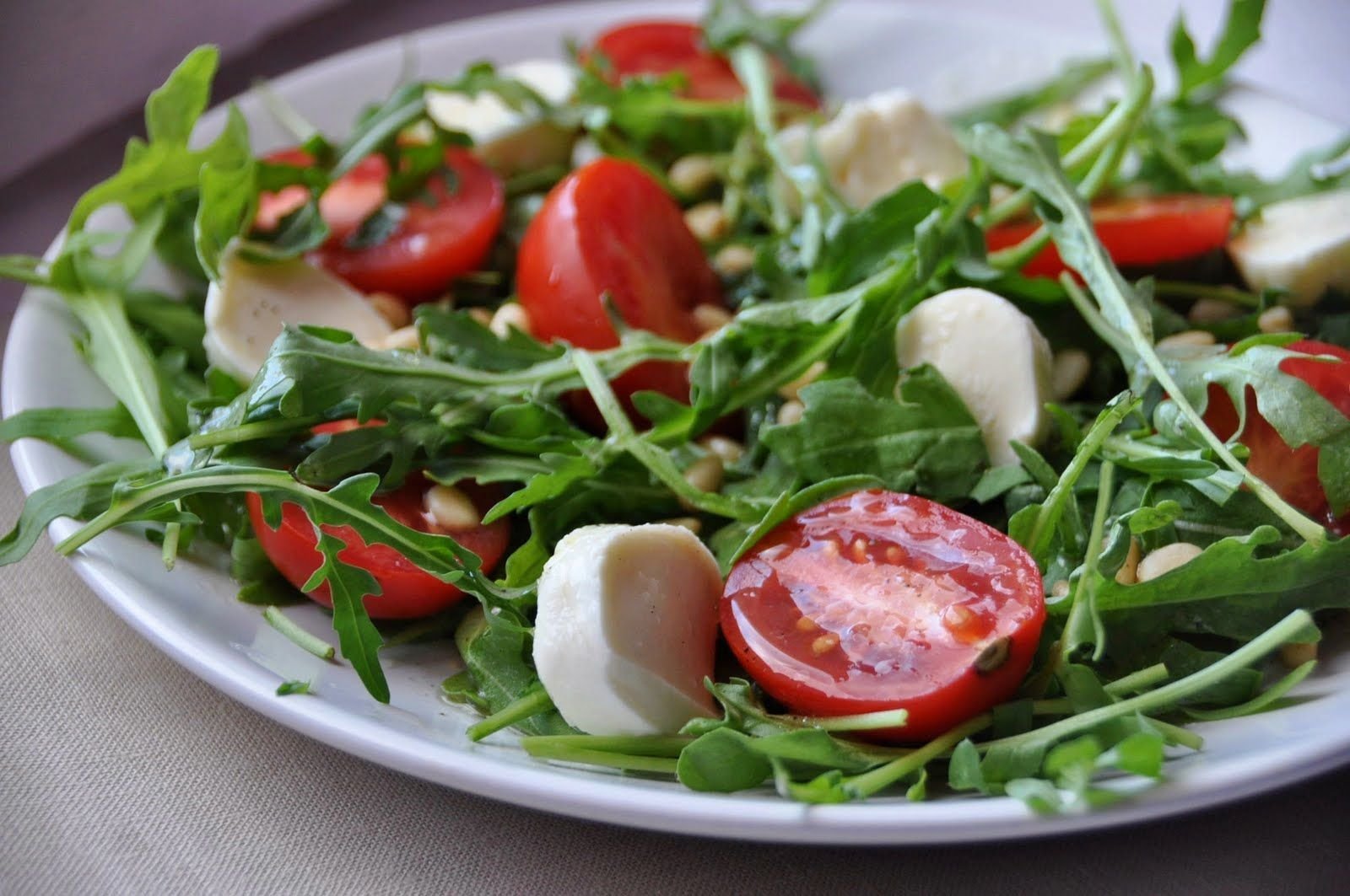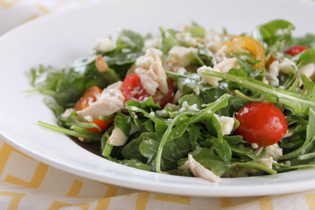 Салат с рукколой помидорами черри .сыром ,курицей.