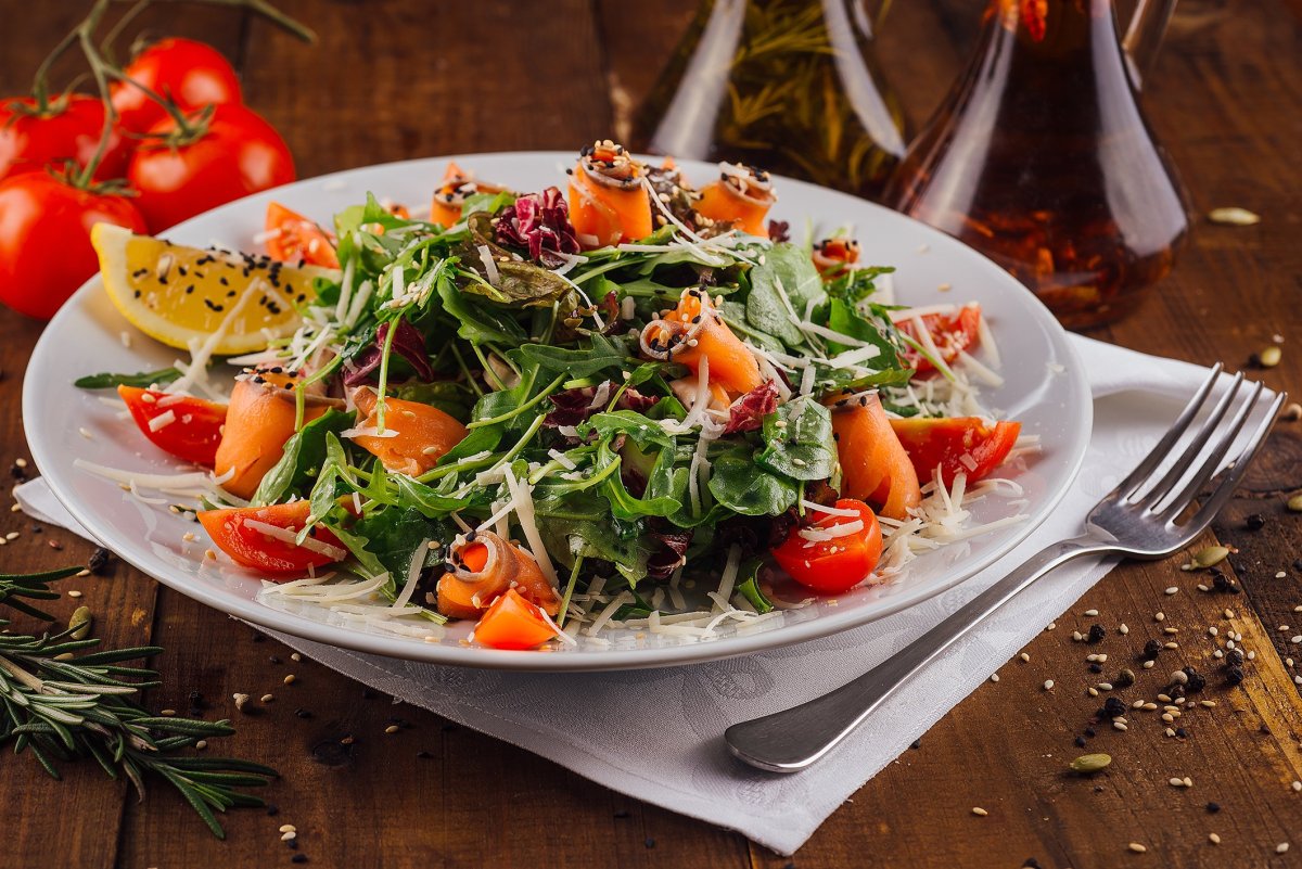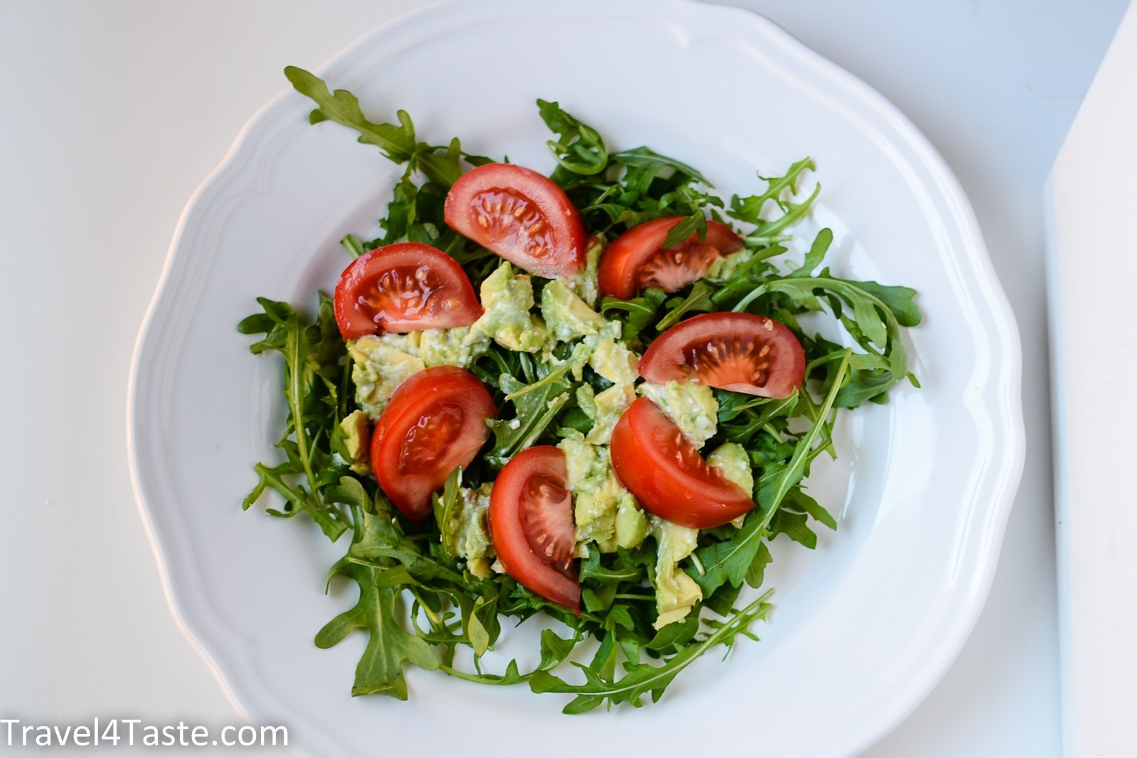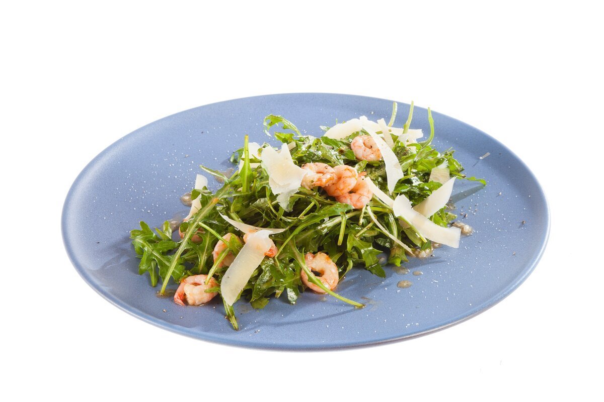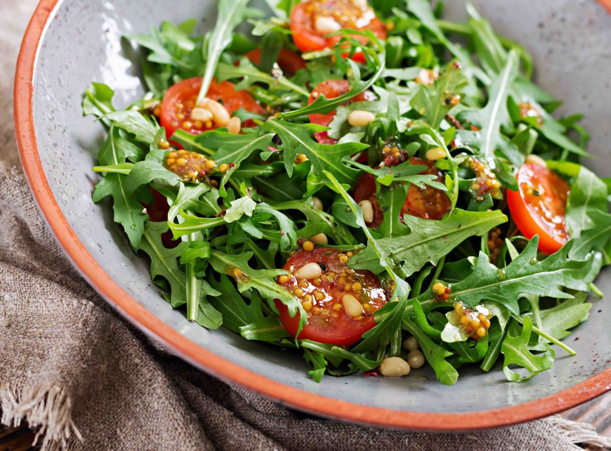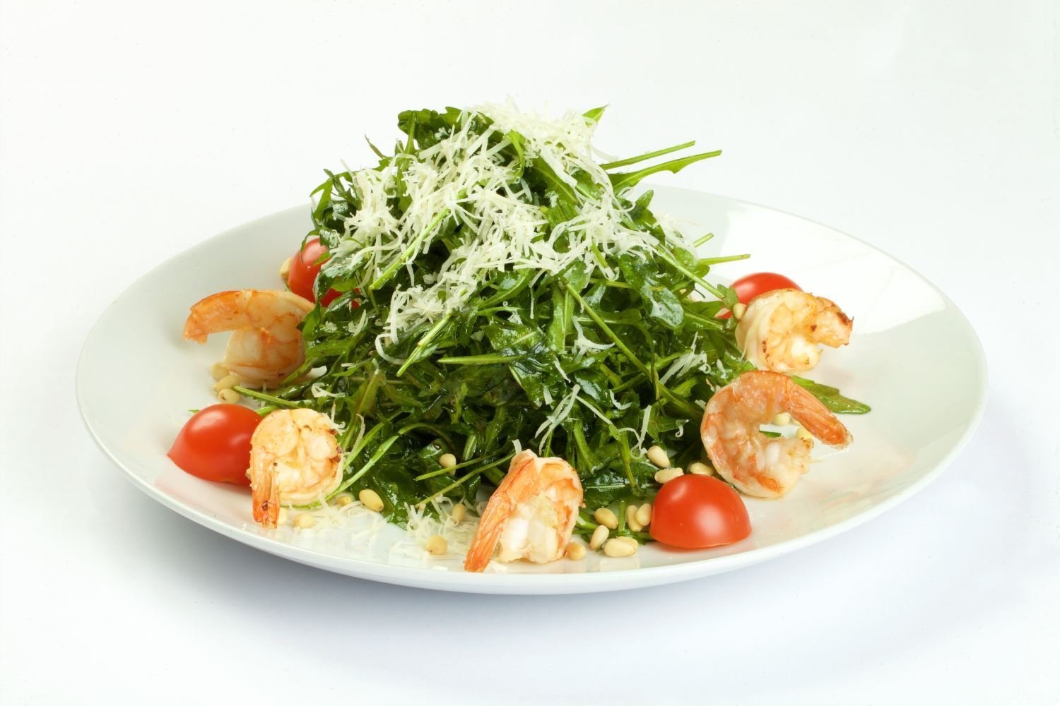 Салат с рукколой помидорами черри .сыром ,курицей.