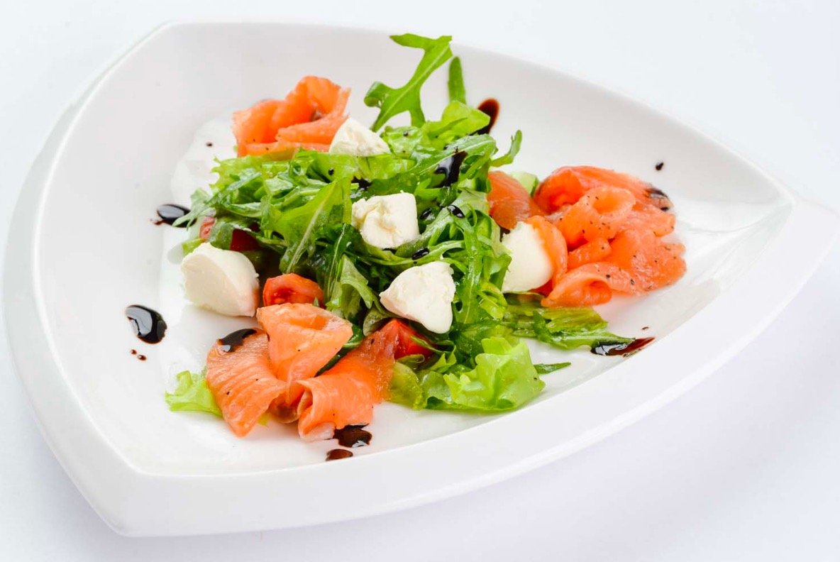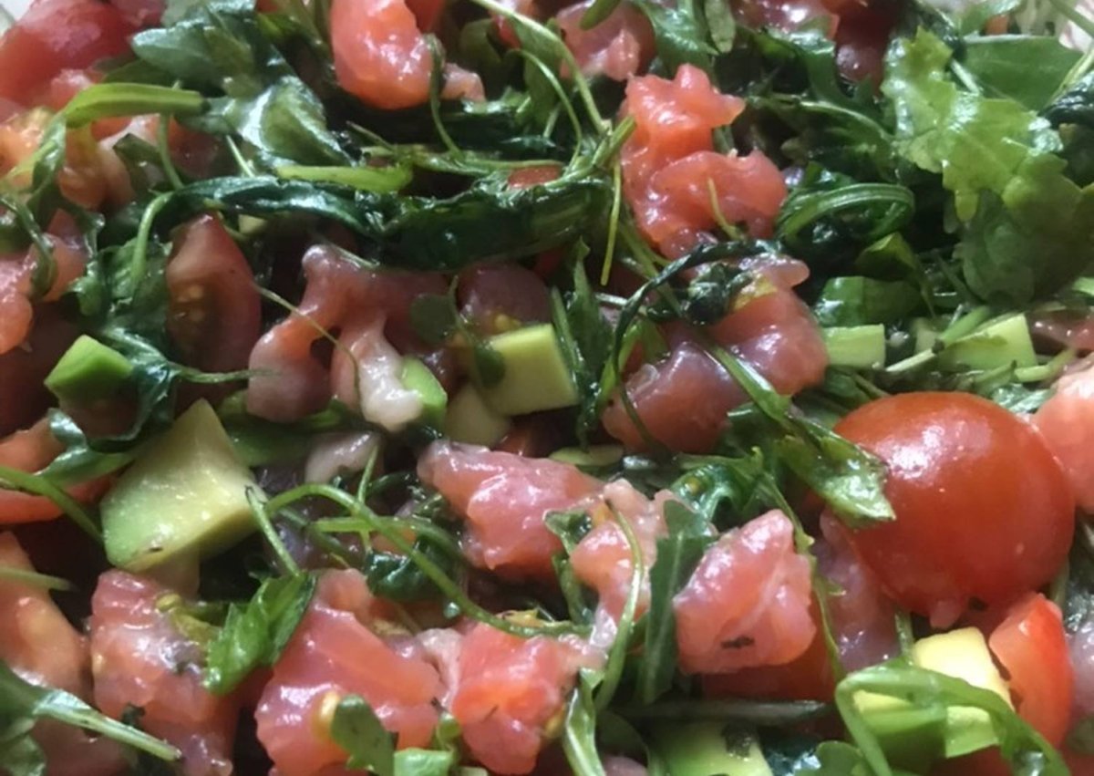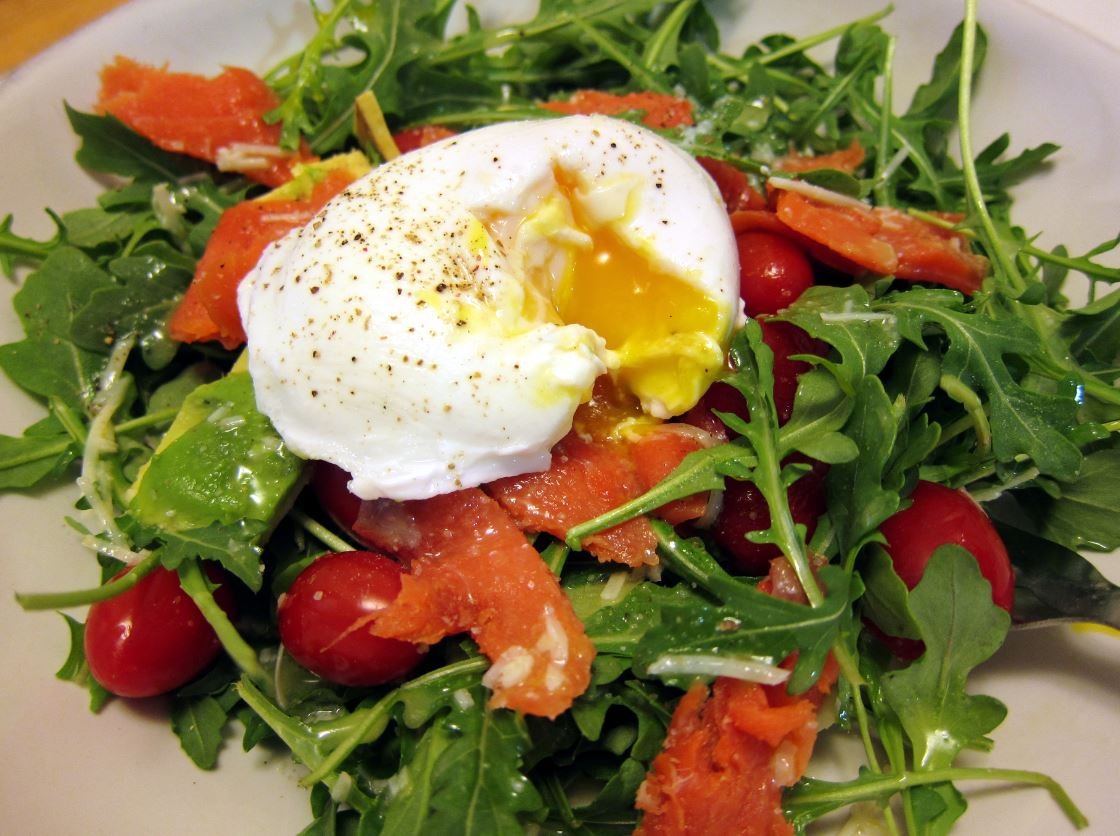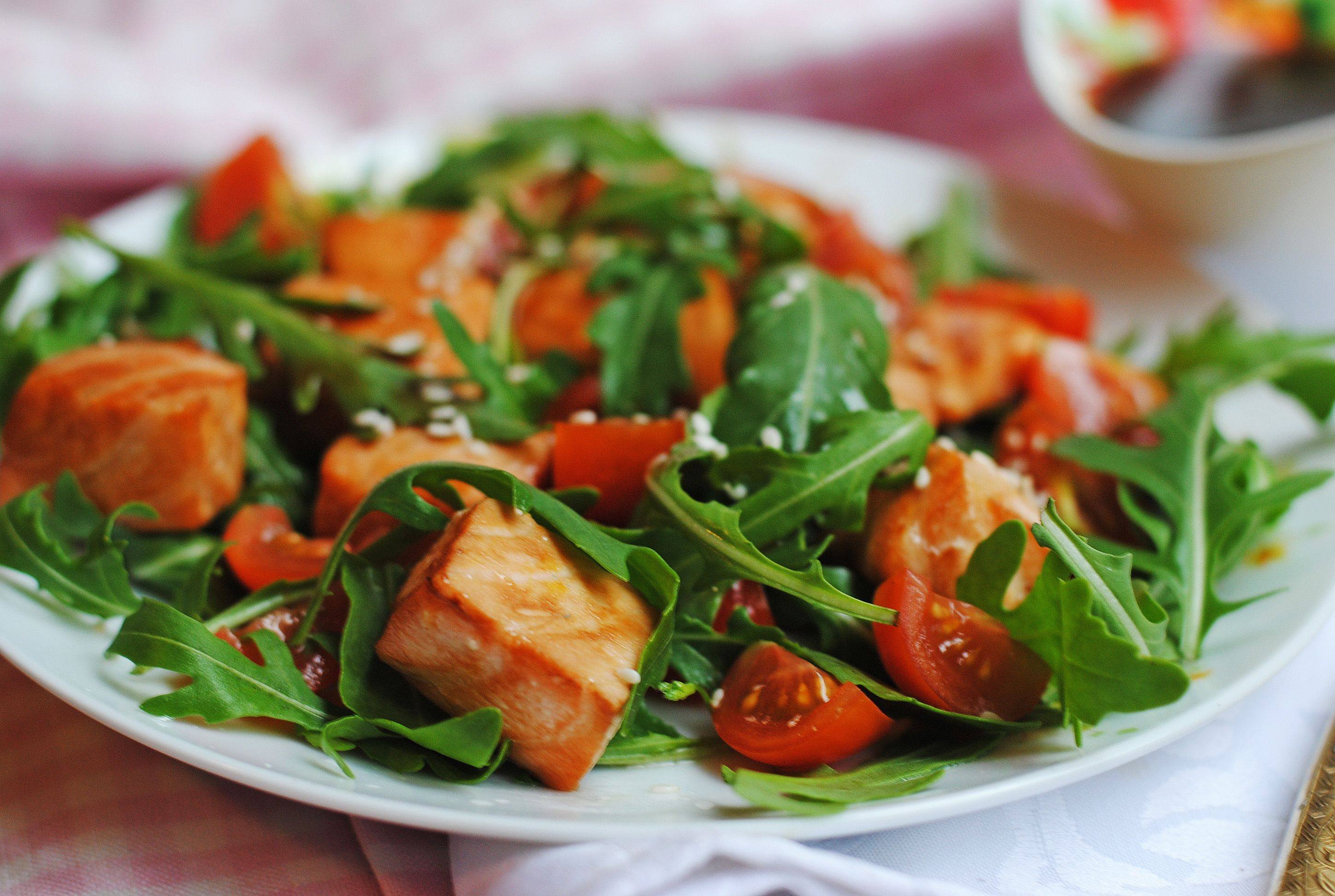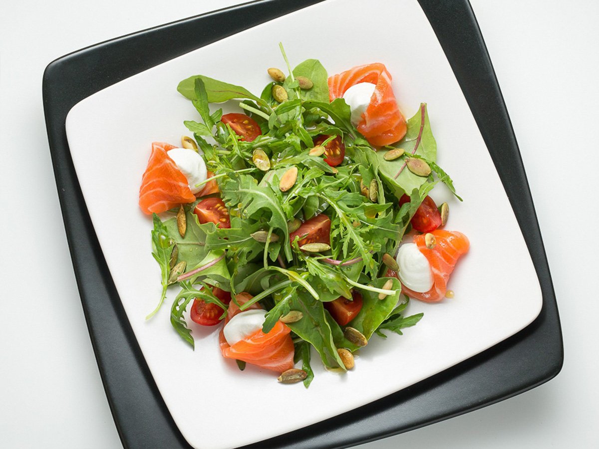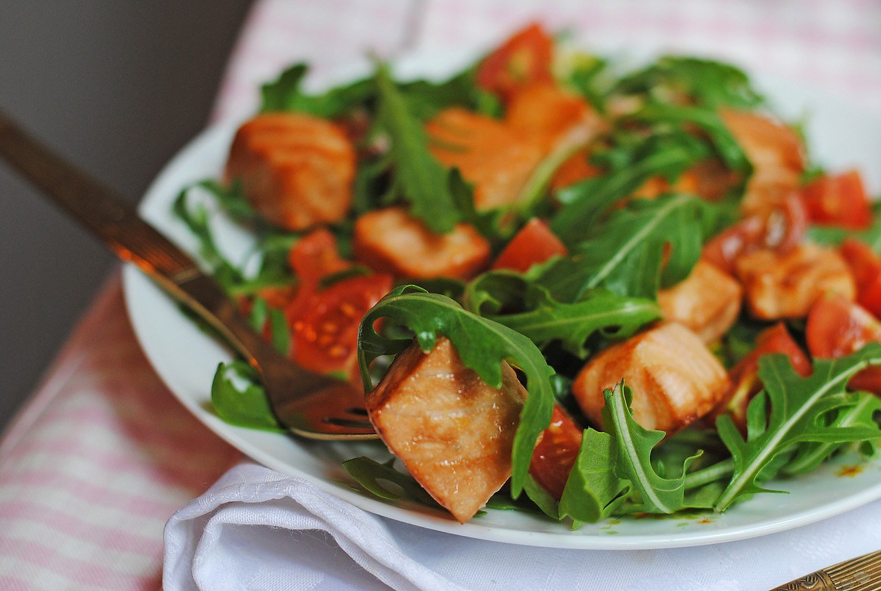 Салат с рукколой помидорами черри .сыром ,курицей.