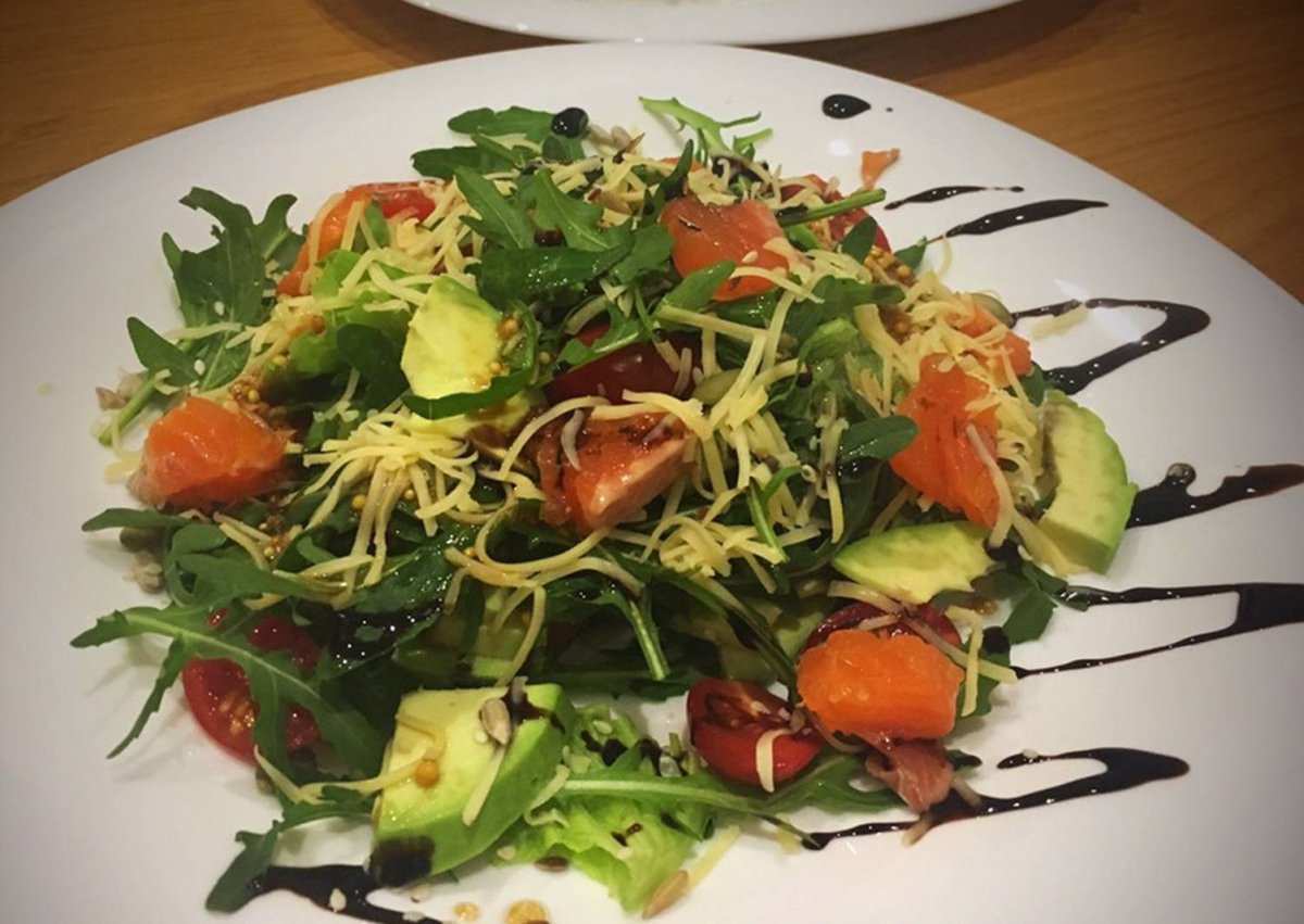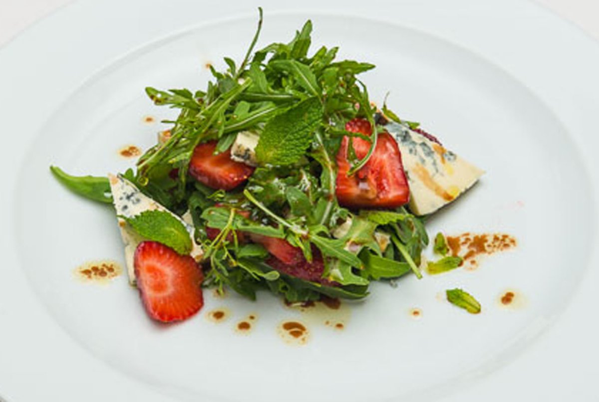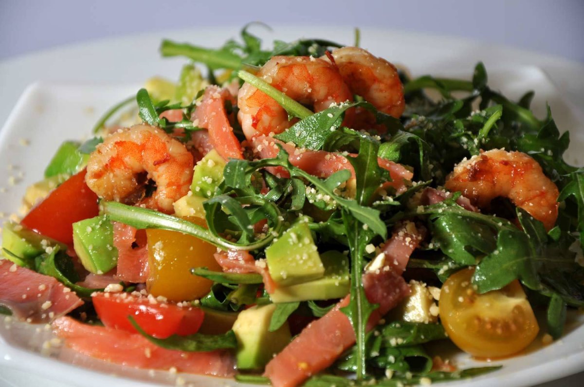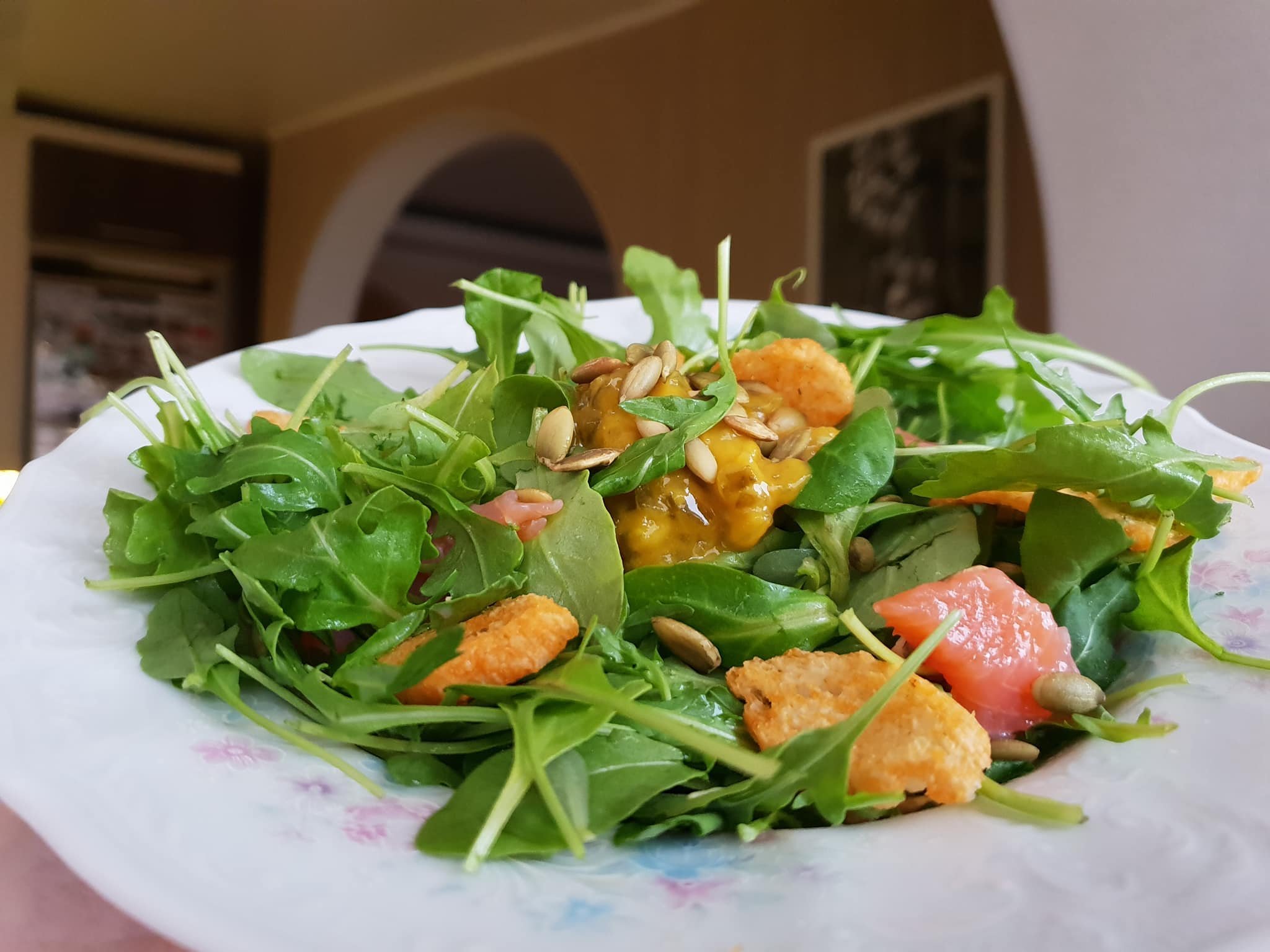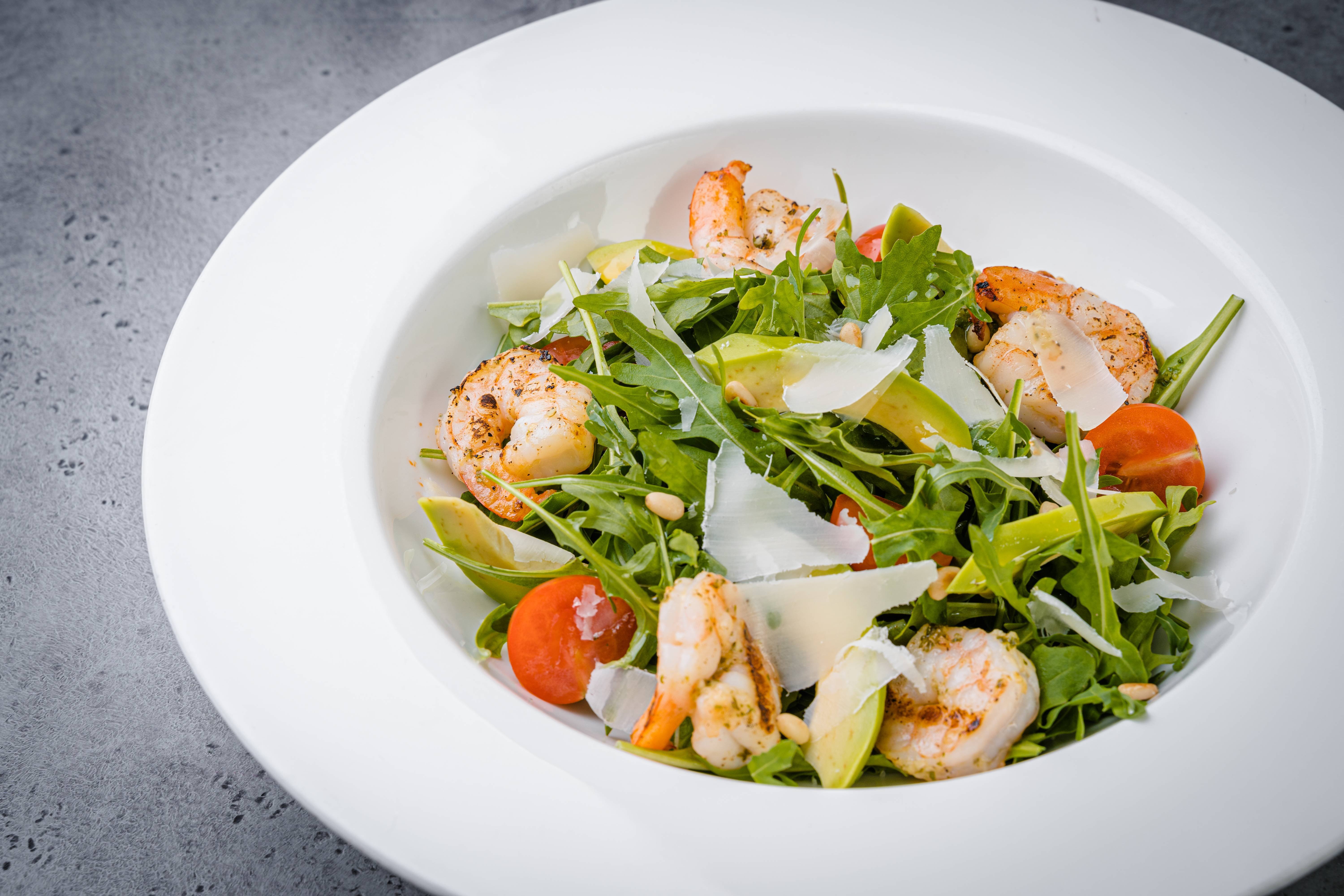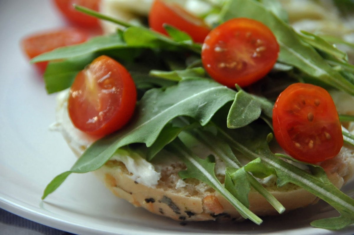 Салат с рукколой помидорами черри .сыром ,курицей.
