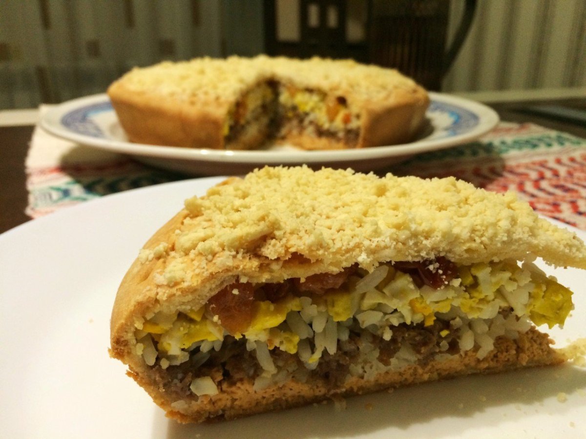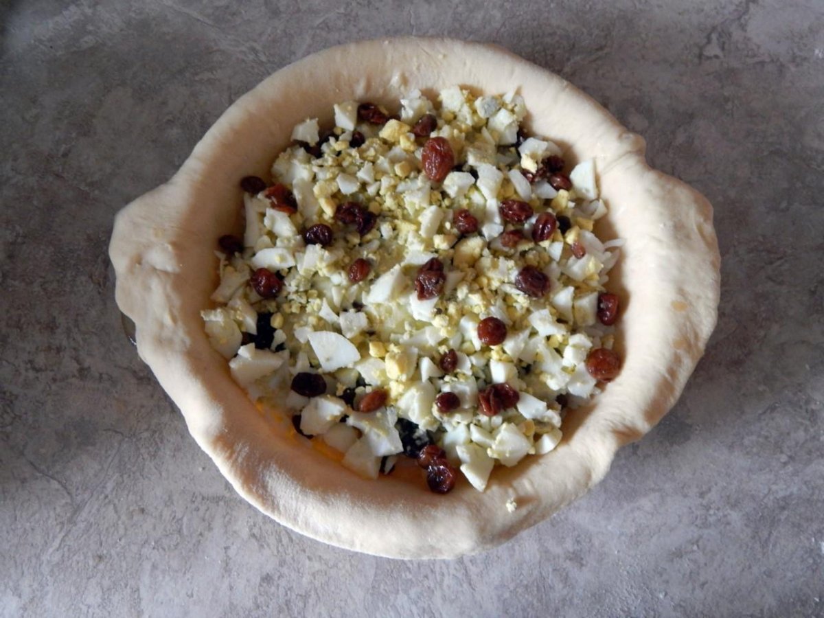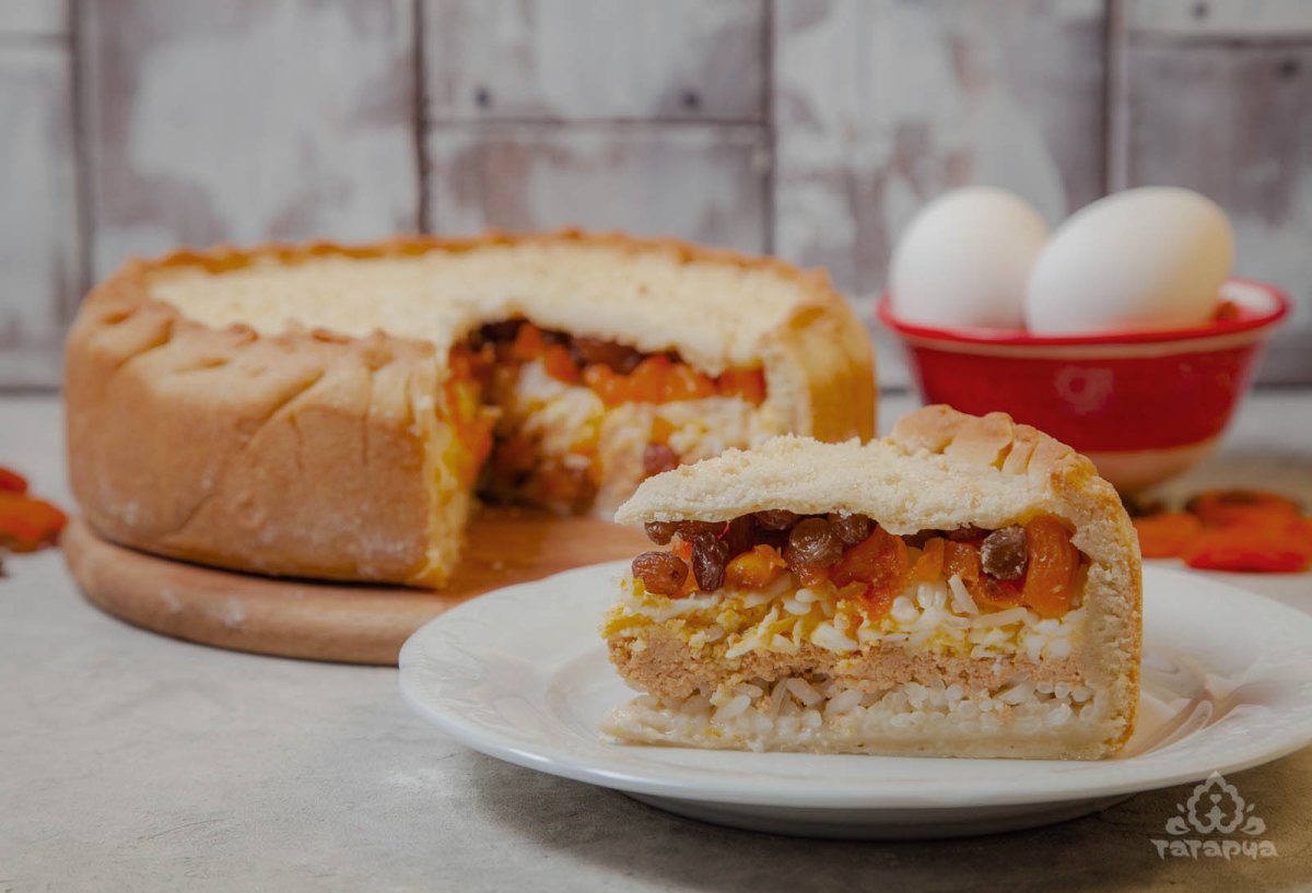 Пирог татарский с рисом яйцом творогом и изюмом