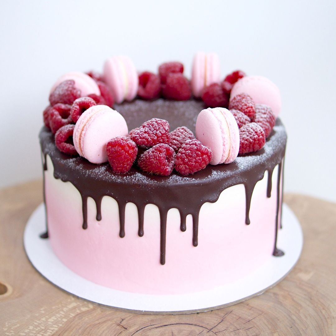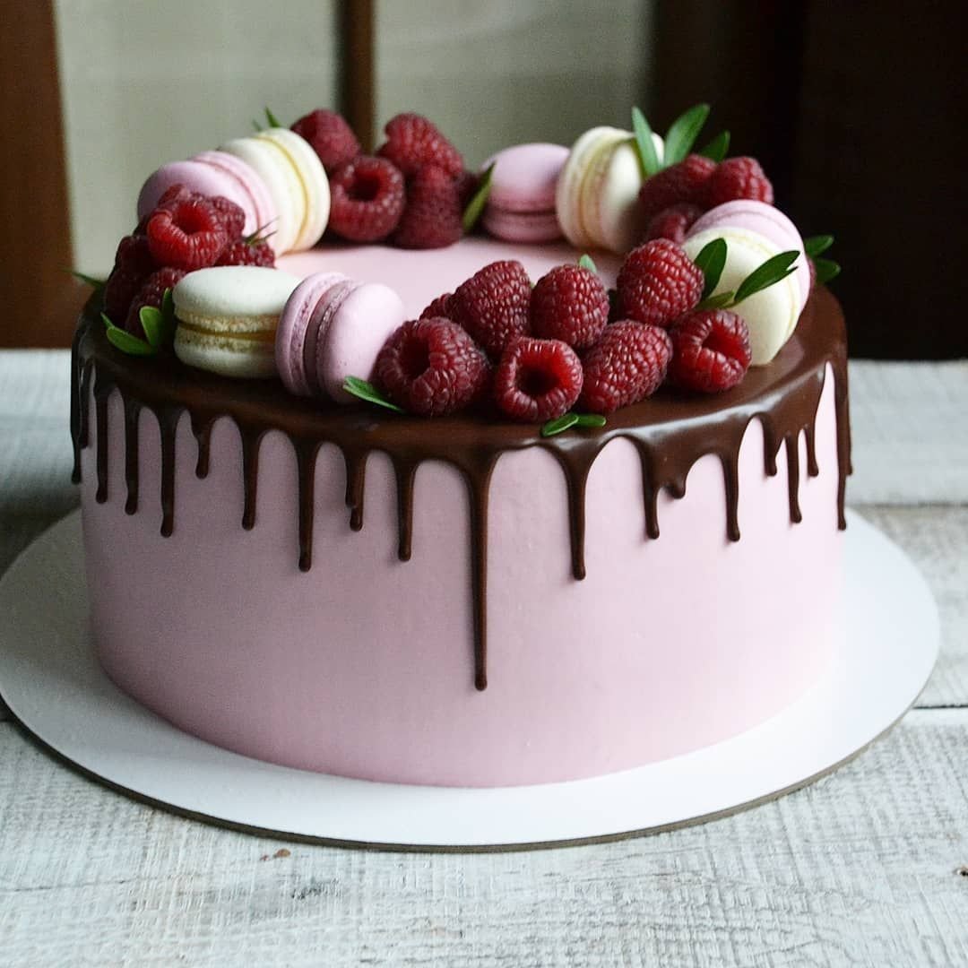 Розовый торт с шоколадными подтеками