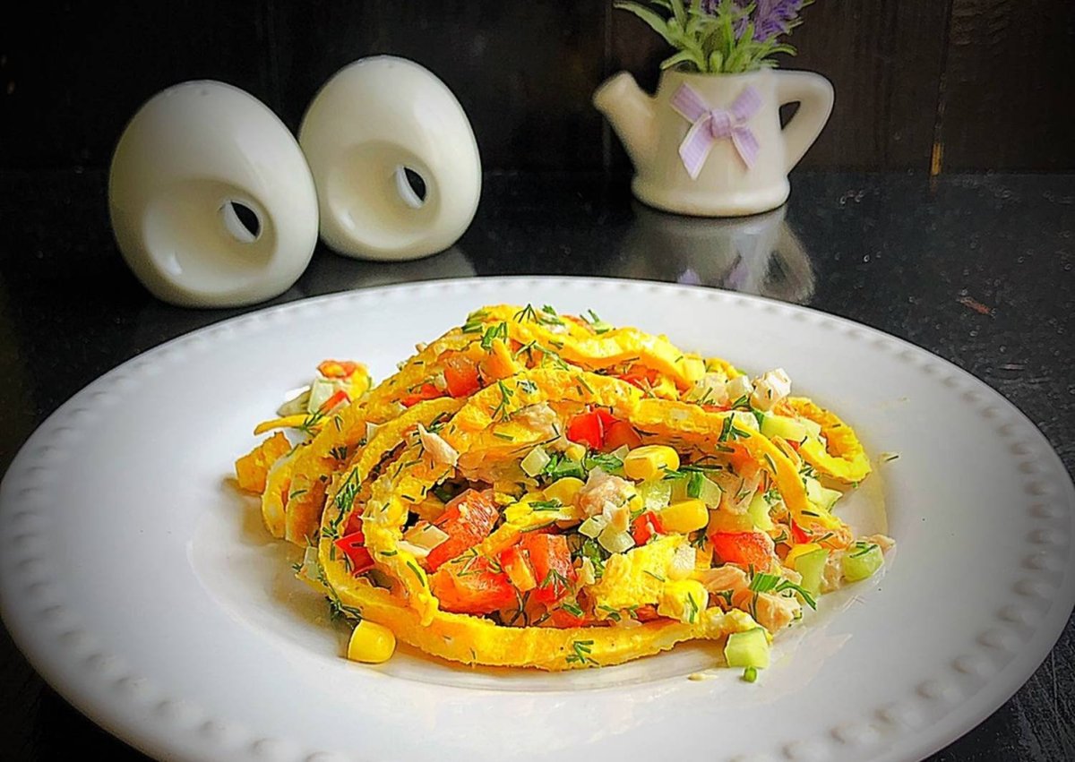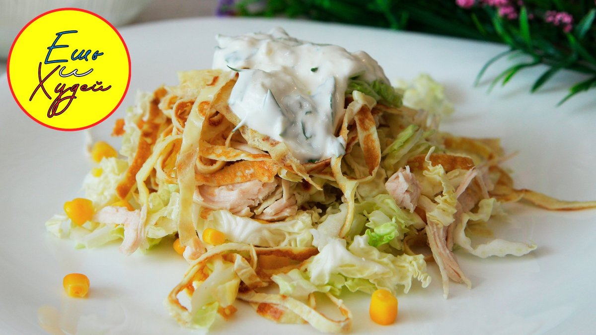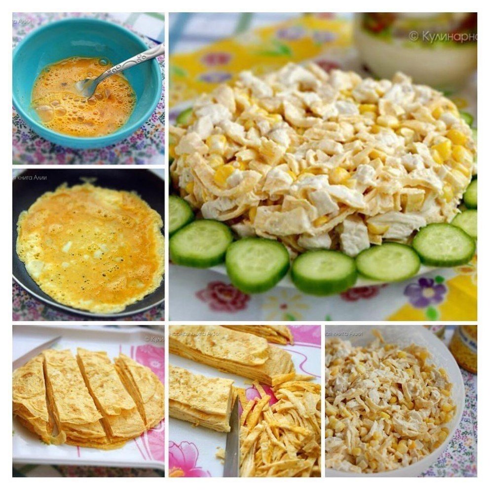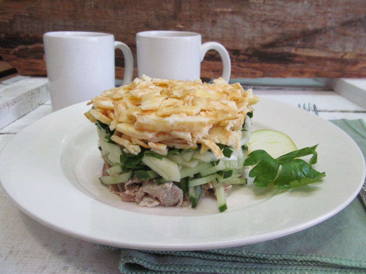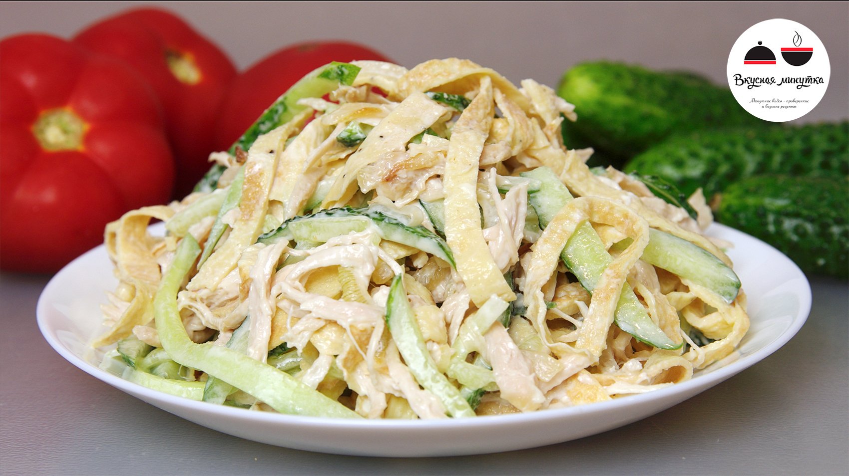 Салат с яичными блинчиками и копченой курицей и огурцом