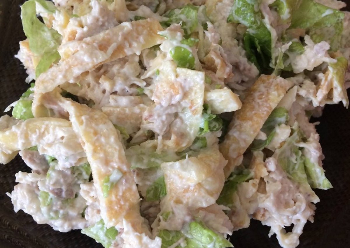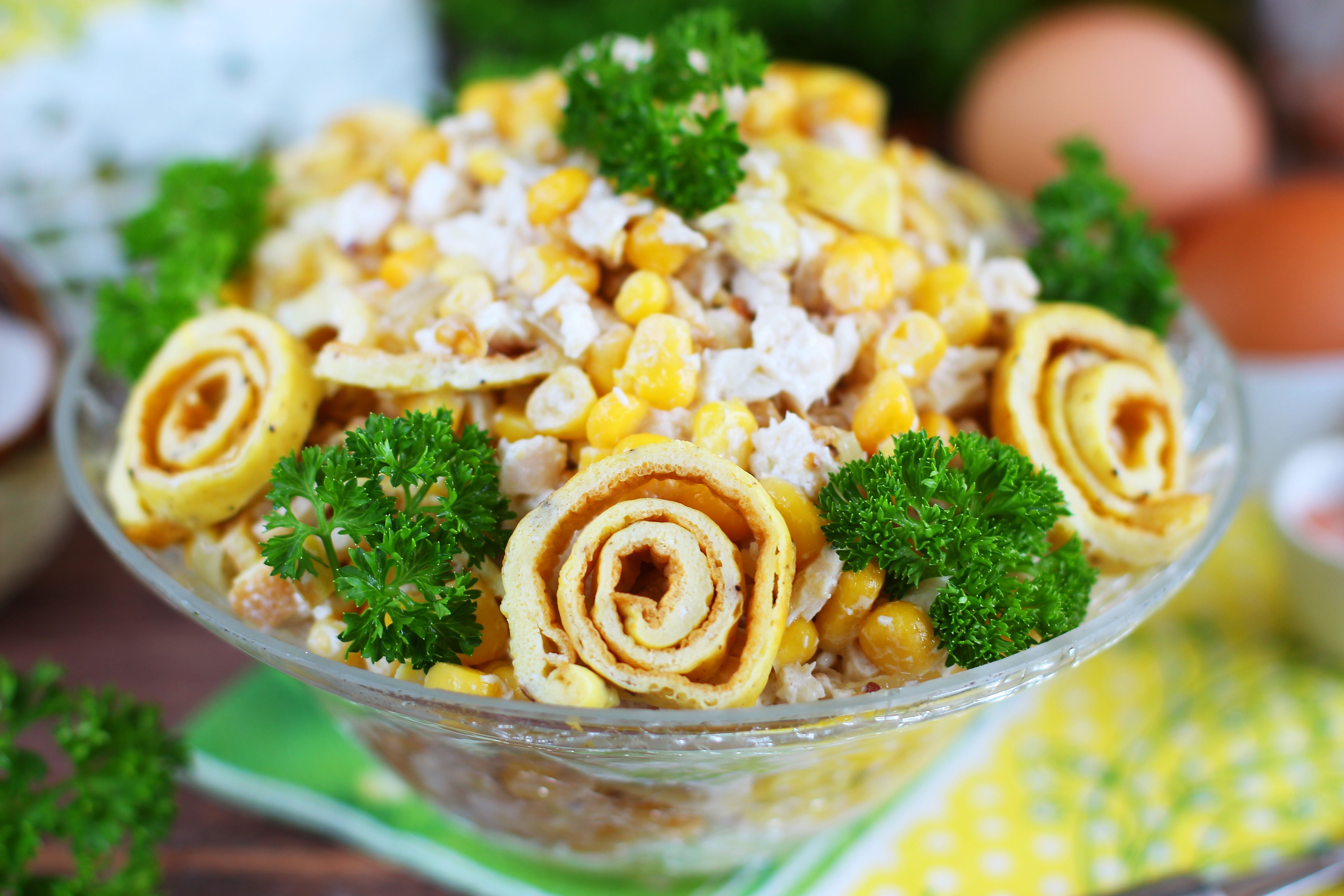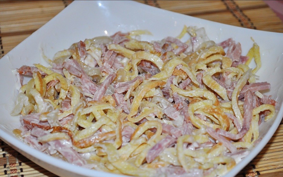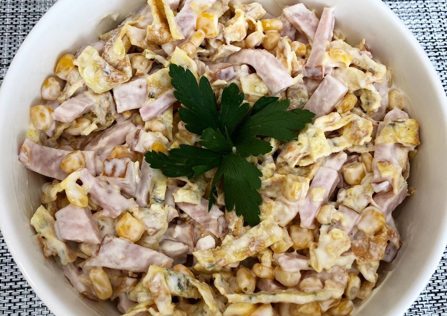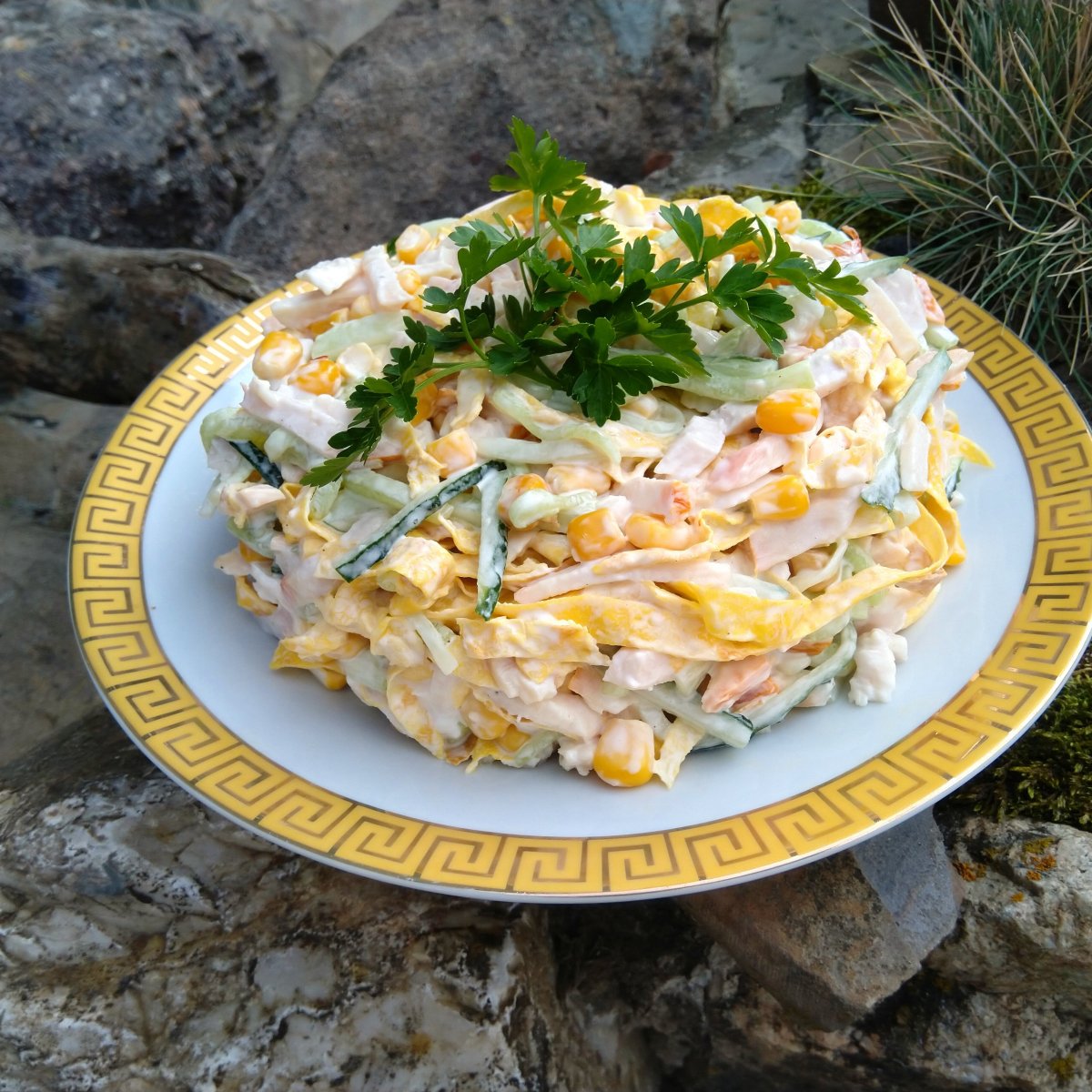 Салат с яичными блинчиками и копченой курицей и огурцом