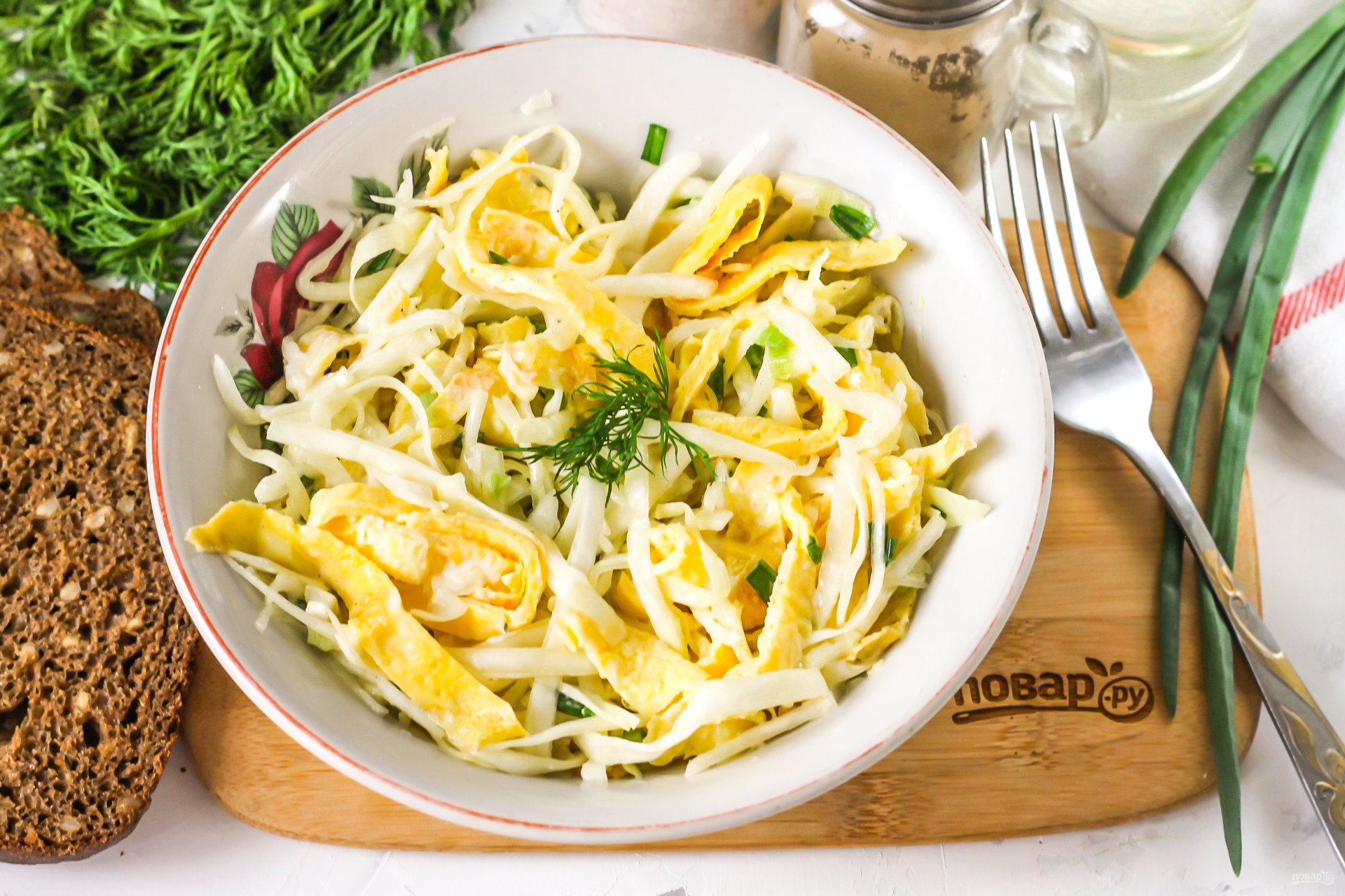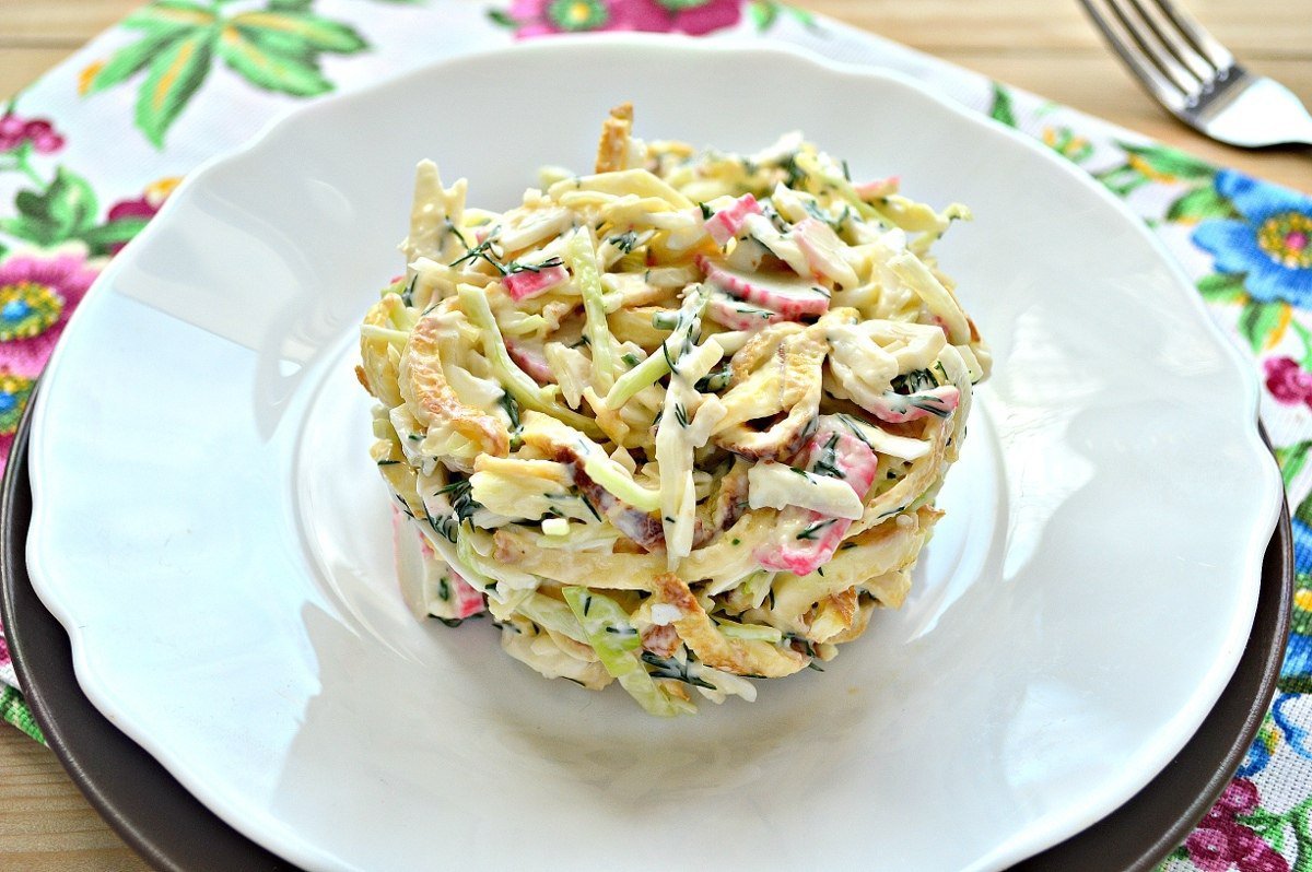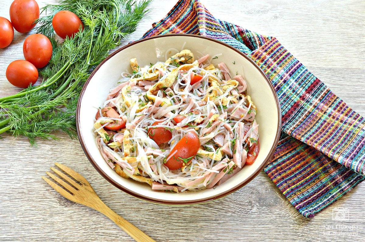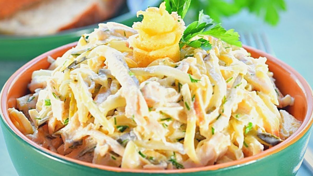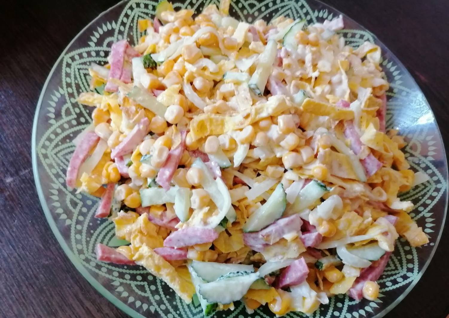 Салат с яичными блинчиками и копченой курицей и огурцом