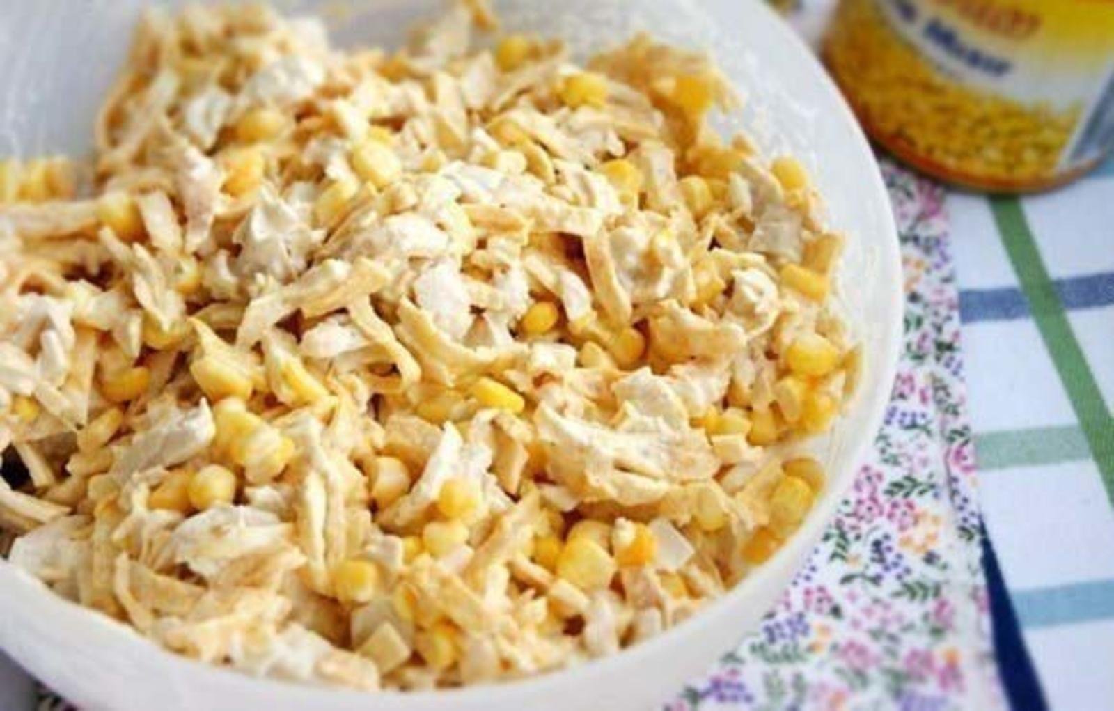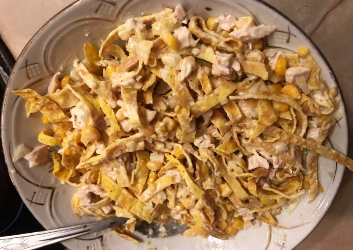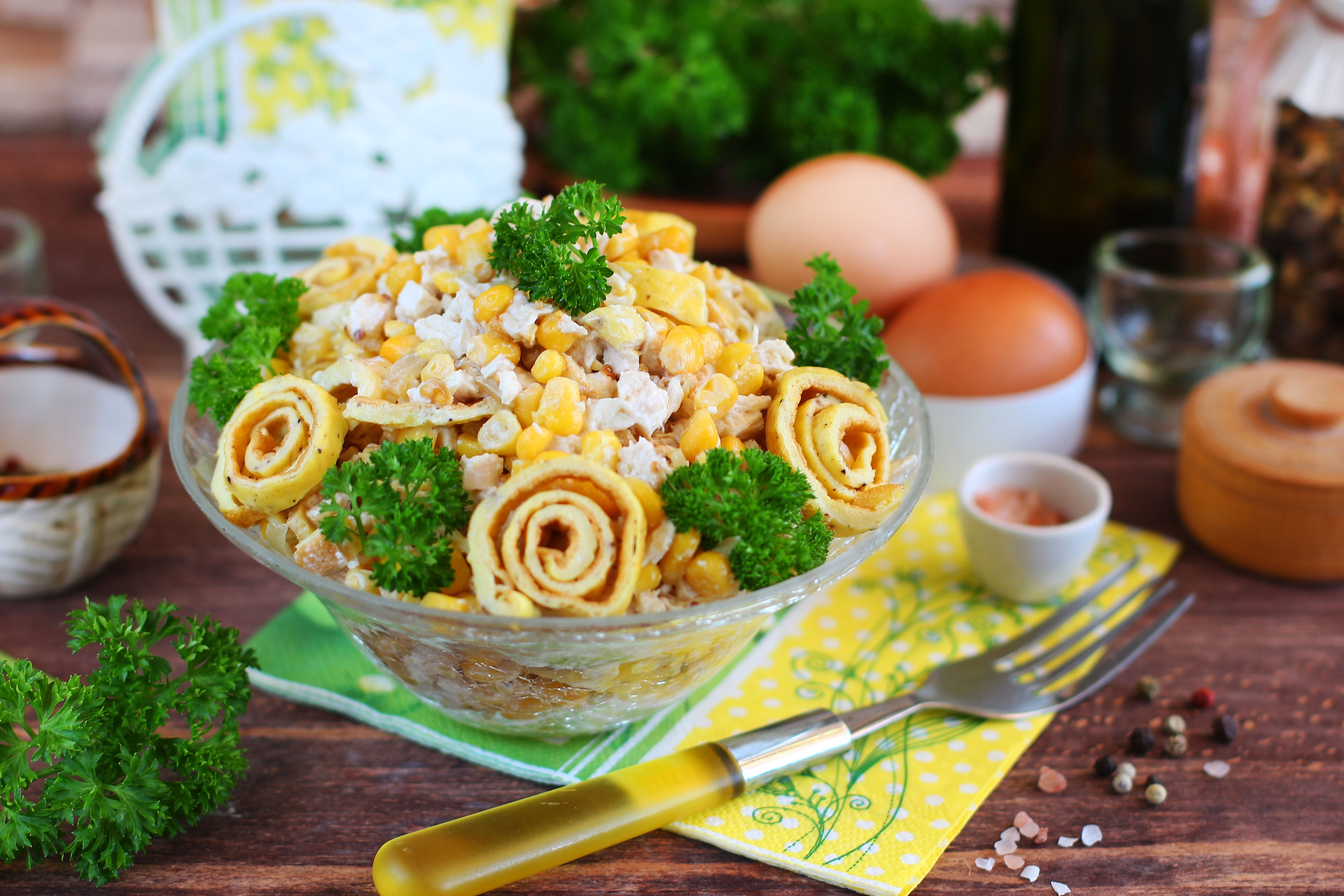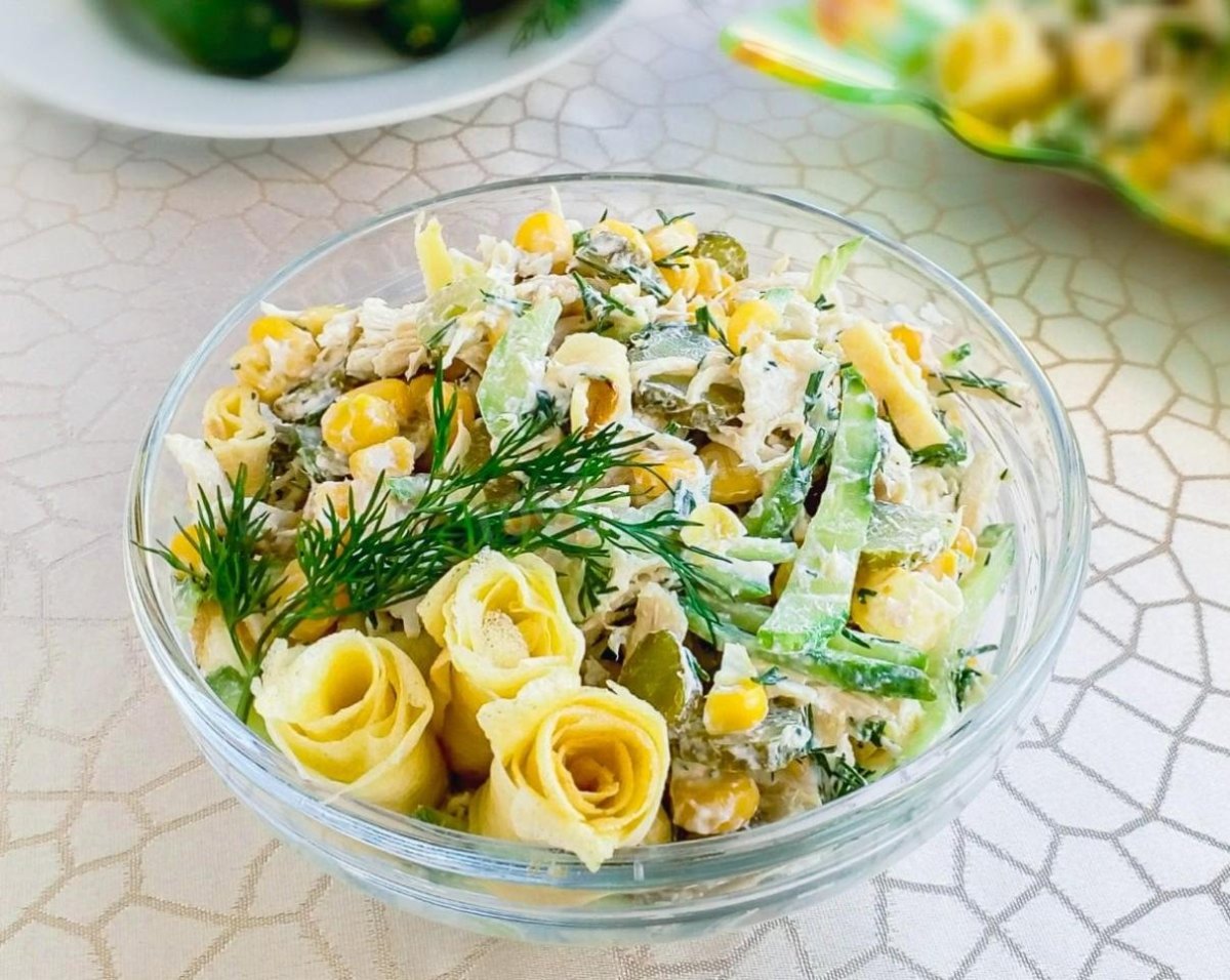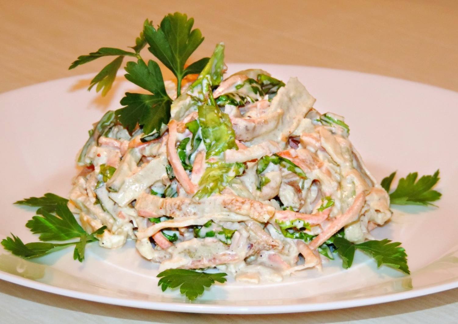Салат с яичными блинчиками и копченой курицей и огурцом