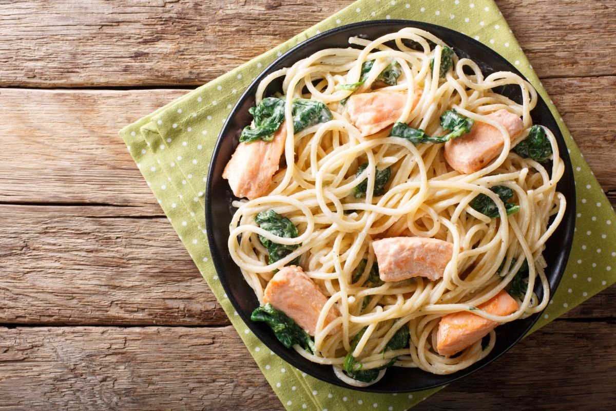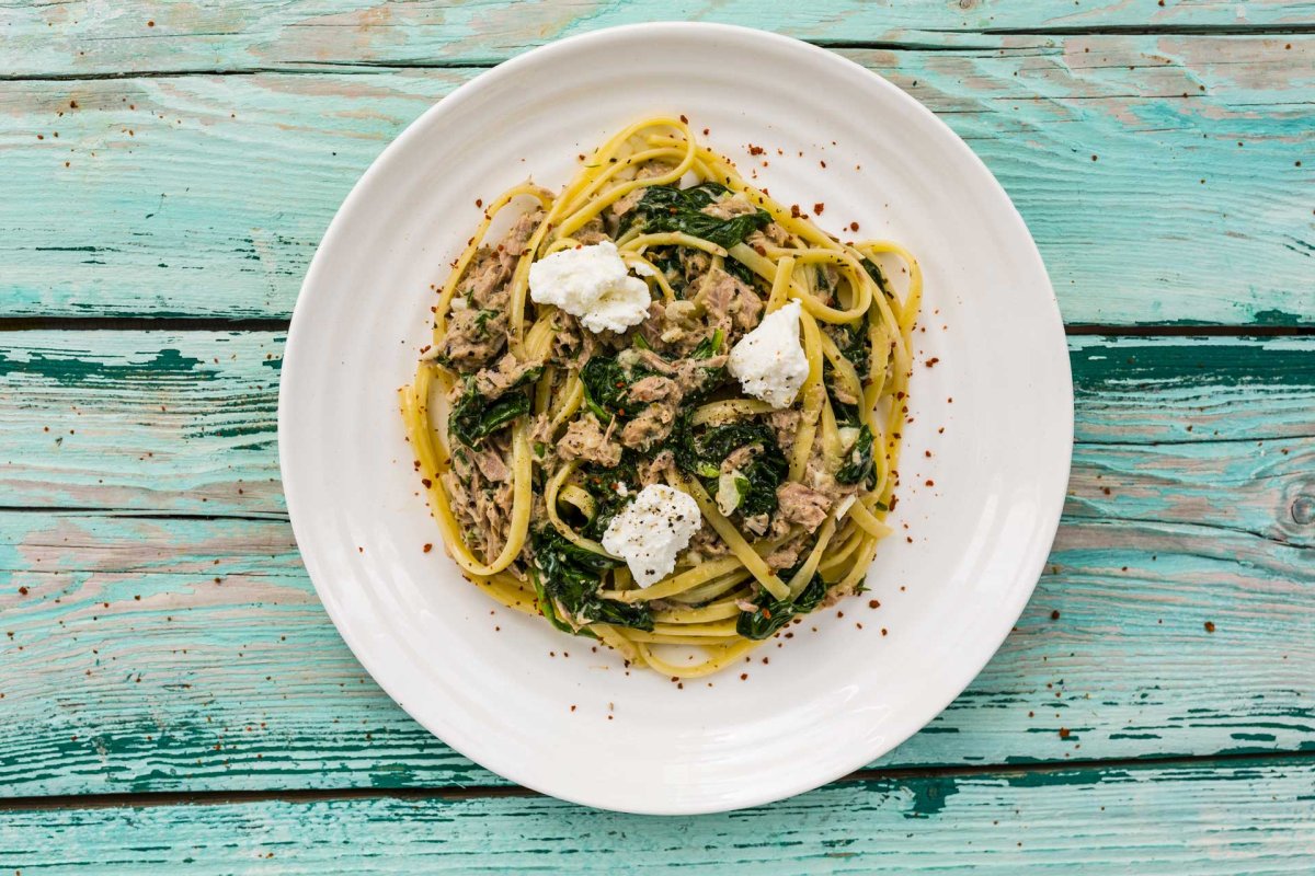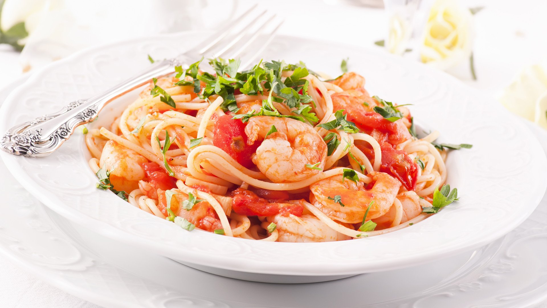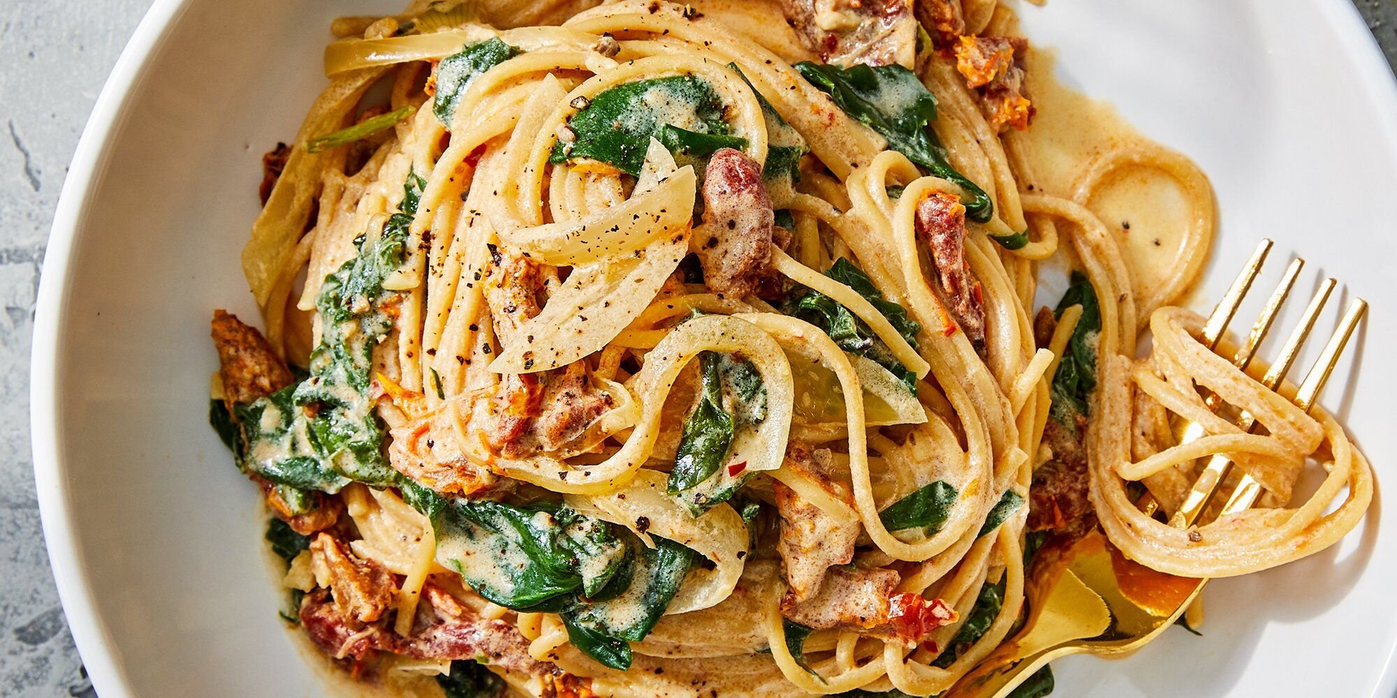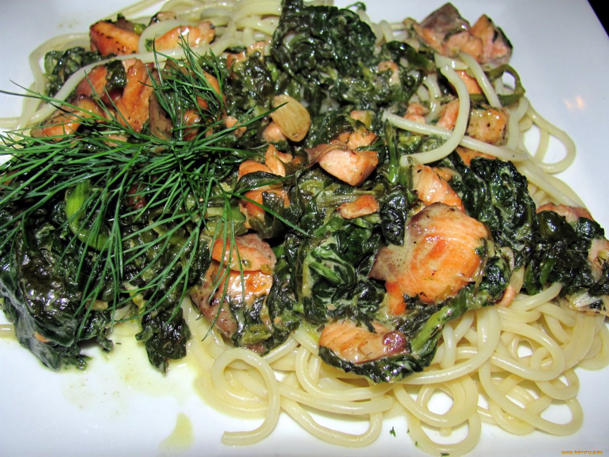 Фетучини с фрикадельками в сливочном соусе вид сверху