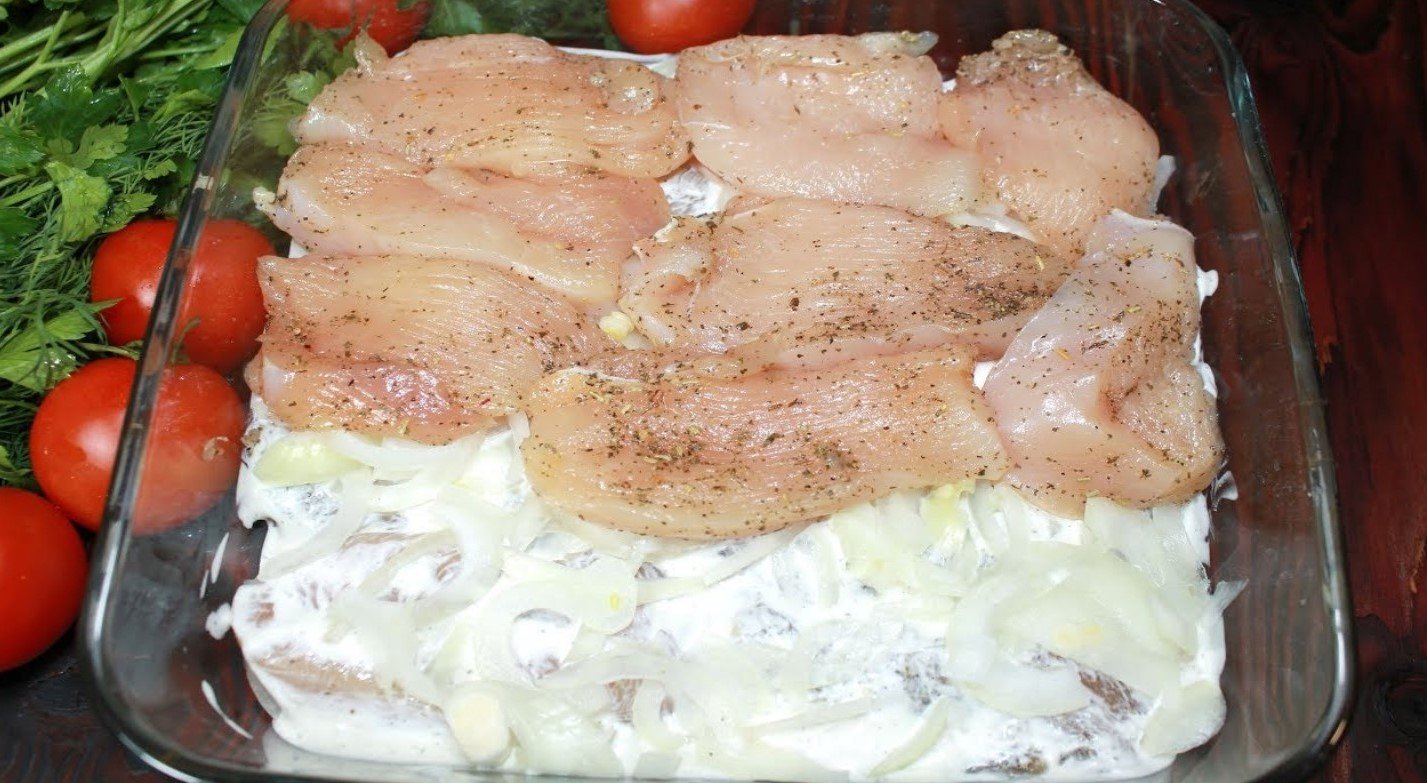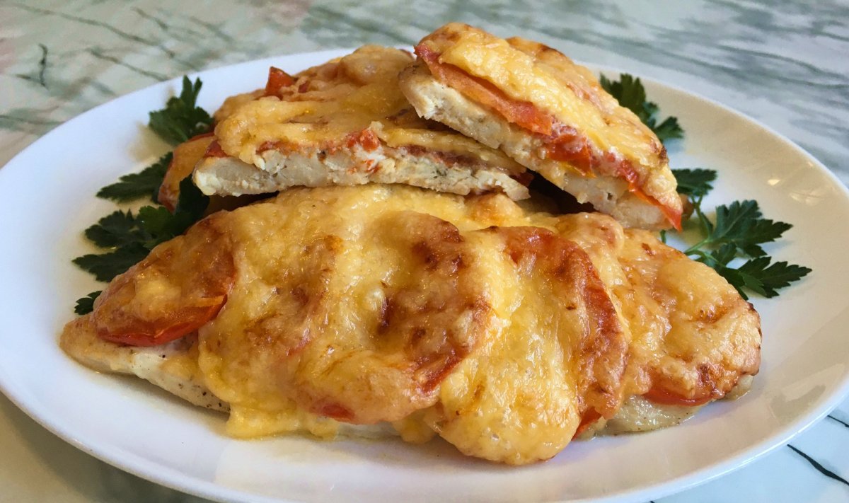 Мясо по-французски в духовке из куриного филе с помидорами и сыром