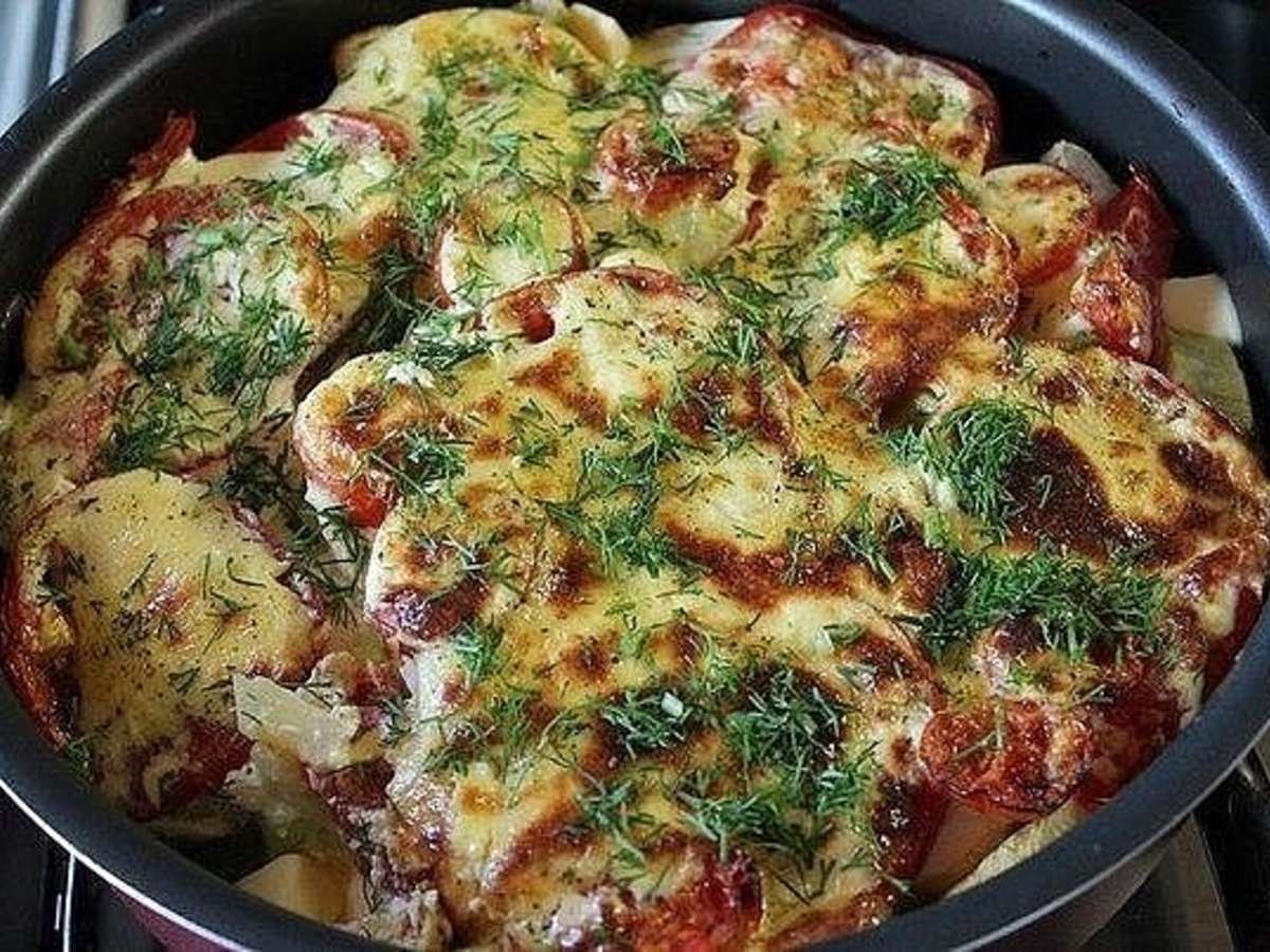 Запеканка из макарон в духовке с курицей и сыром и помидорами