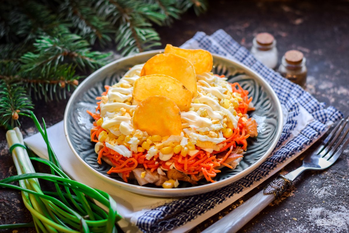 Салат Ромашка с чипсами и корейской