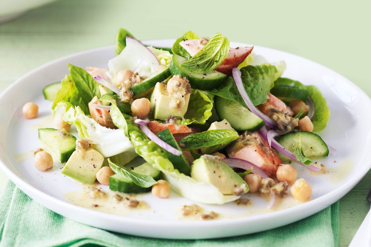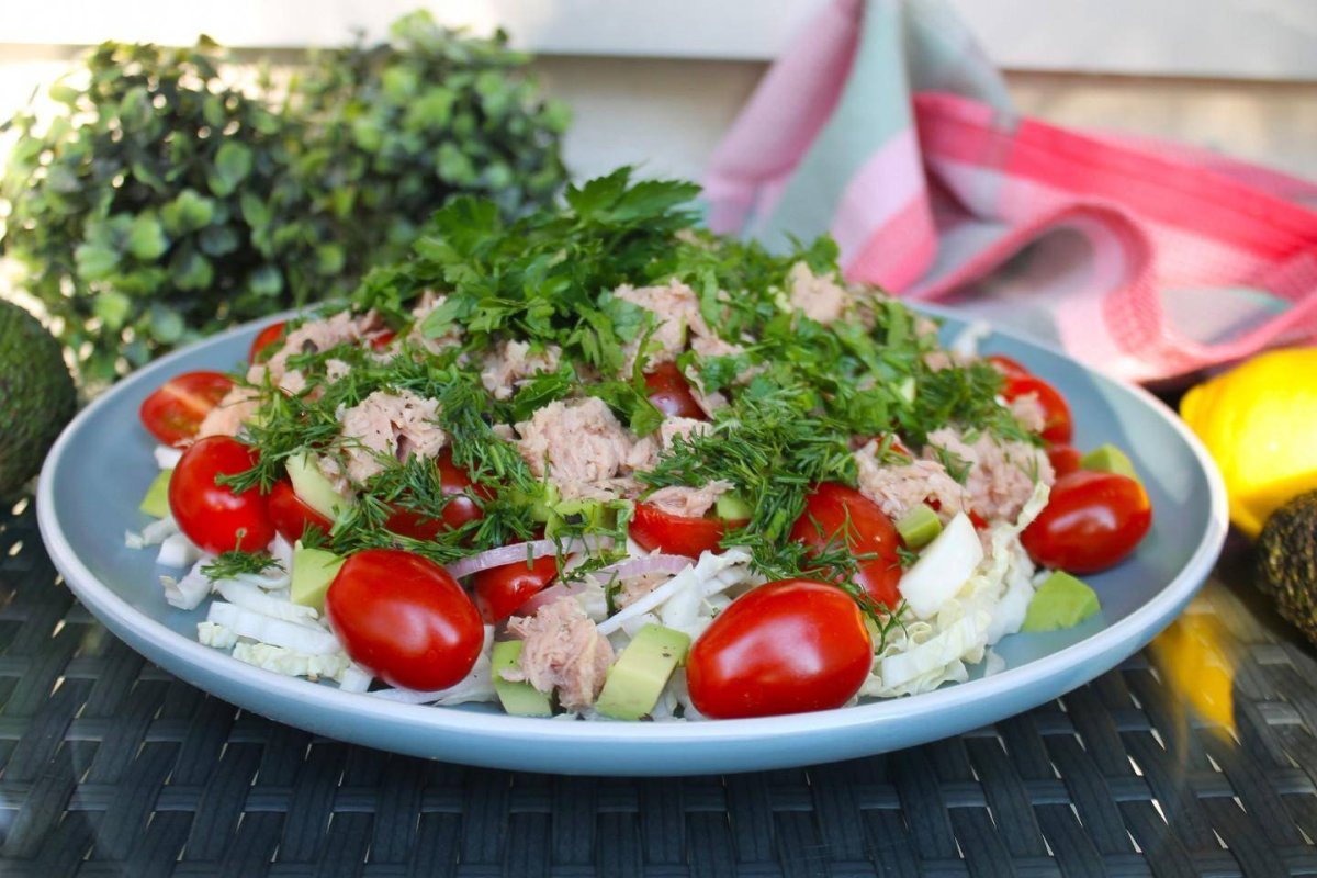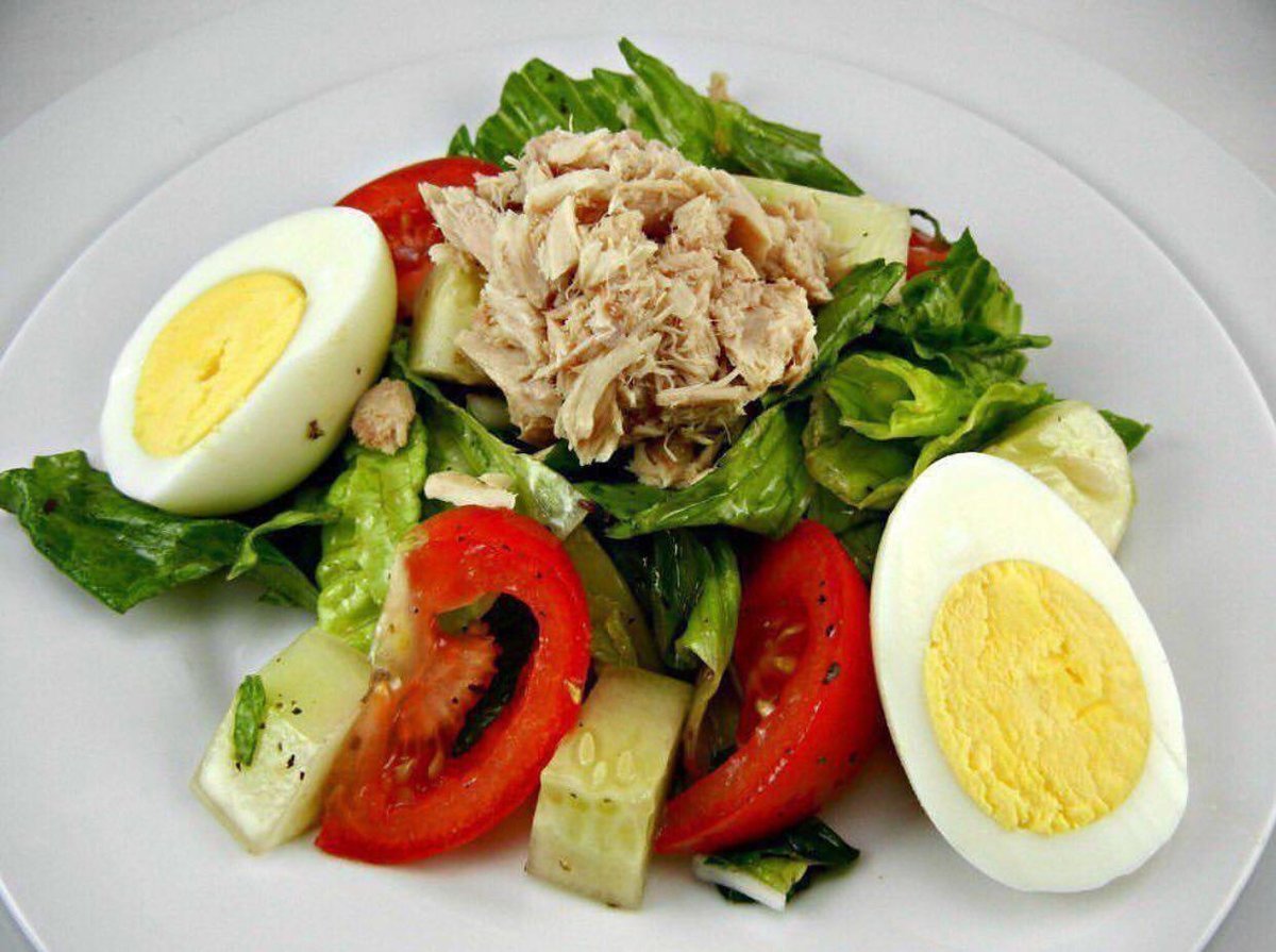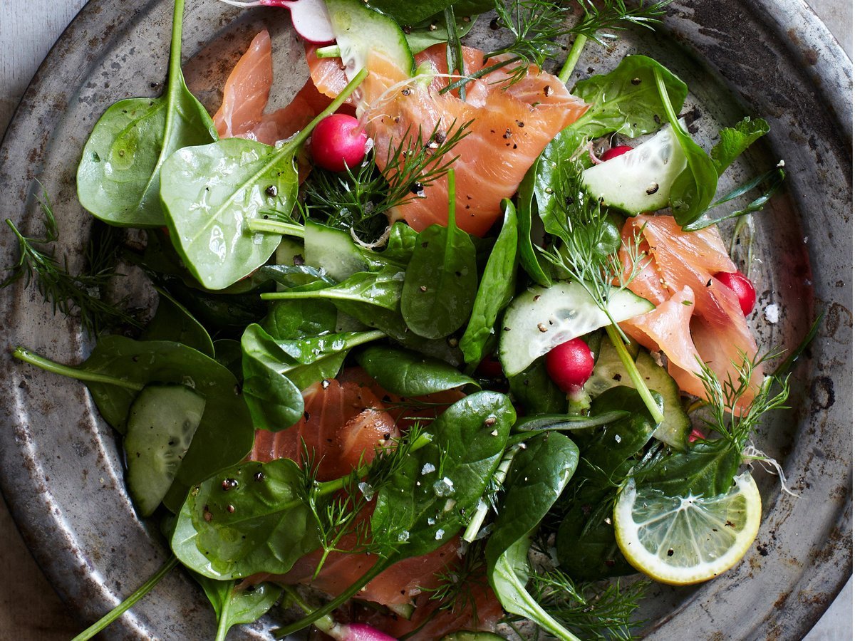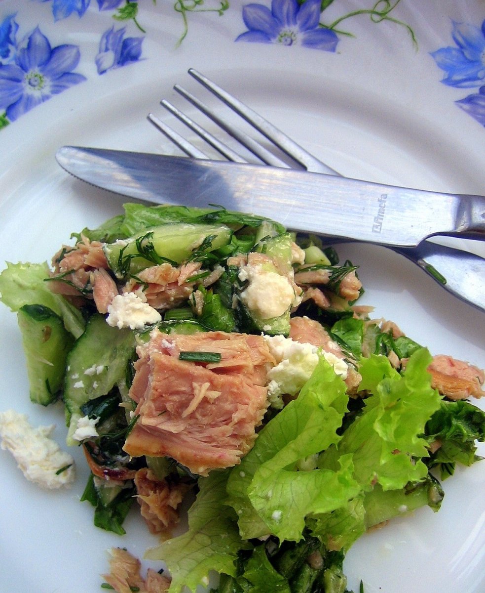 Салат с авокадо и красной рыбой и огурцом и яйцом