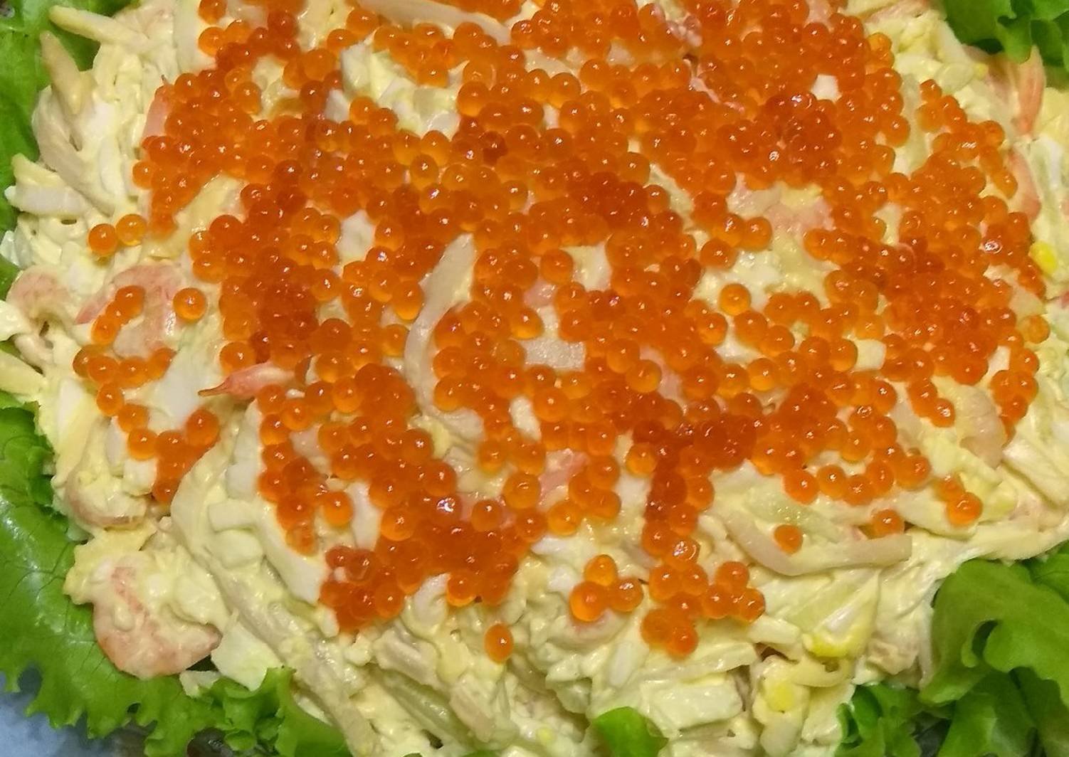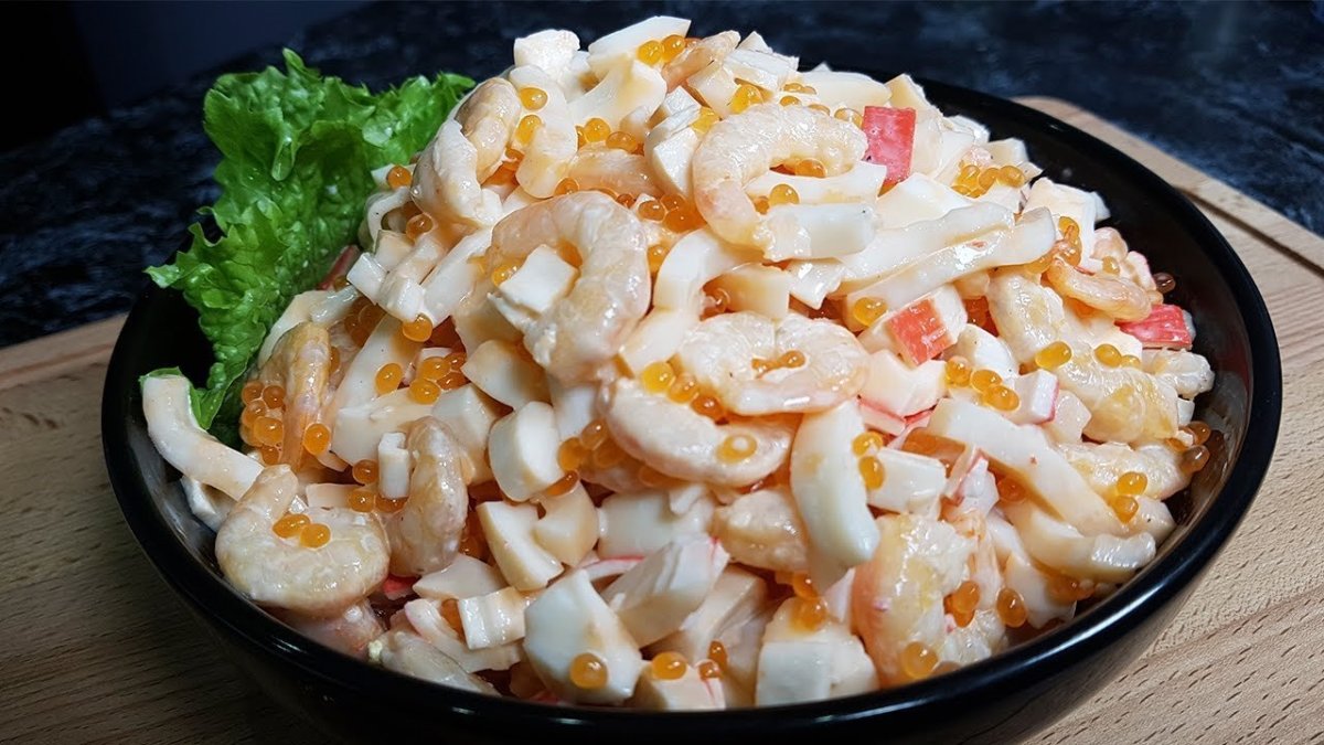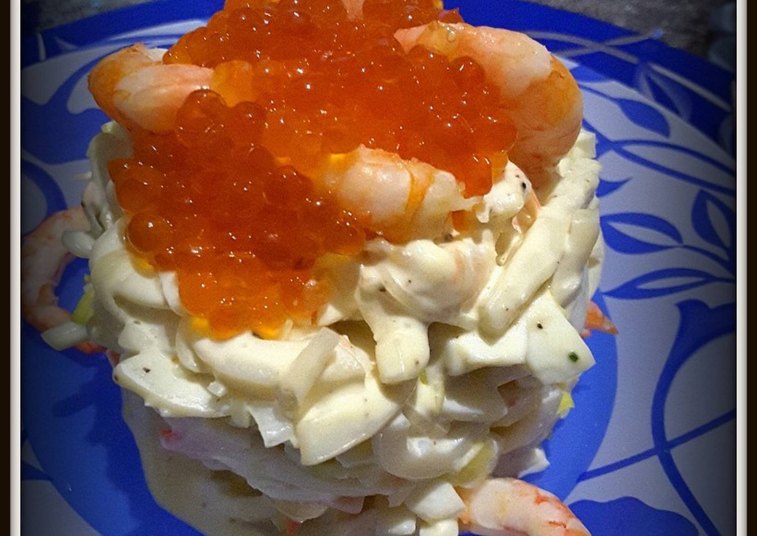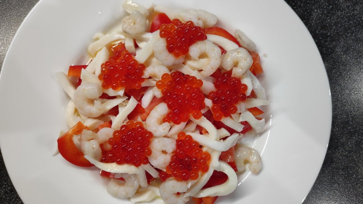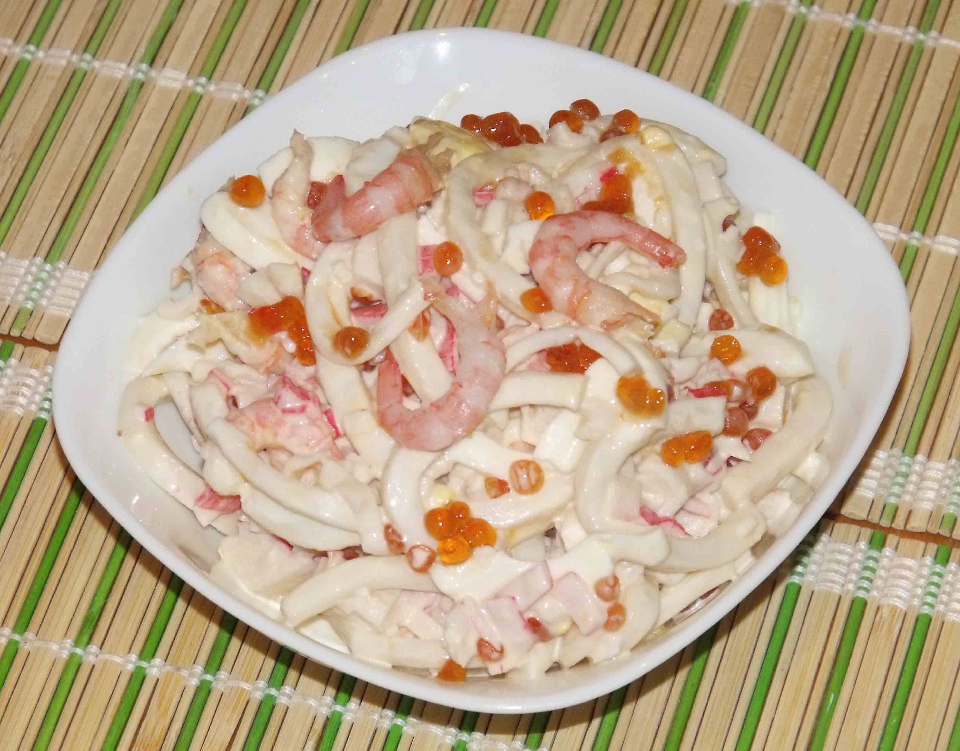 Салат морской с креветками и кальмарами и крабовыми палочками и икрой