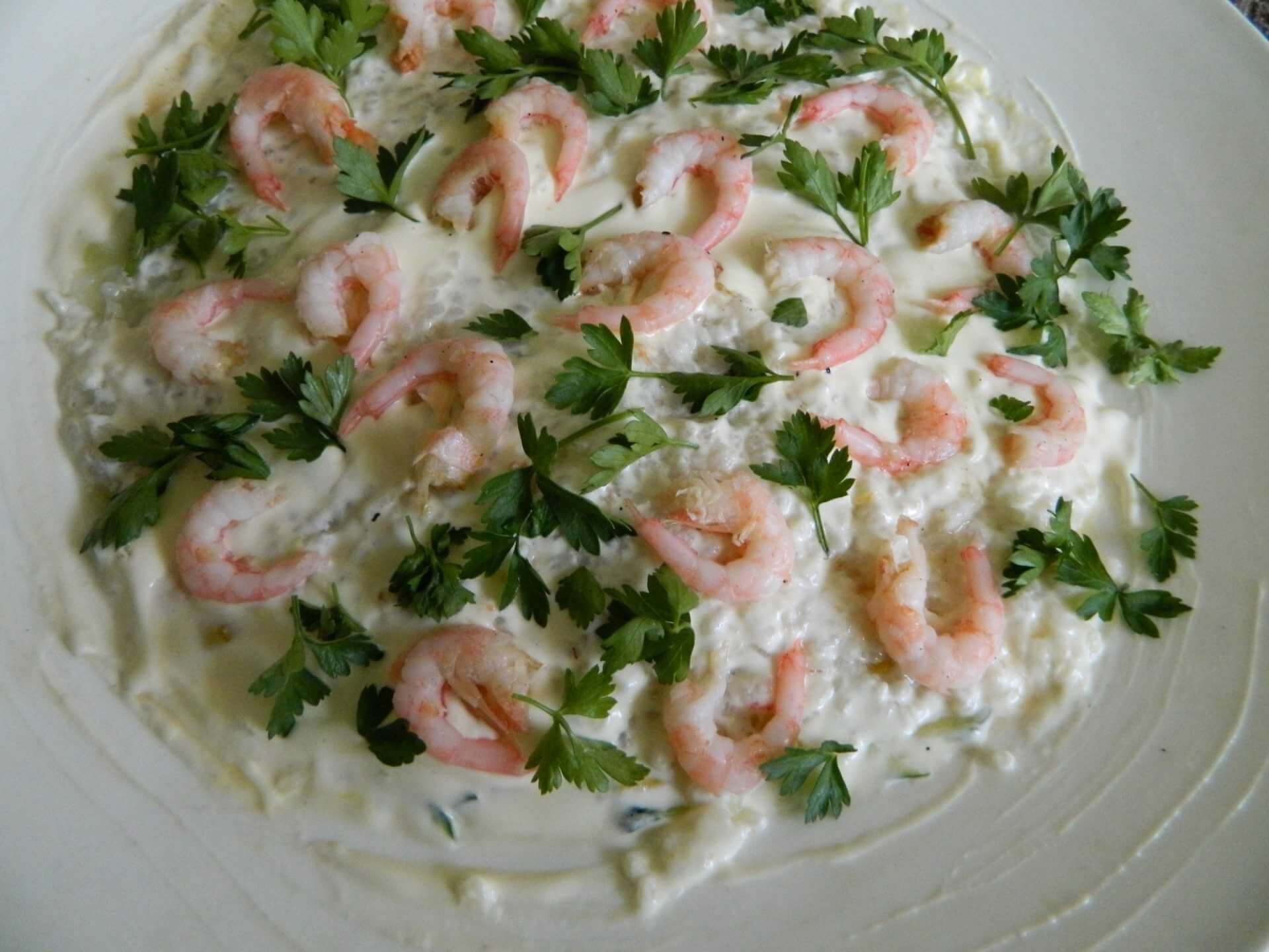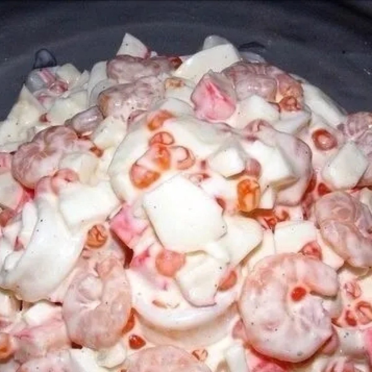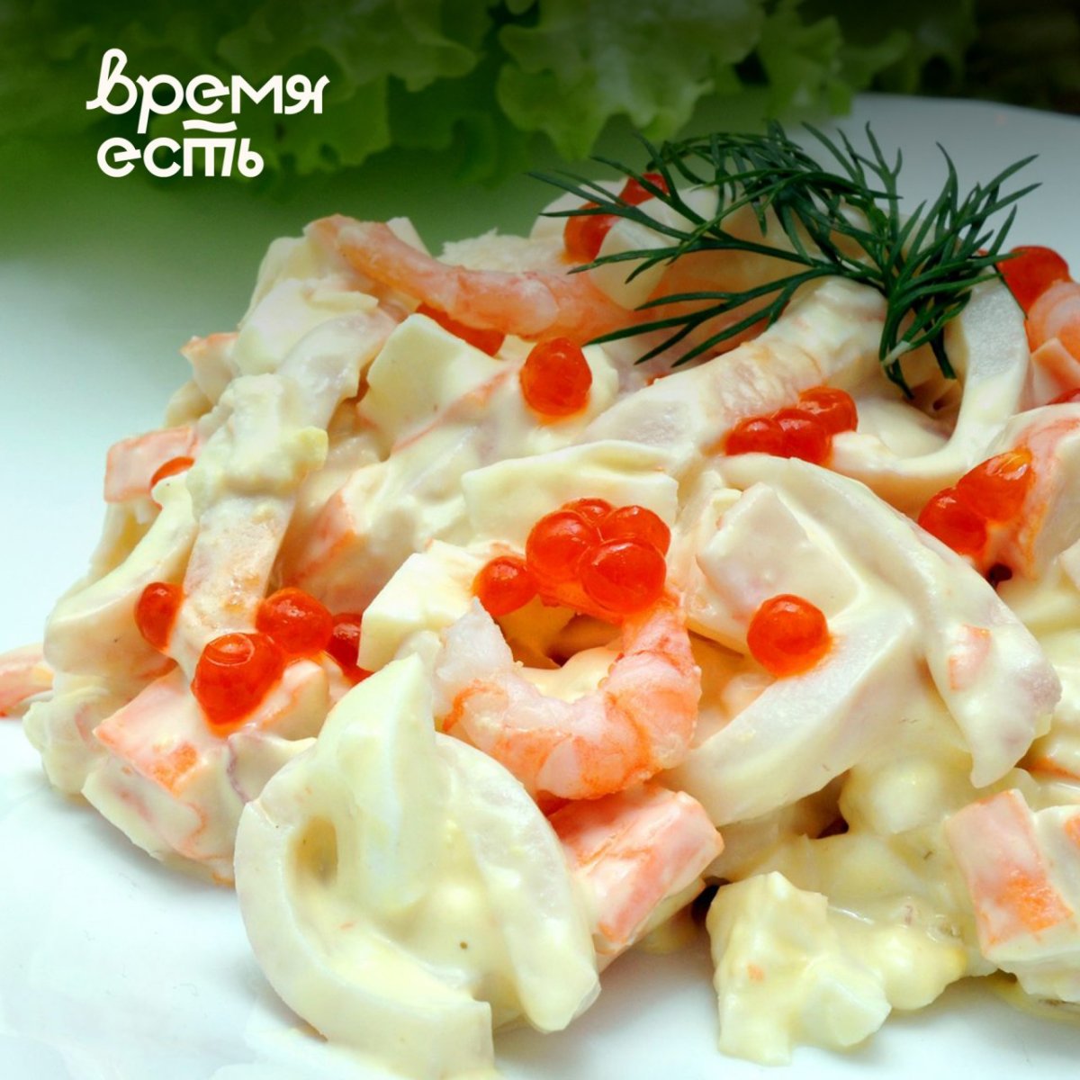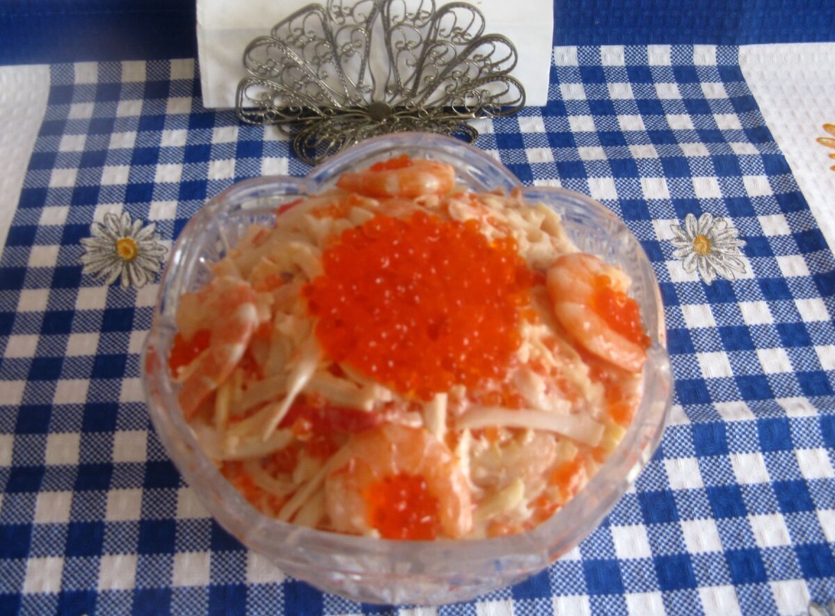 Салат морской с креветками и кальмарами и крабовыми палочками и икрой