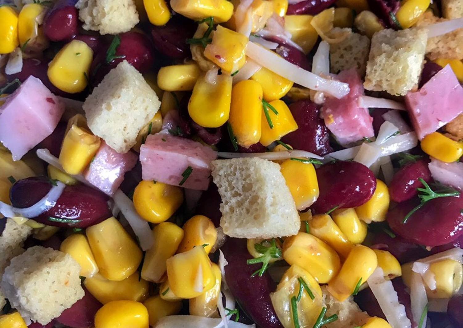 Салат с фасолью и сухариками и колбасой и кукурузой