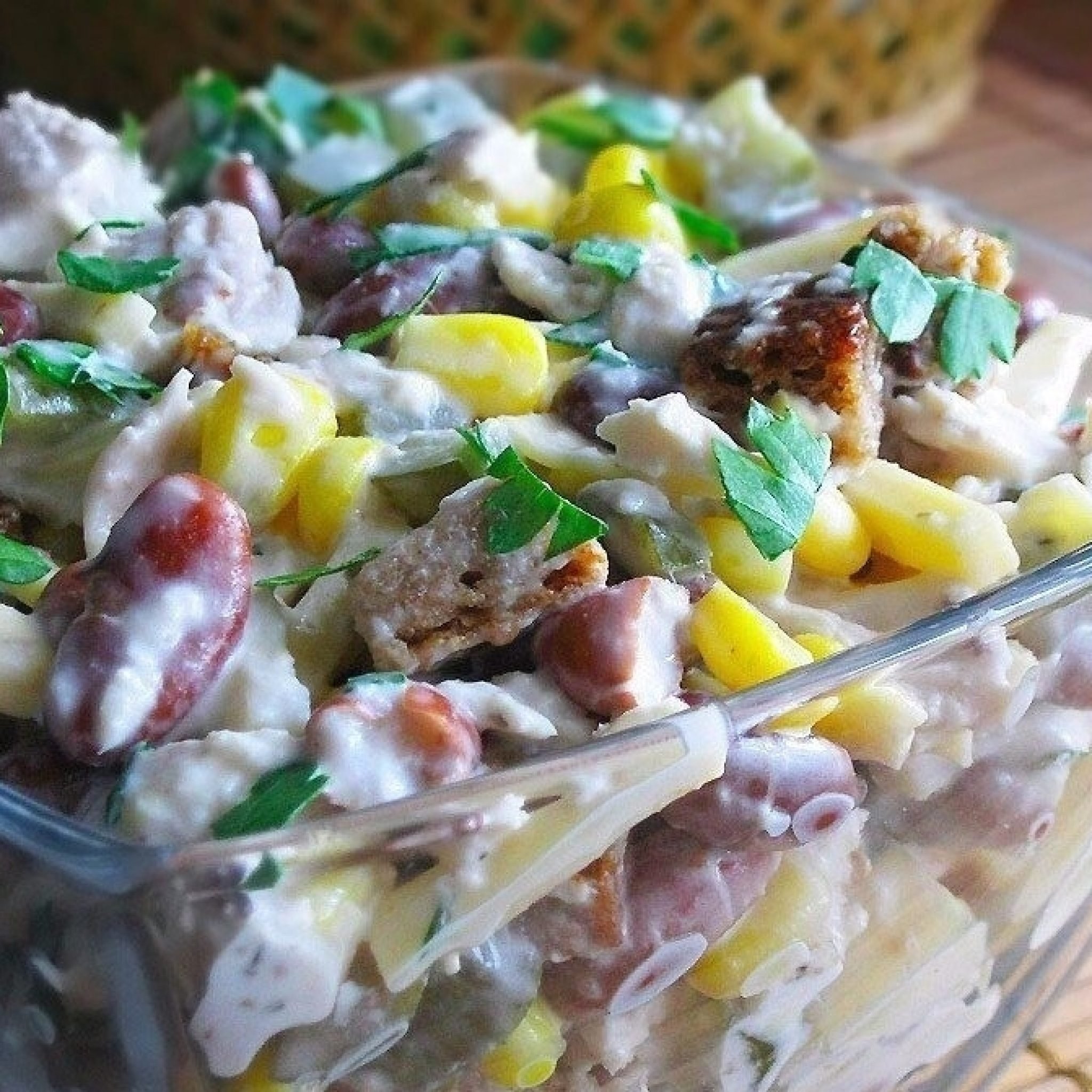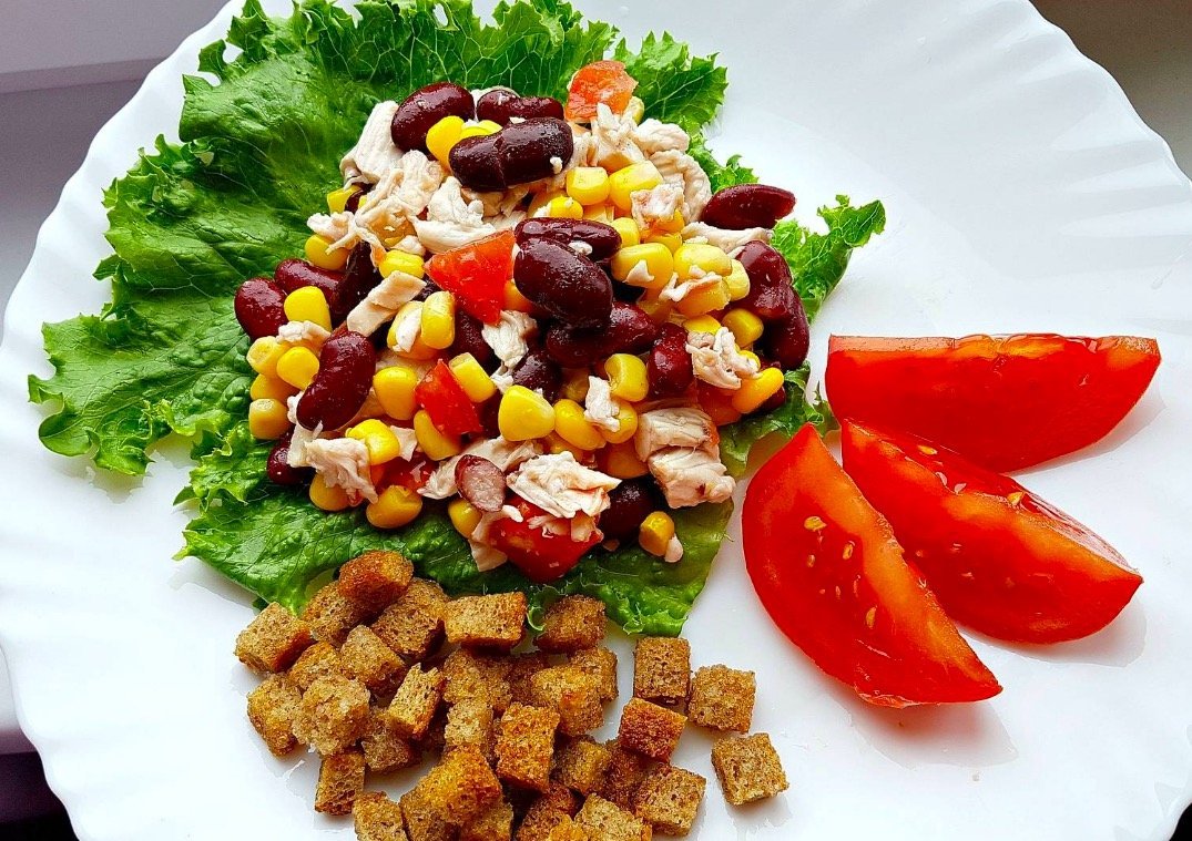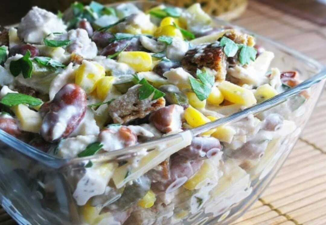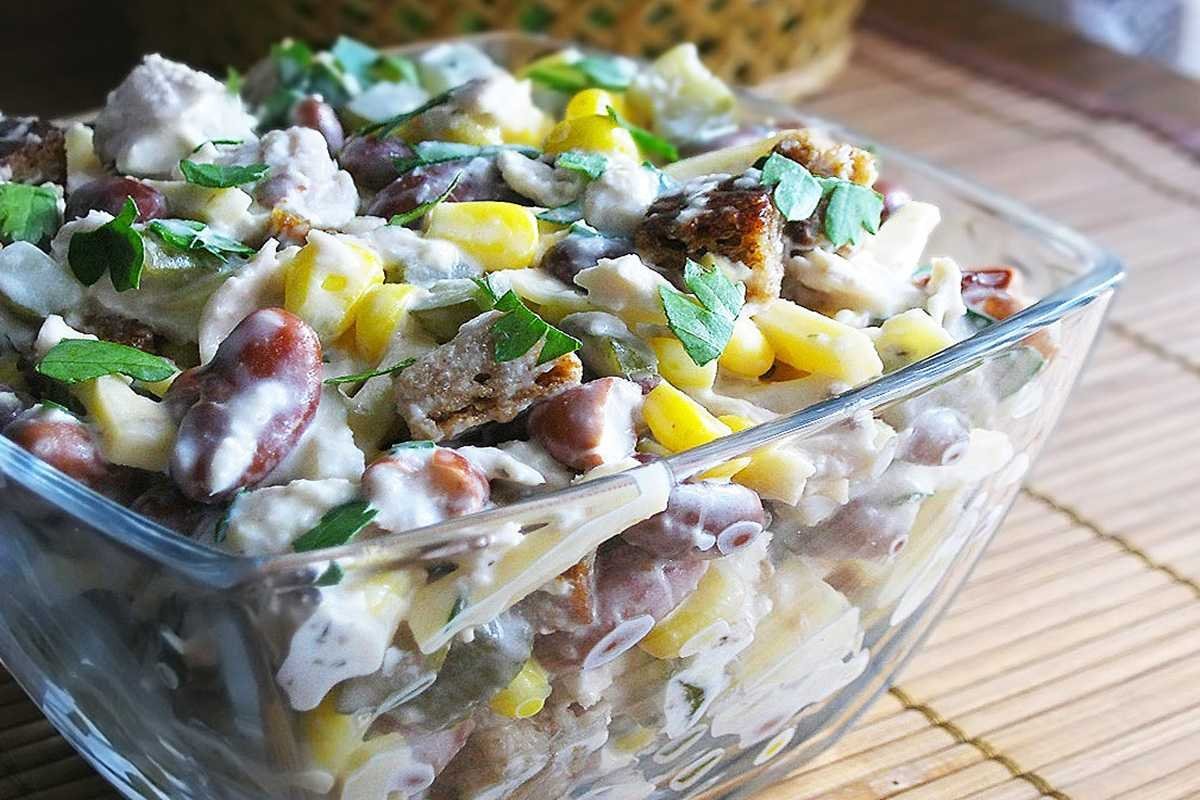 Салат с фасолью и сухариками и кукурузой и курицей