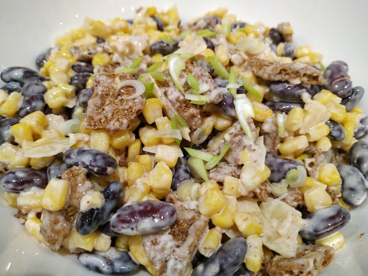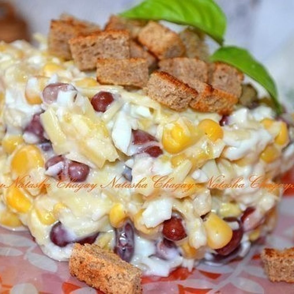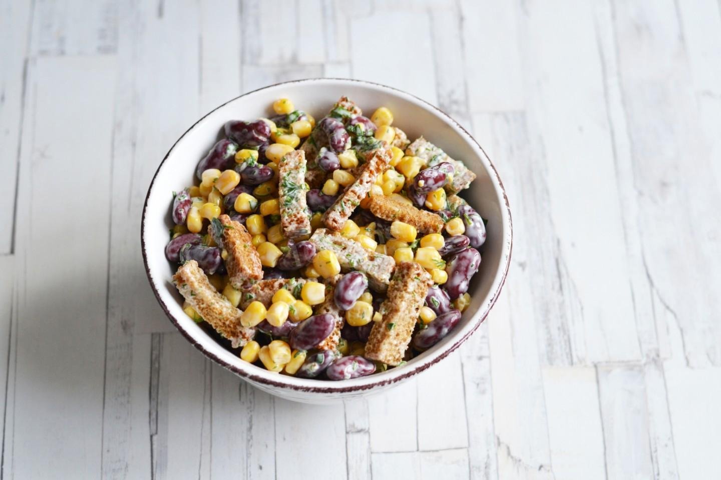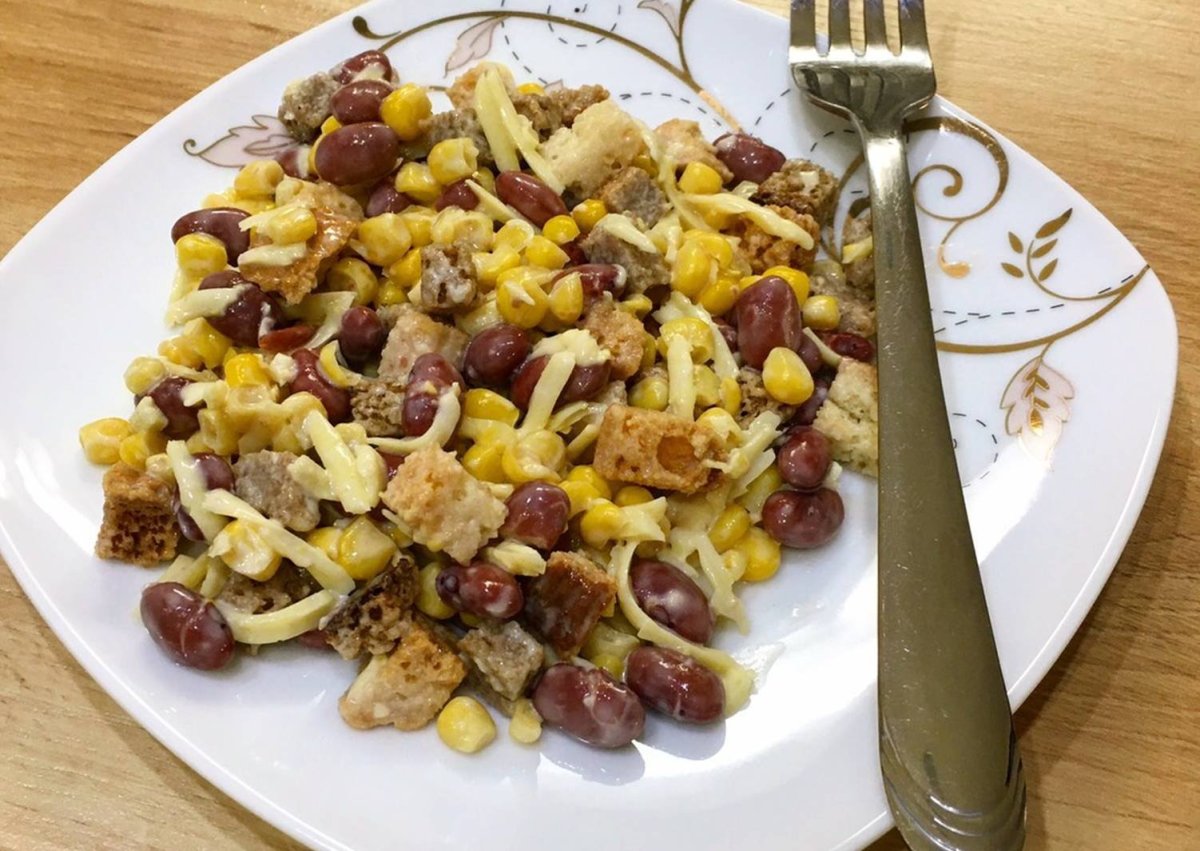 Салат с фасолью и сухариками и кукурузой