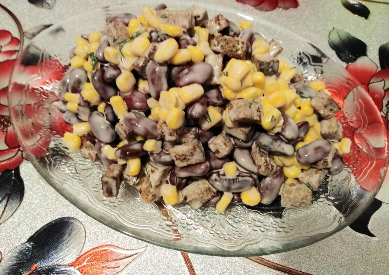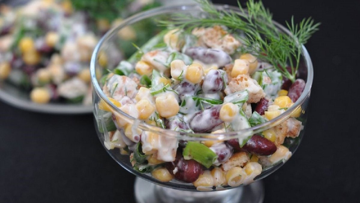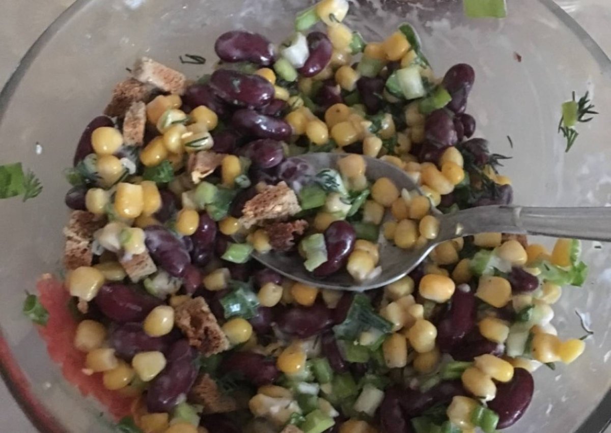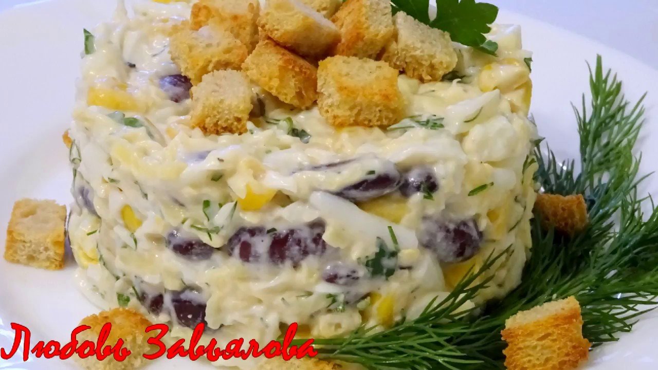 Салат с фасолью и сухариками и кукурузой