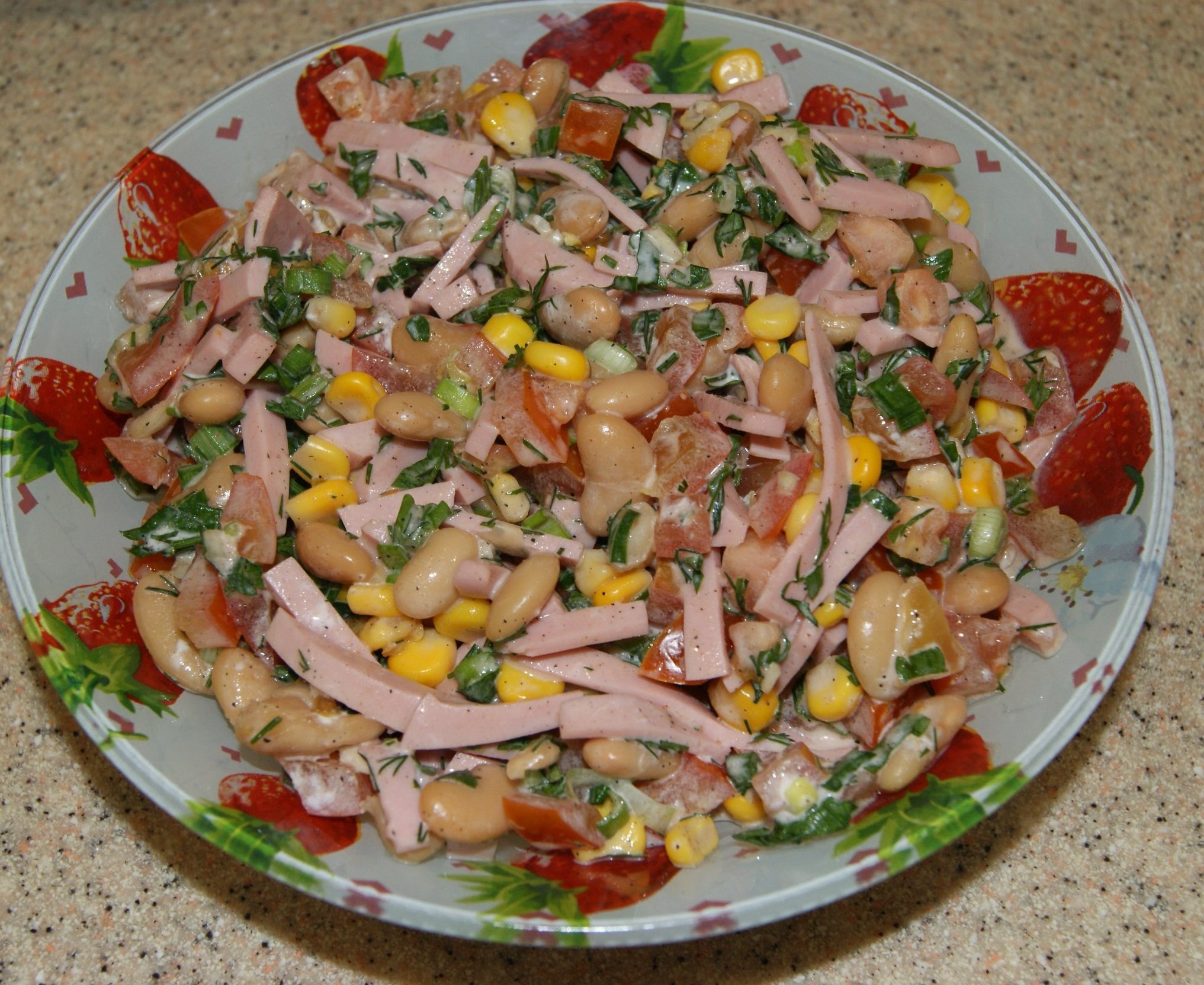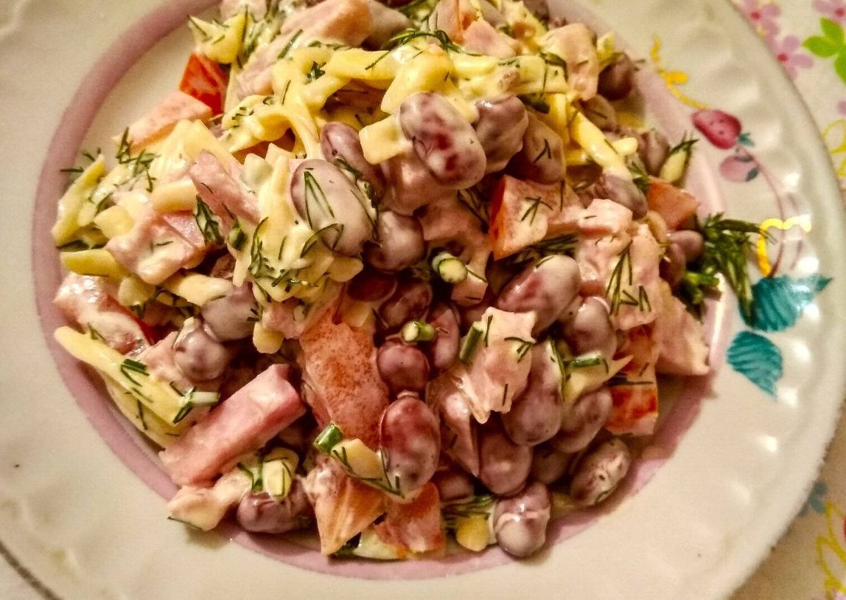 Салат с фасолью и копченой колбасой