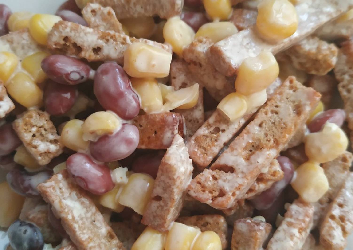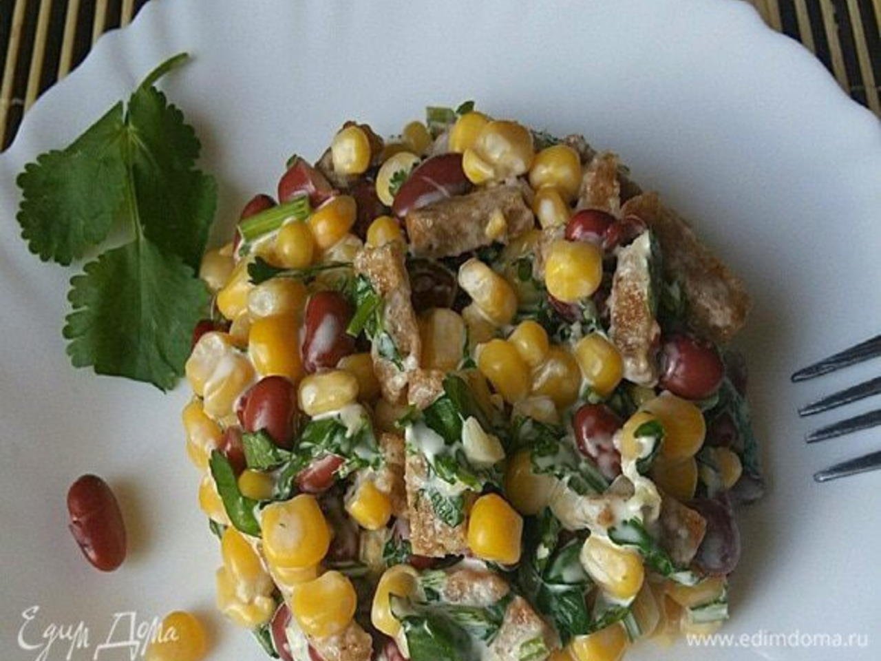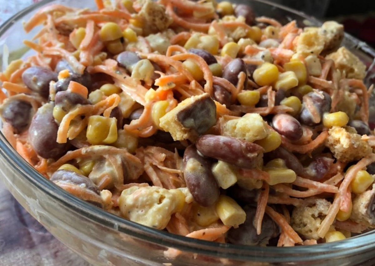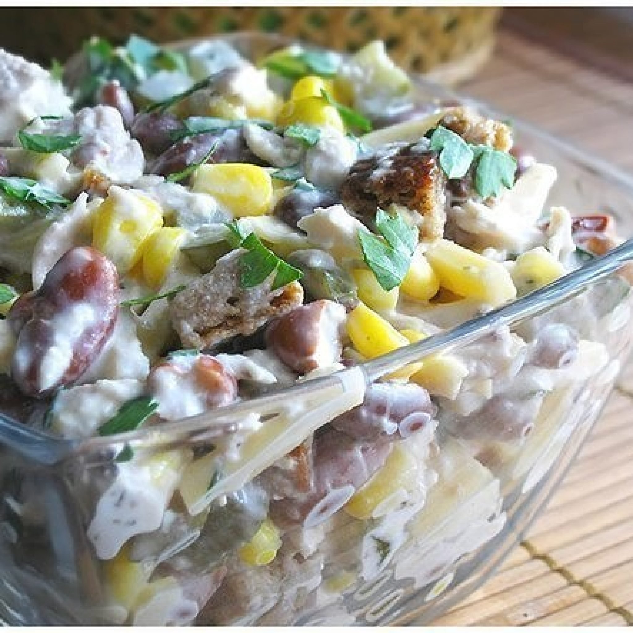 Салат с красной фасолью и кукурузой с сухариками