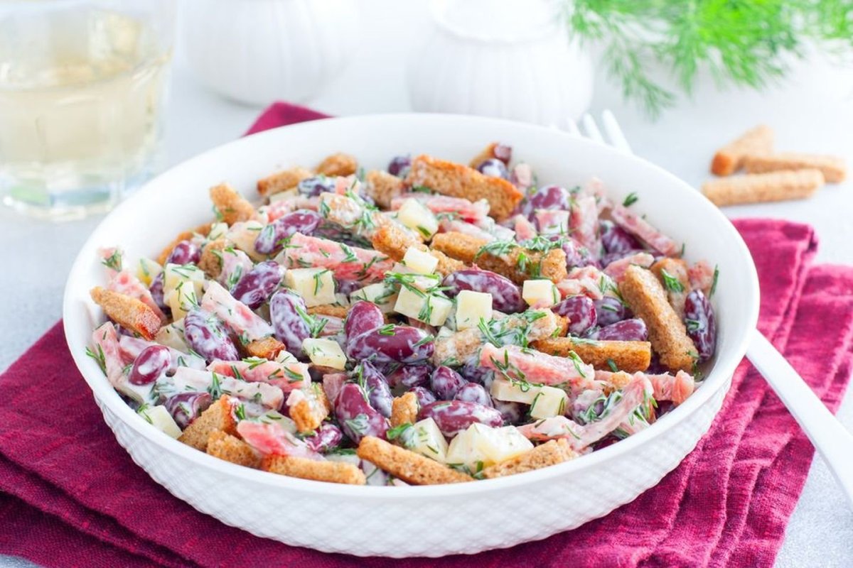 Салат с ветчиной и фасолью и сухариками