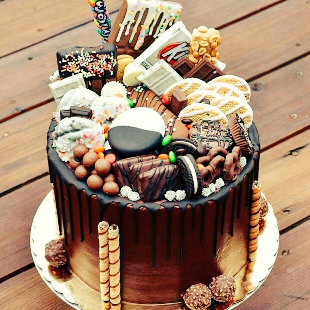 Украшение торта конфетами и шоколадками и печеньем