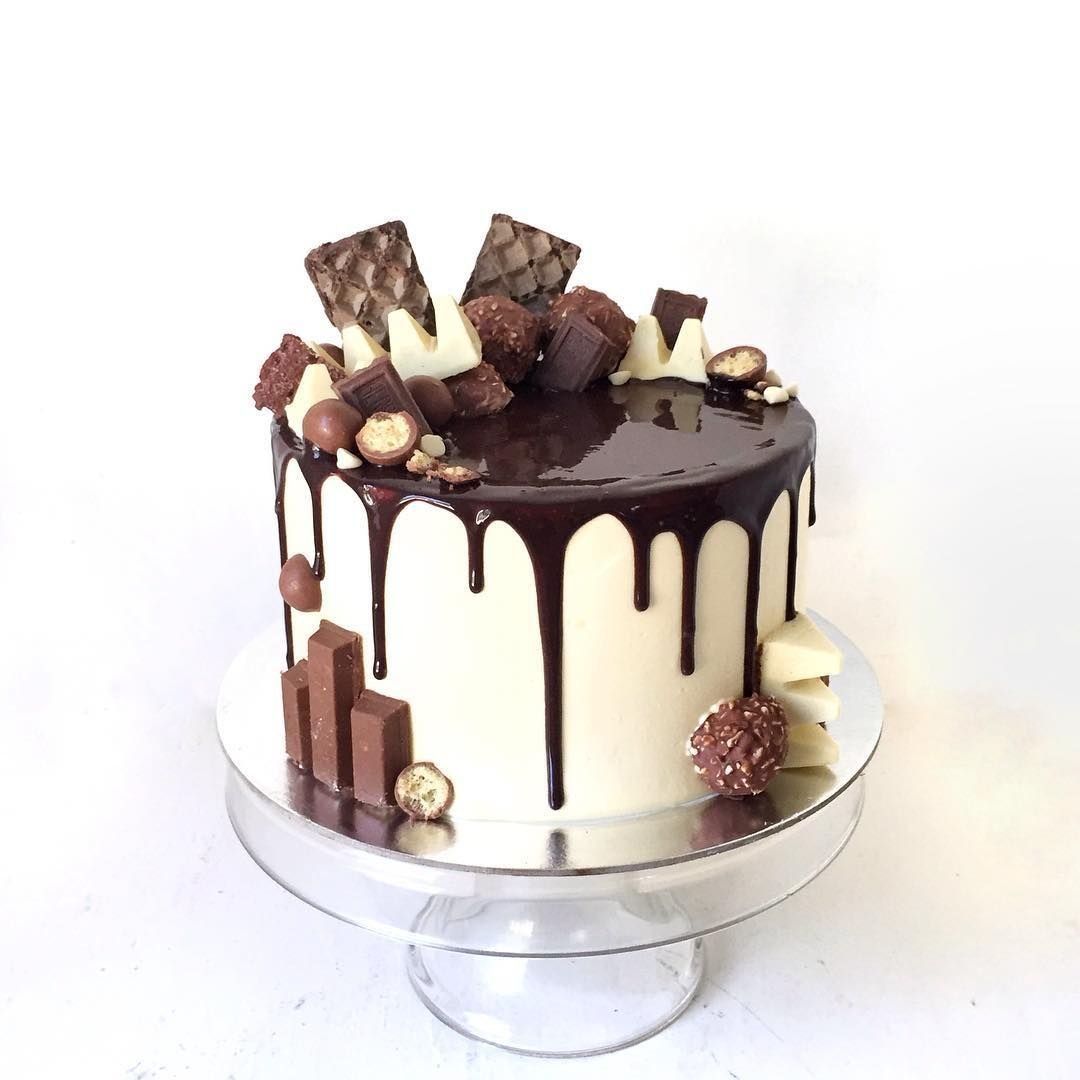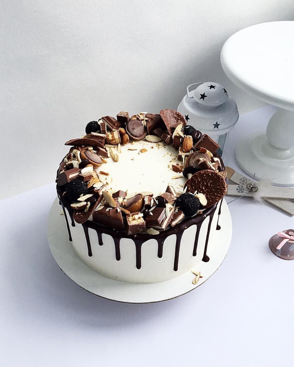 Декор торта с подтеками и конфетами