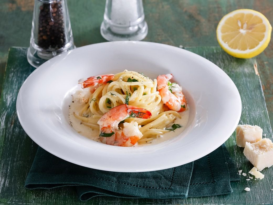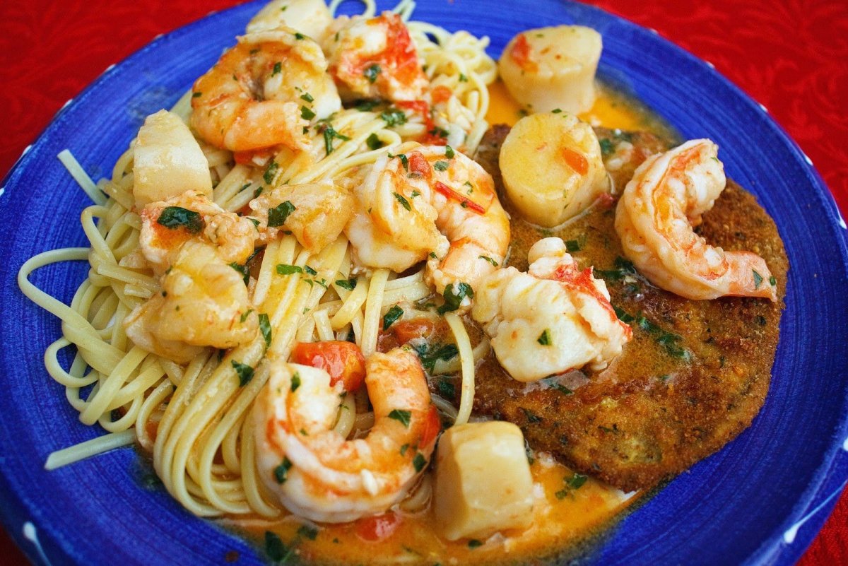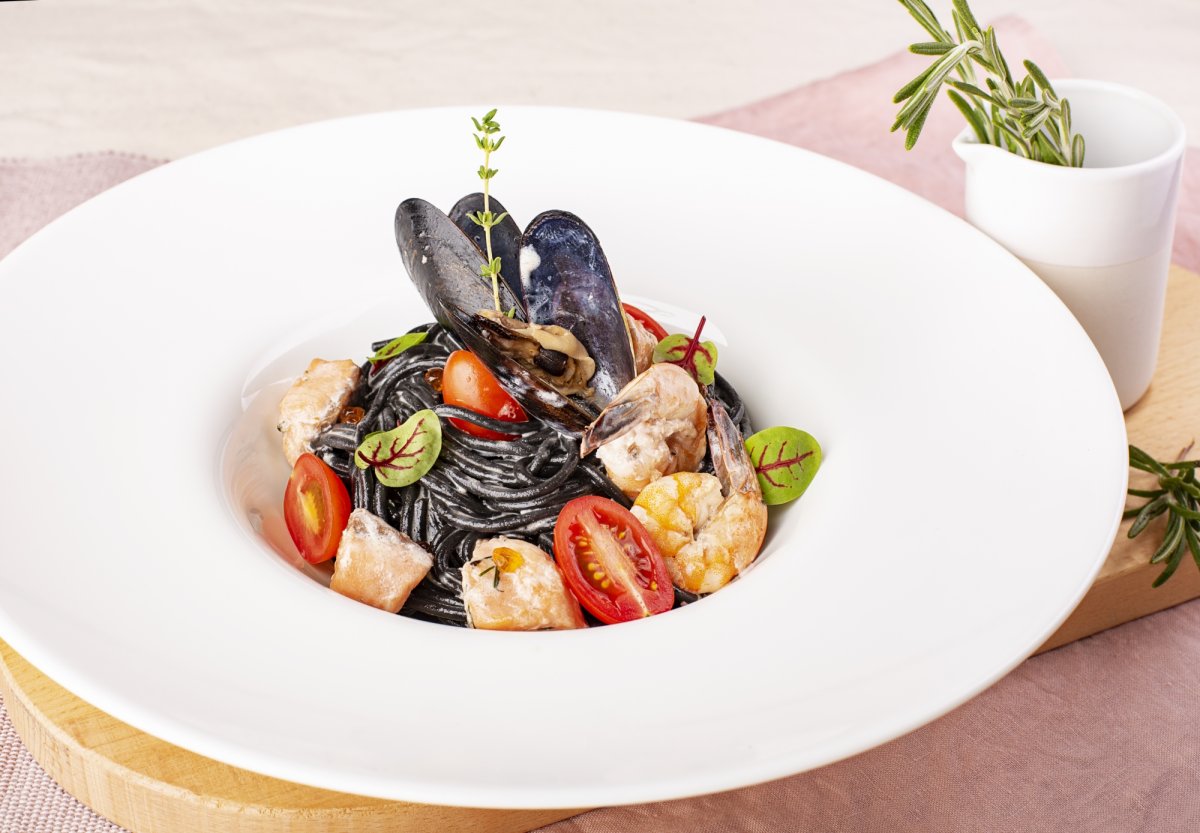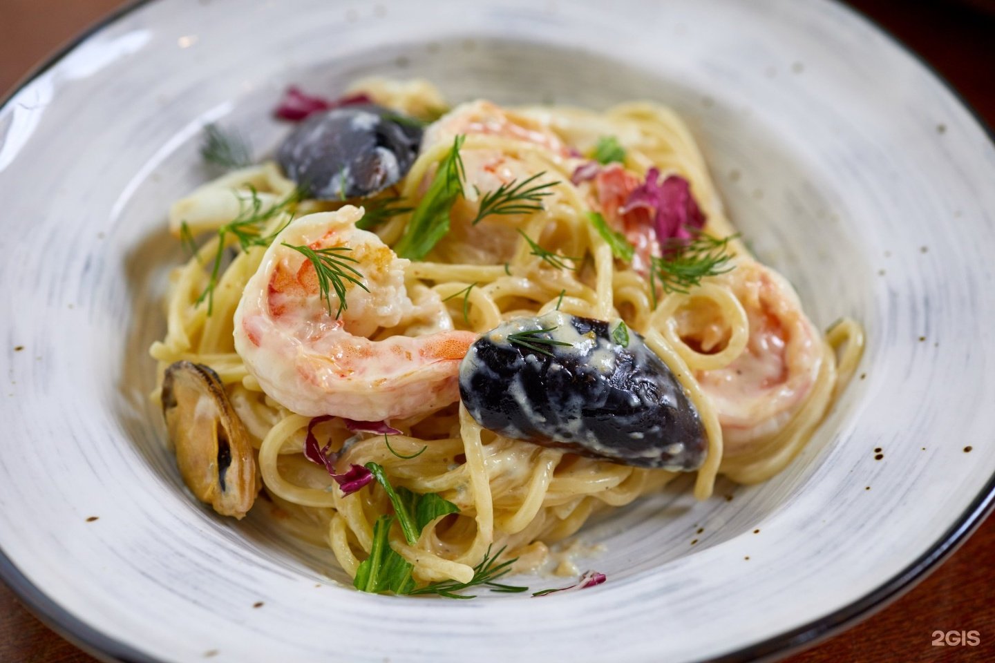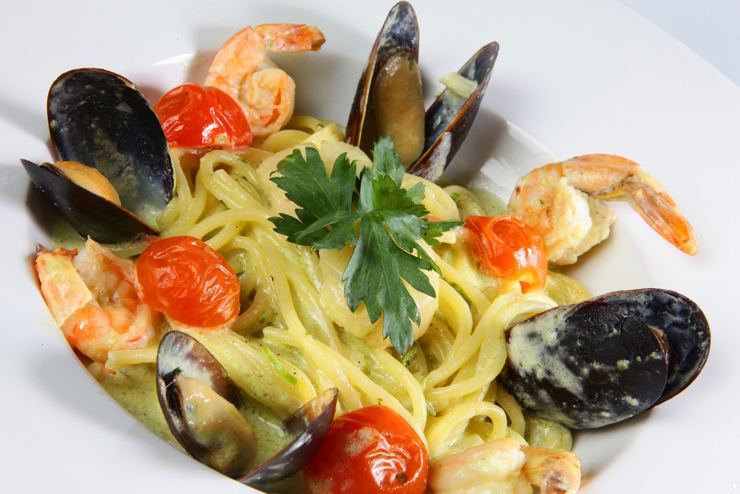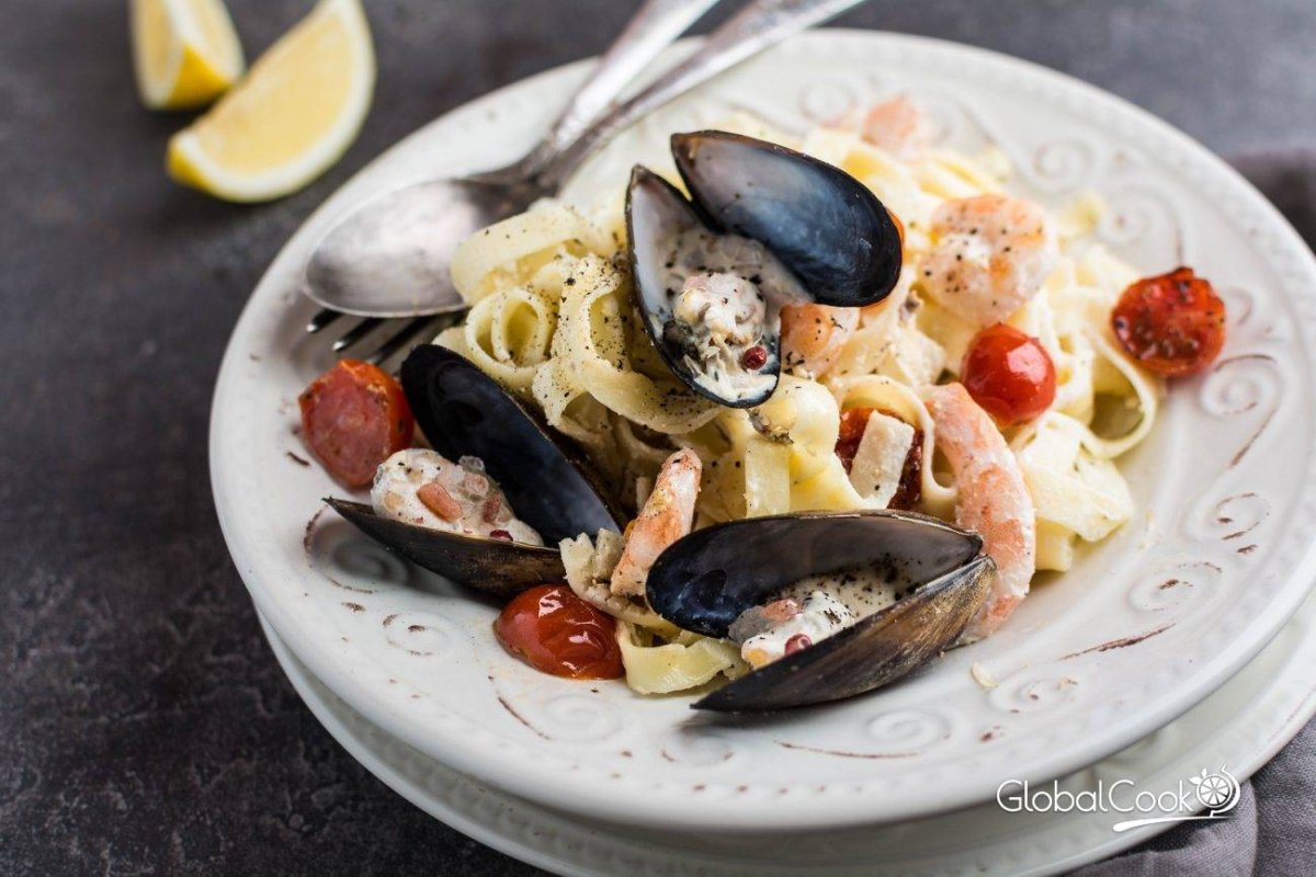 Феттуччине с креветками, кальмарами, мидиями и вонголе