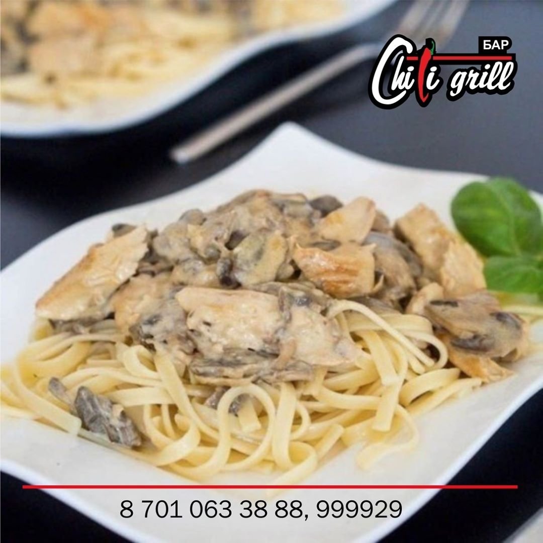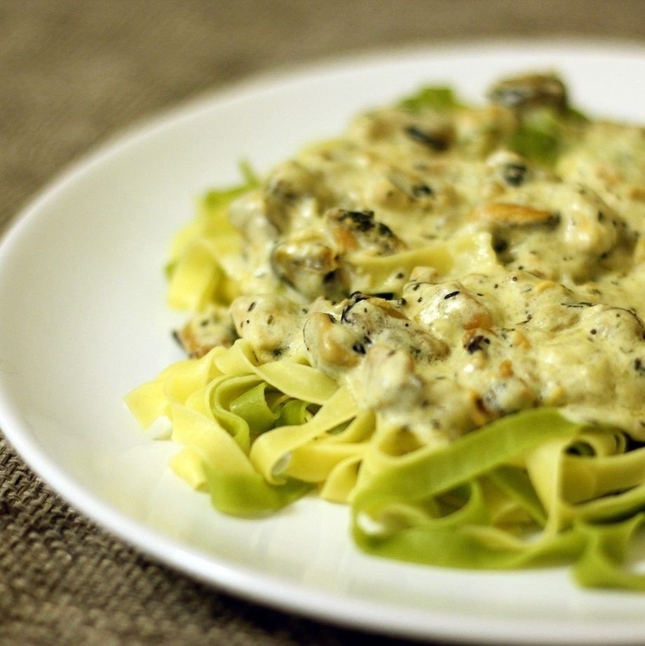 Паста тальятелле с грибами в сливочном соусе с курицей