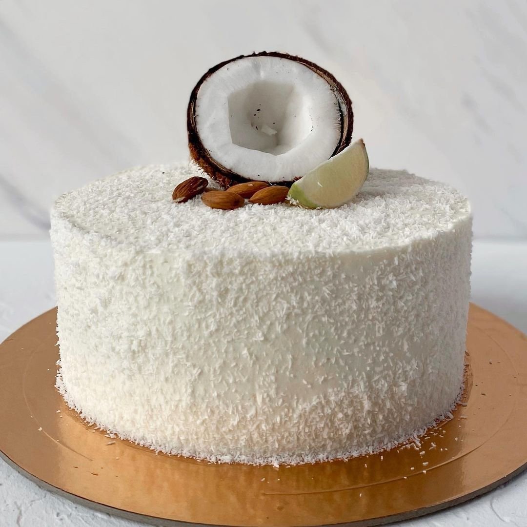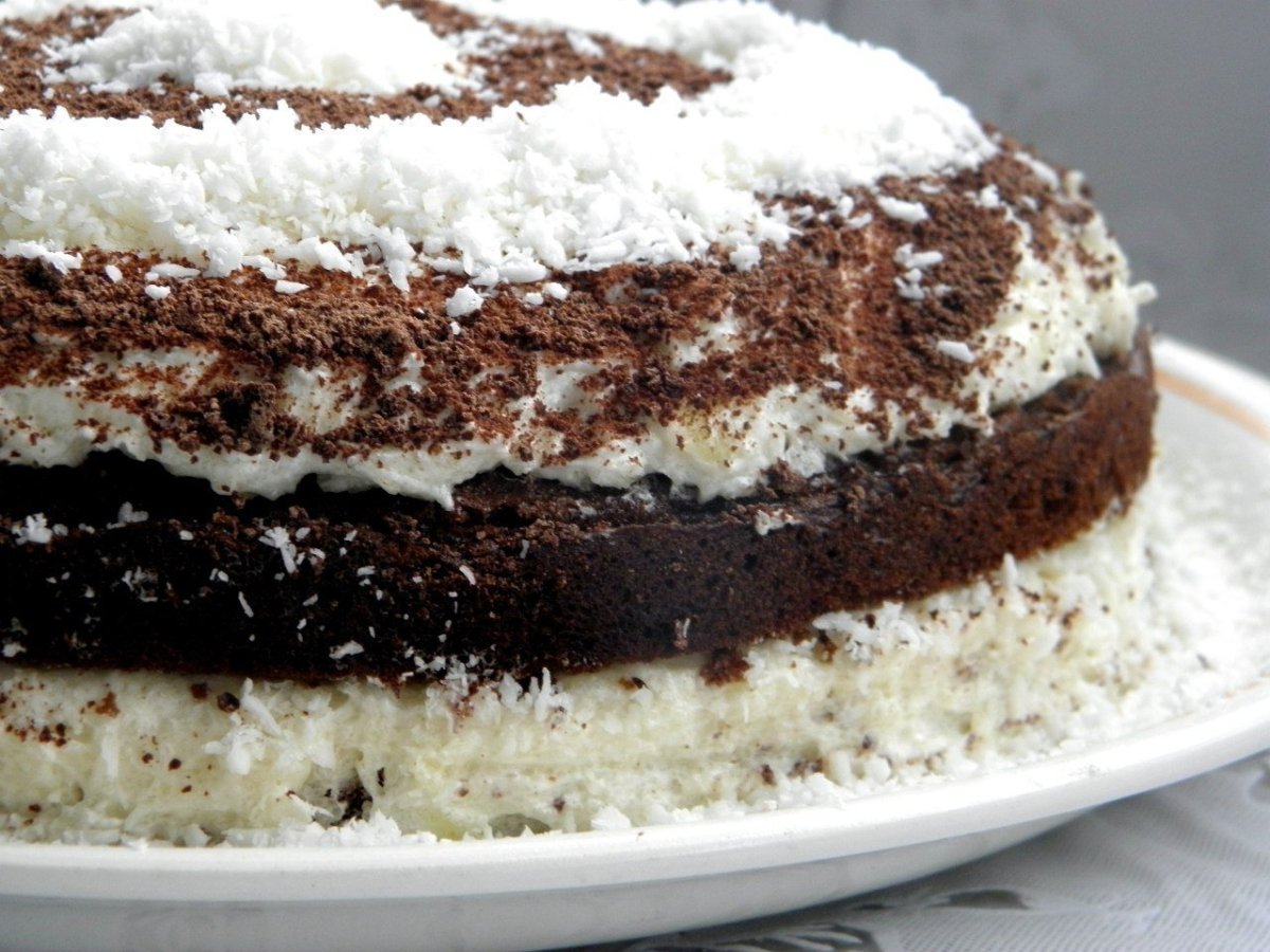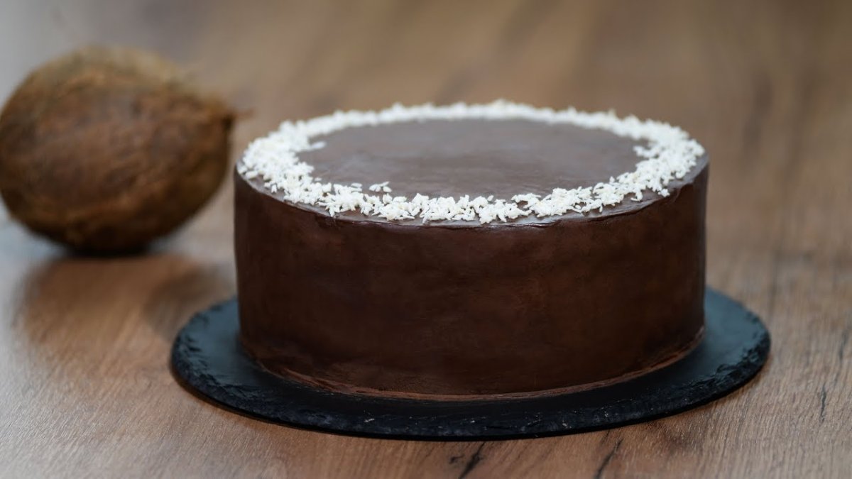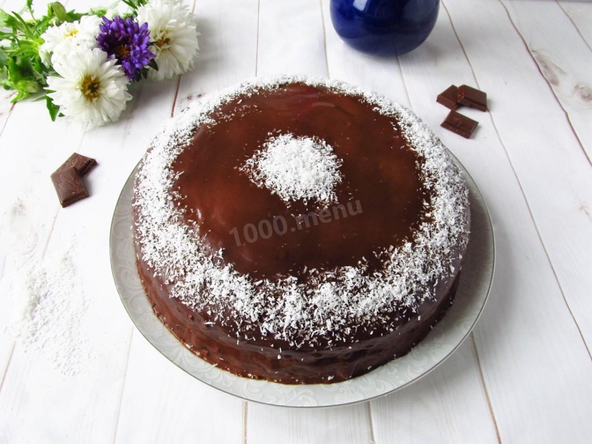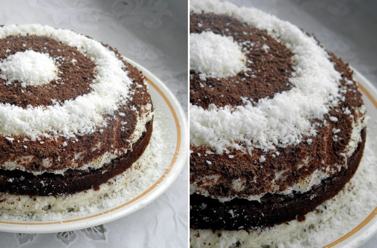 Украшение торта цветной кокосовой стружкой и шоколадом