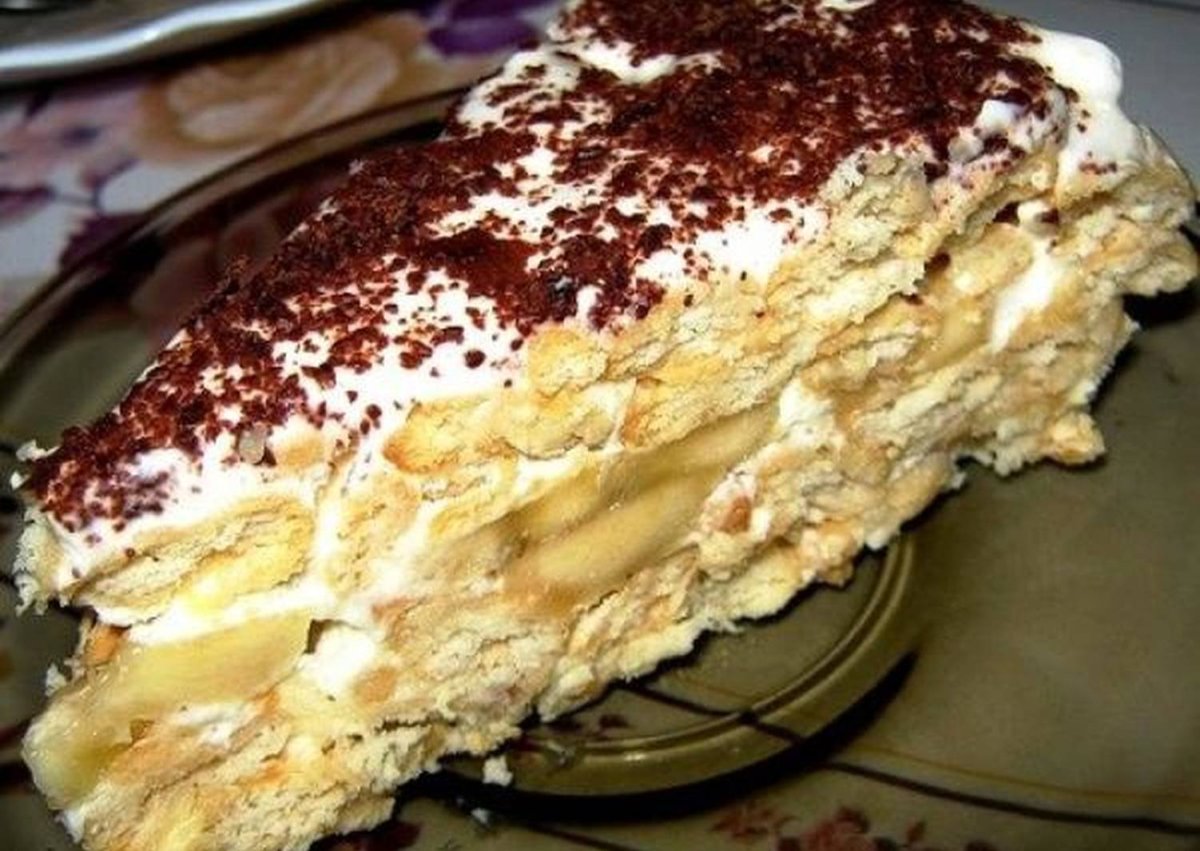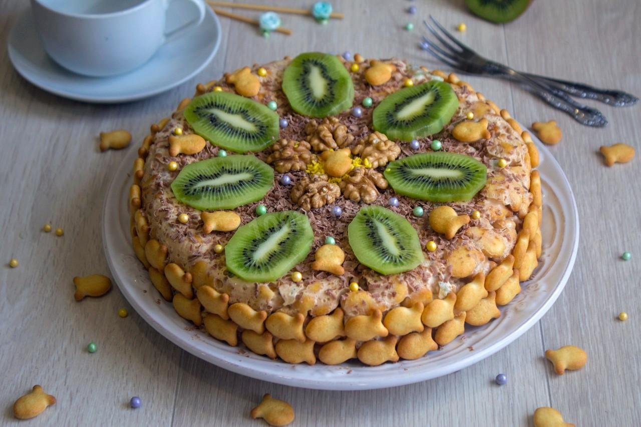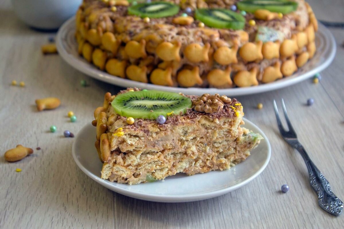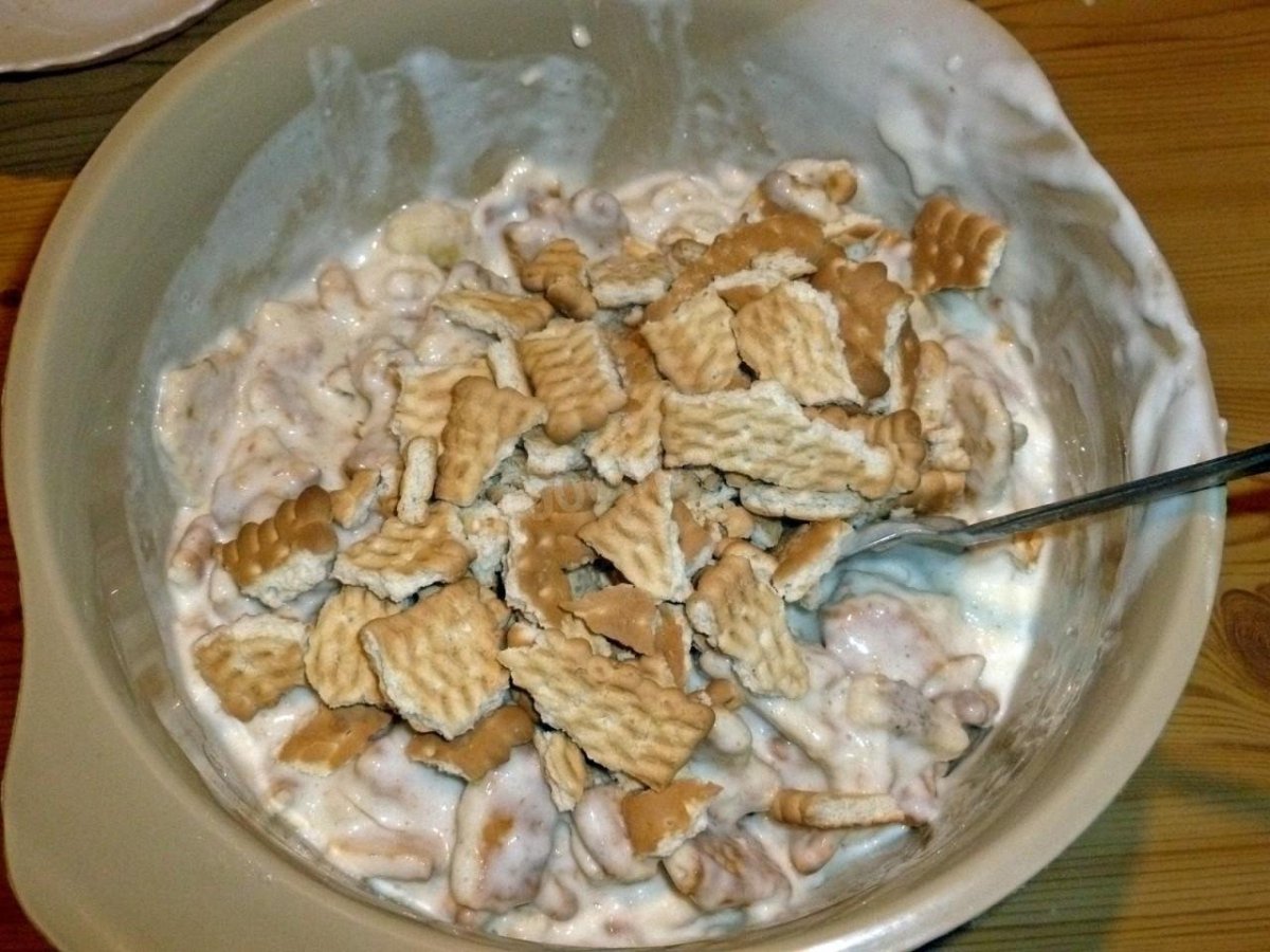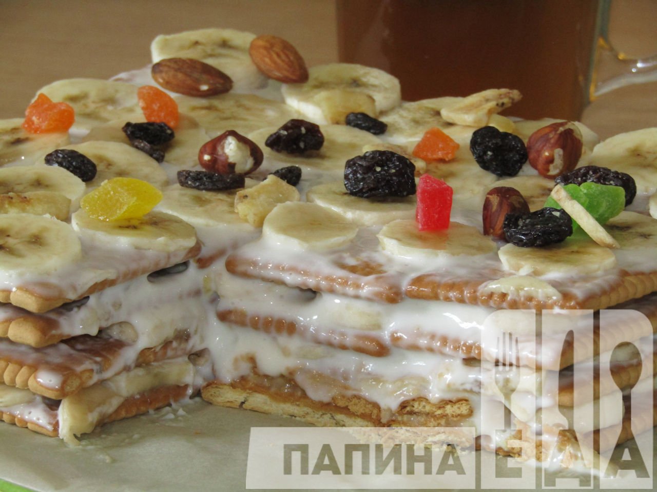 Торт с крекерами рыбки без выпечки со сметаной и бананами