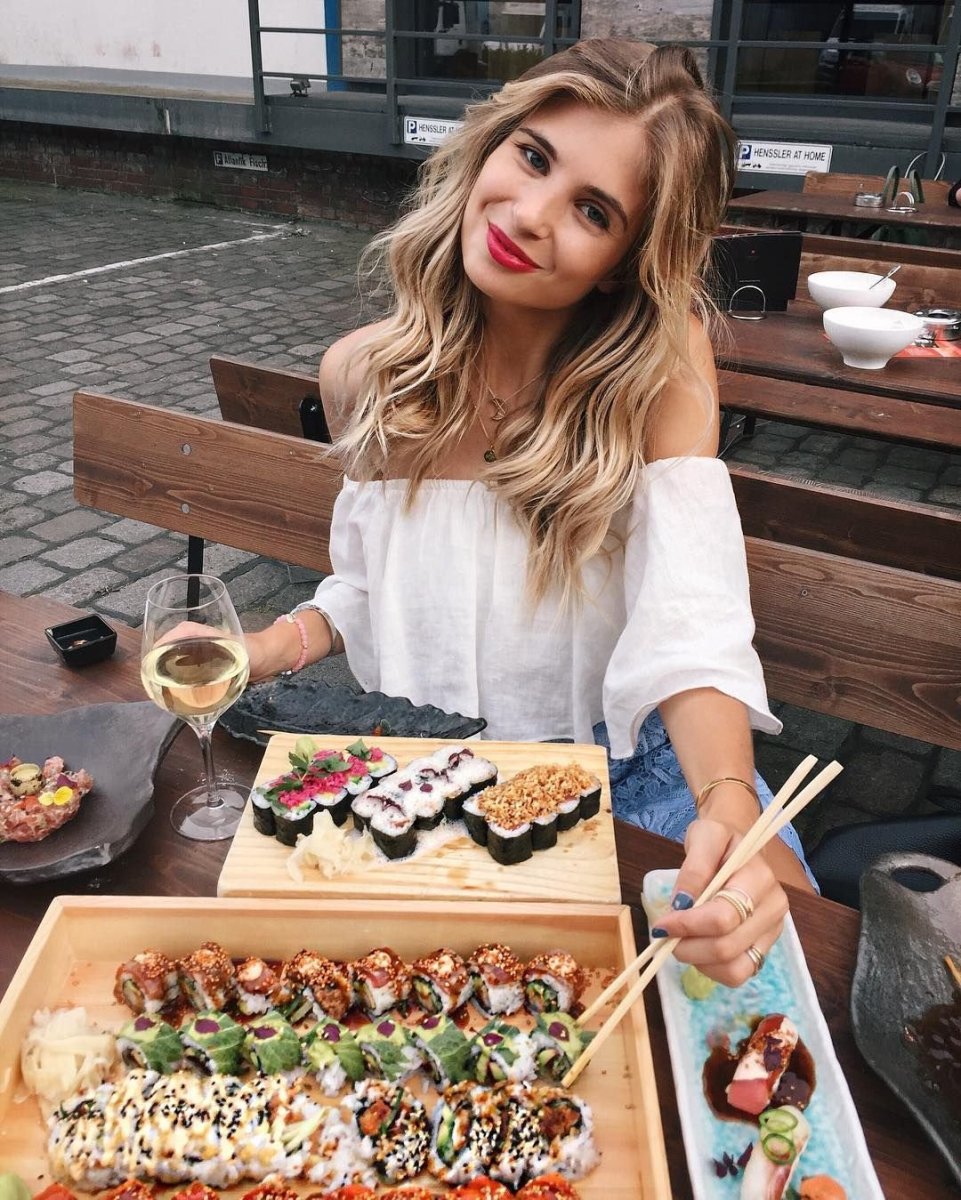 Девушка ест роллы