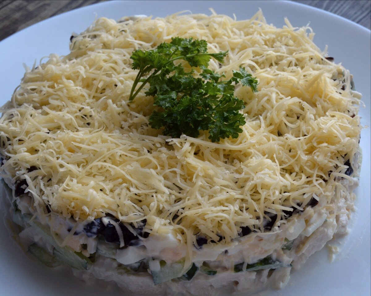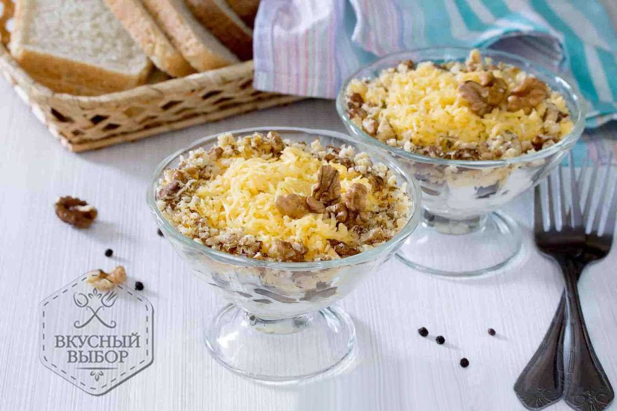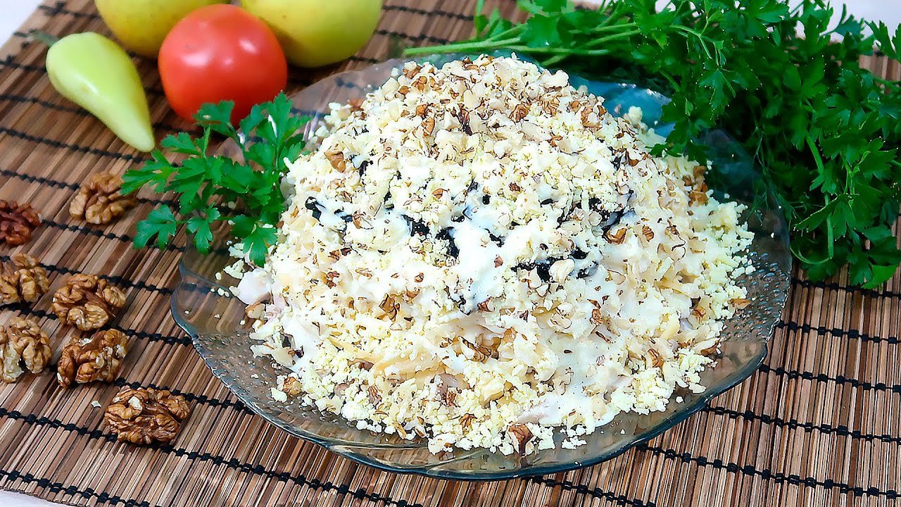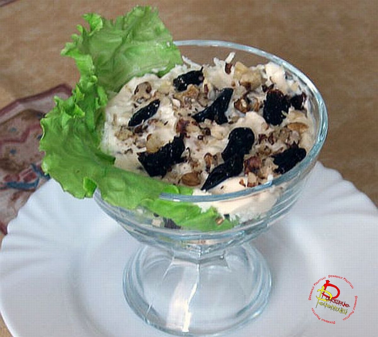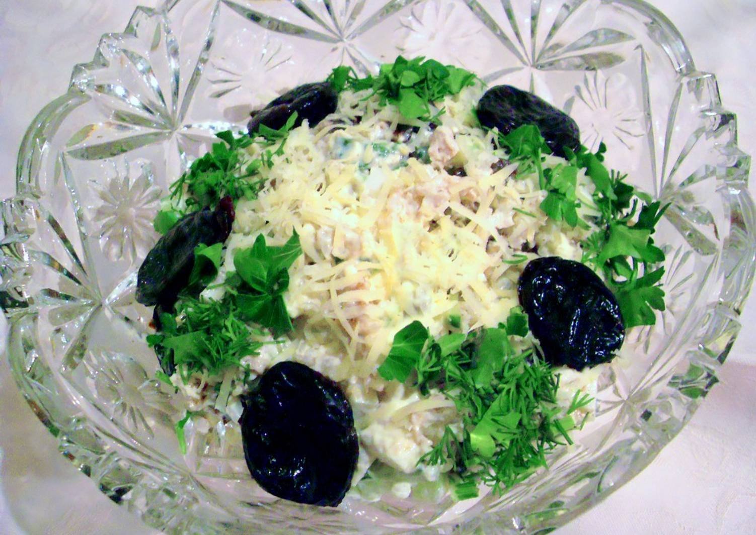 Салат нежность с черносливом и грецкими орехами и курицей и сыром