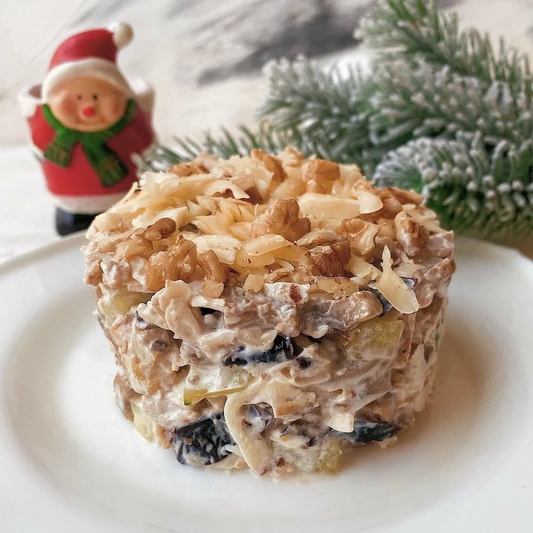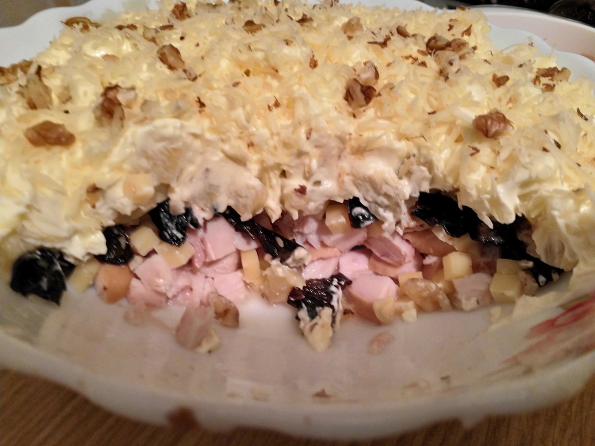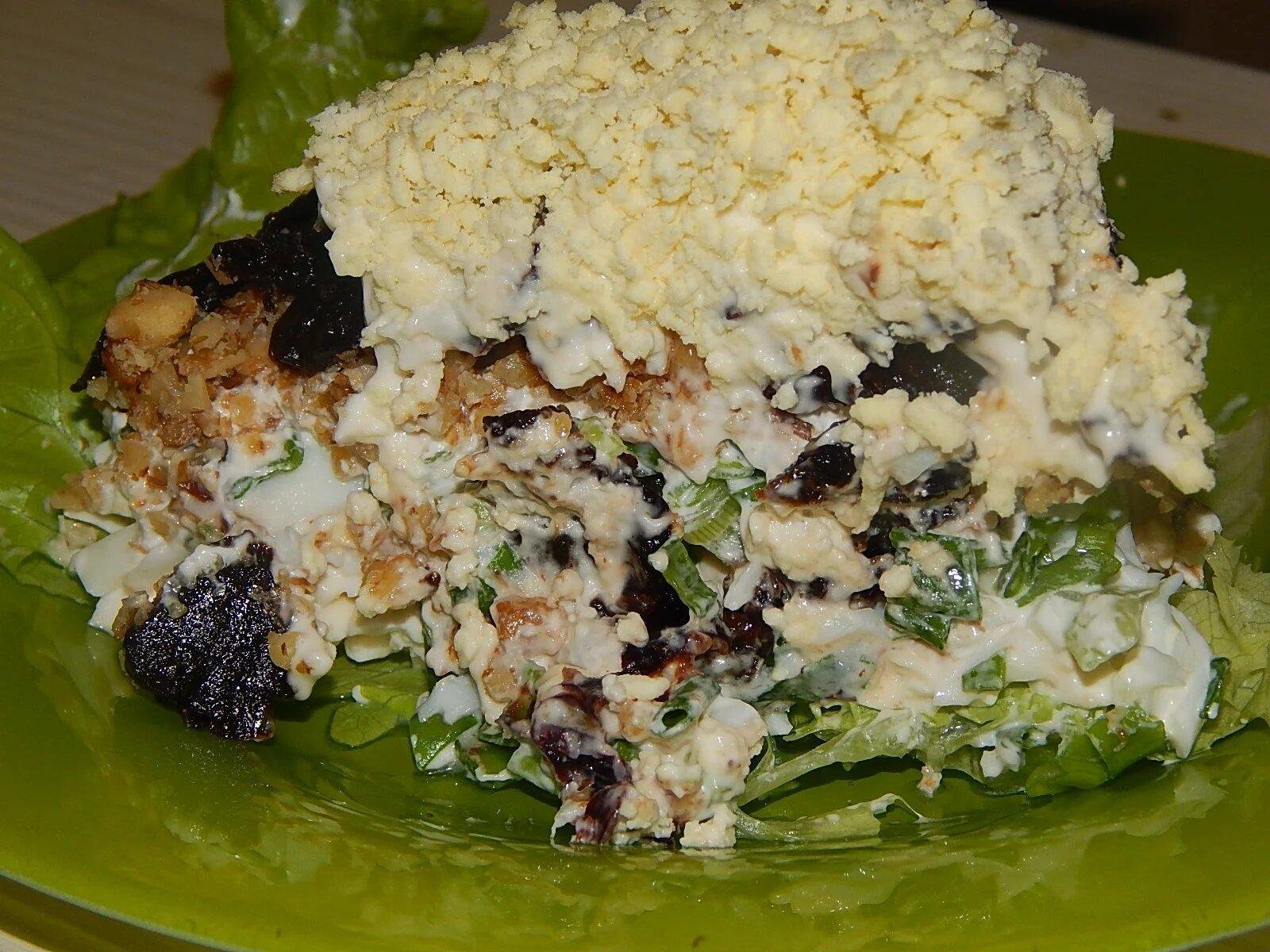 Салат с черносливом и курицей и грецкими орехами и грибами