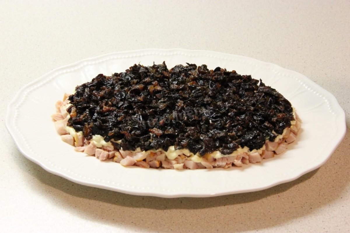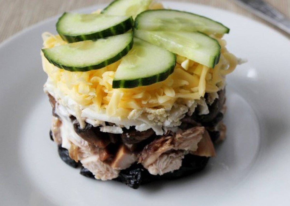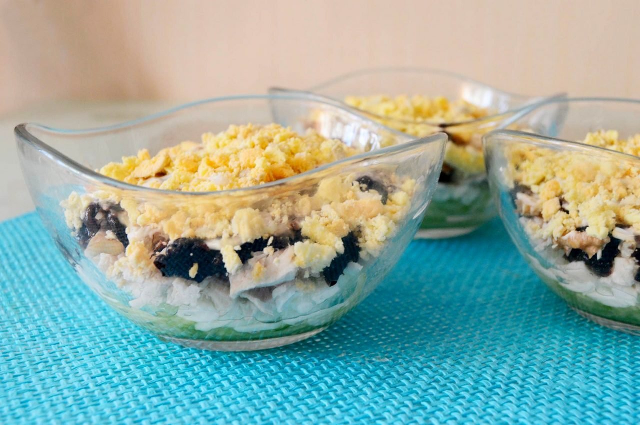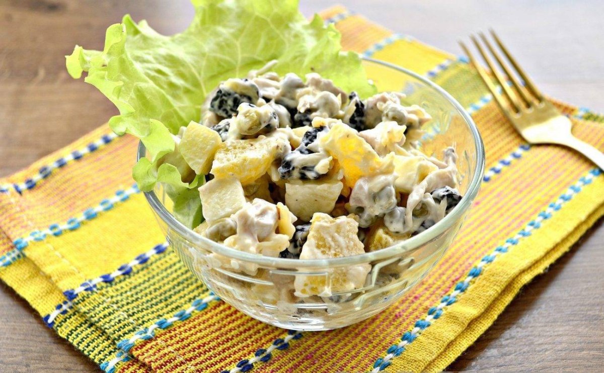 Салат с черносливом и курицей и грецкими орехами и грибами