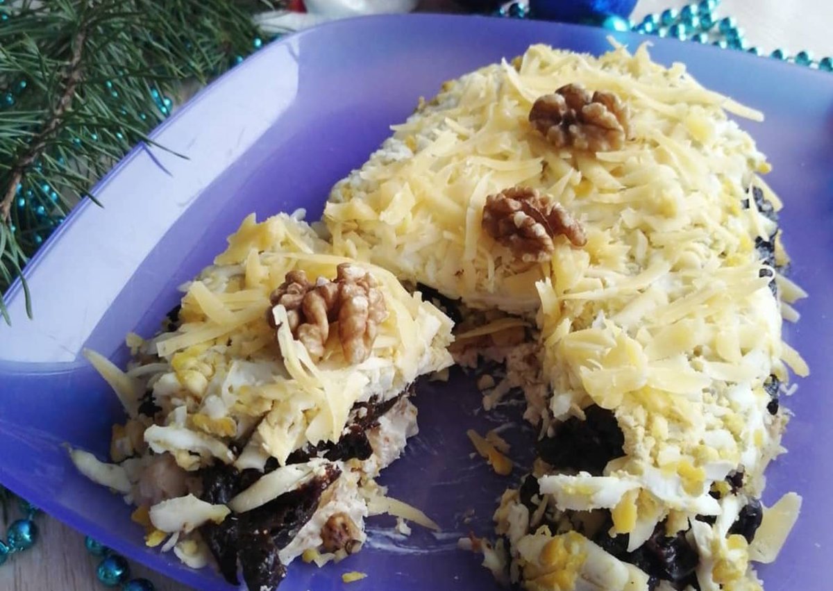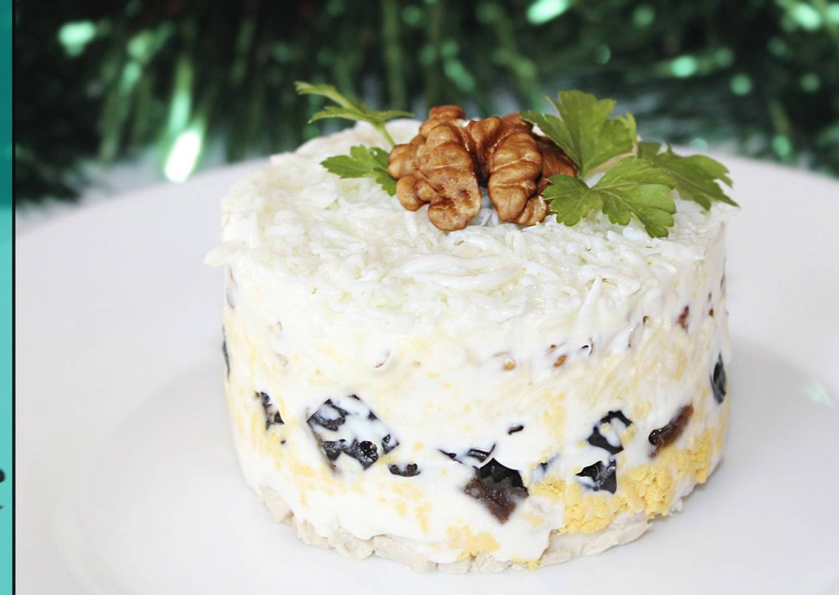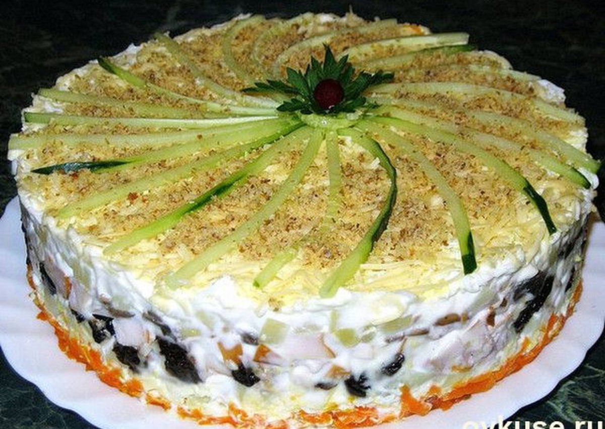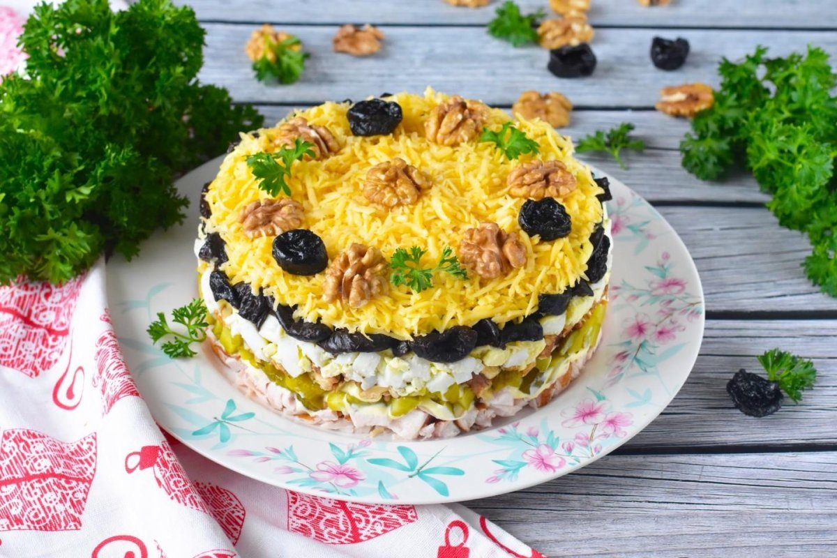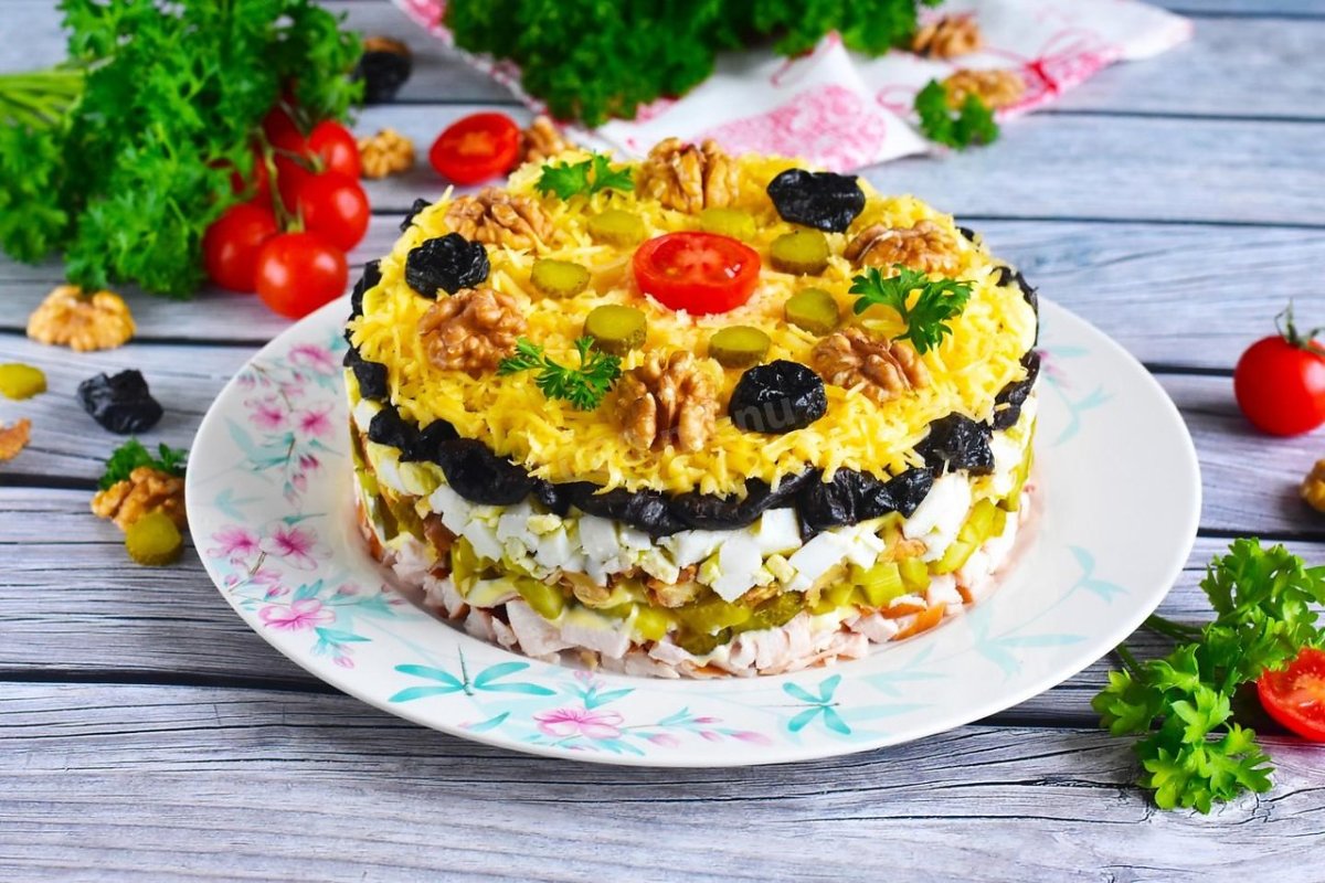 Слоеный салат с копченой курицей черносливом грецкими орехами