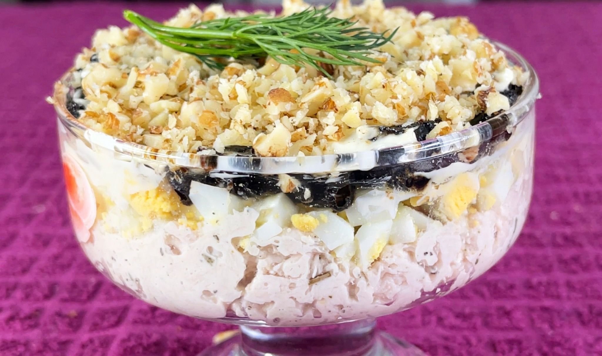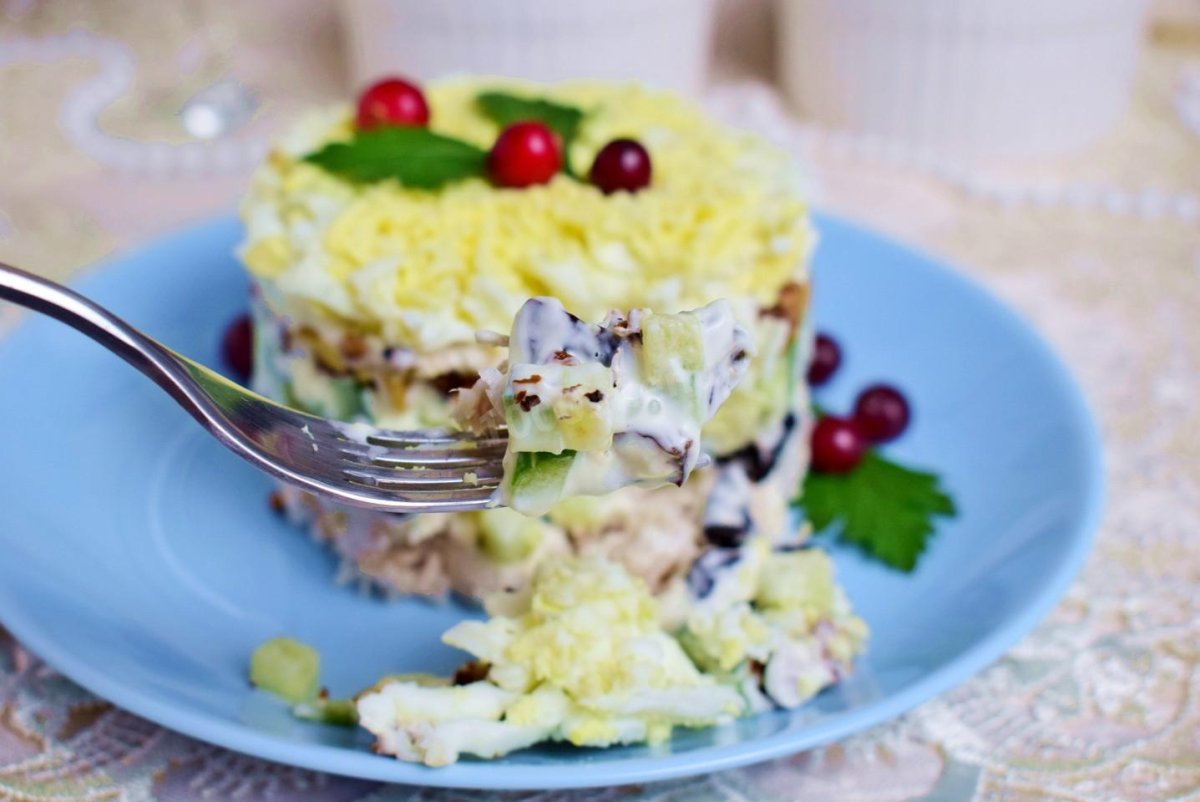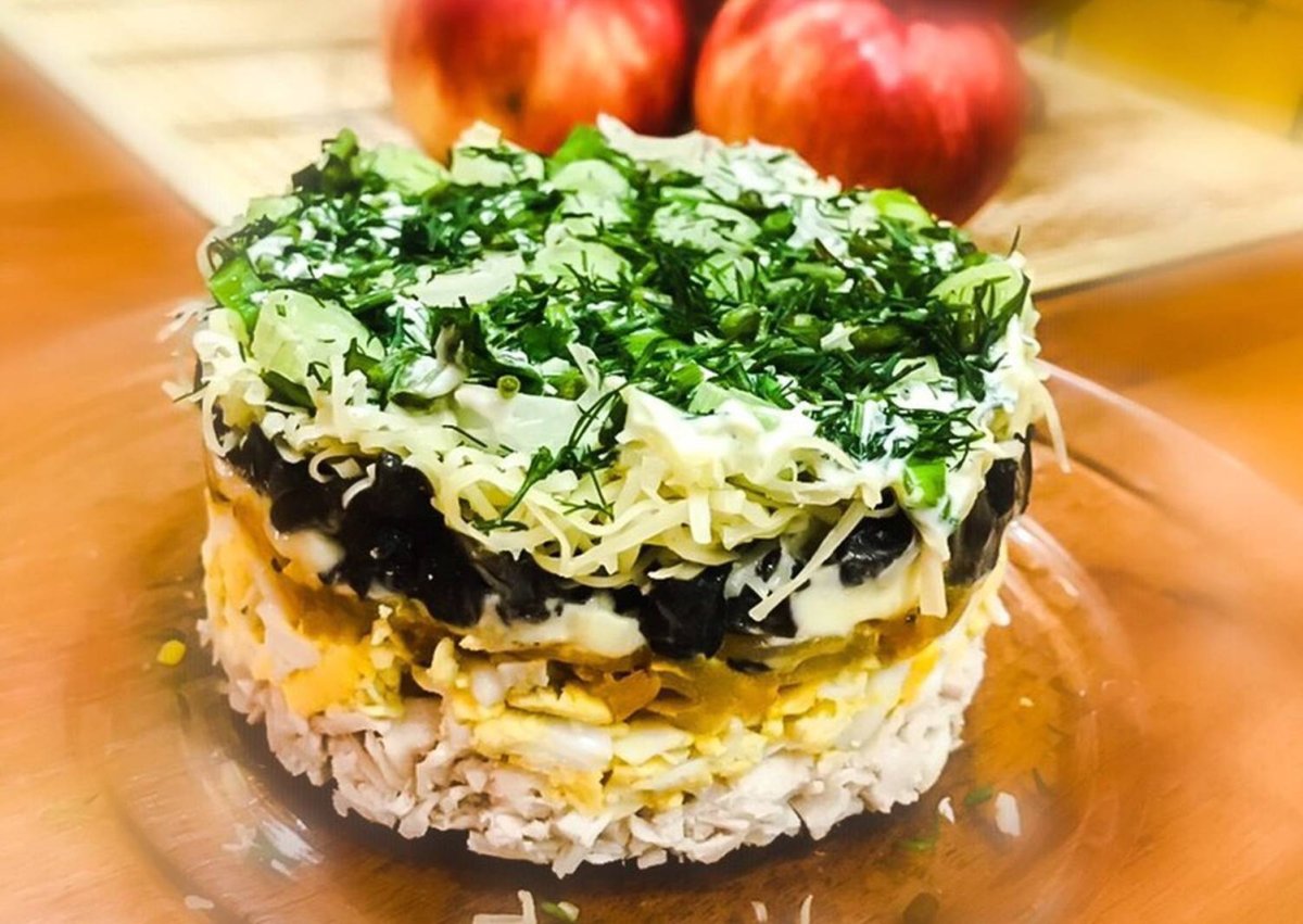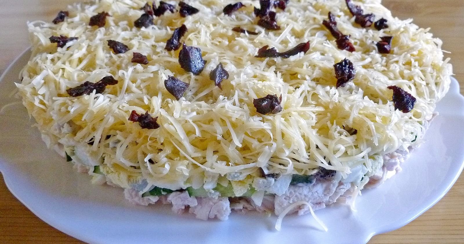 Слоеный салат с копченой курицей черносливом грецкими орехами