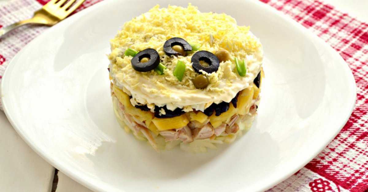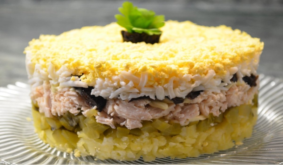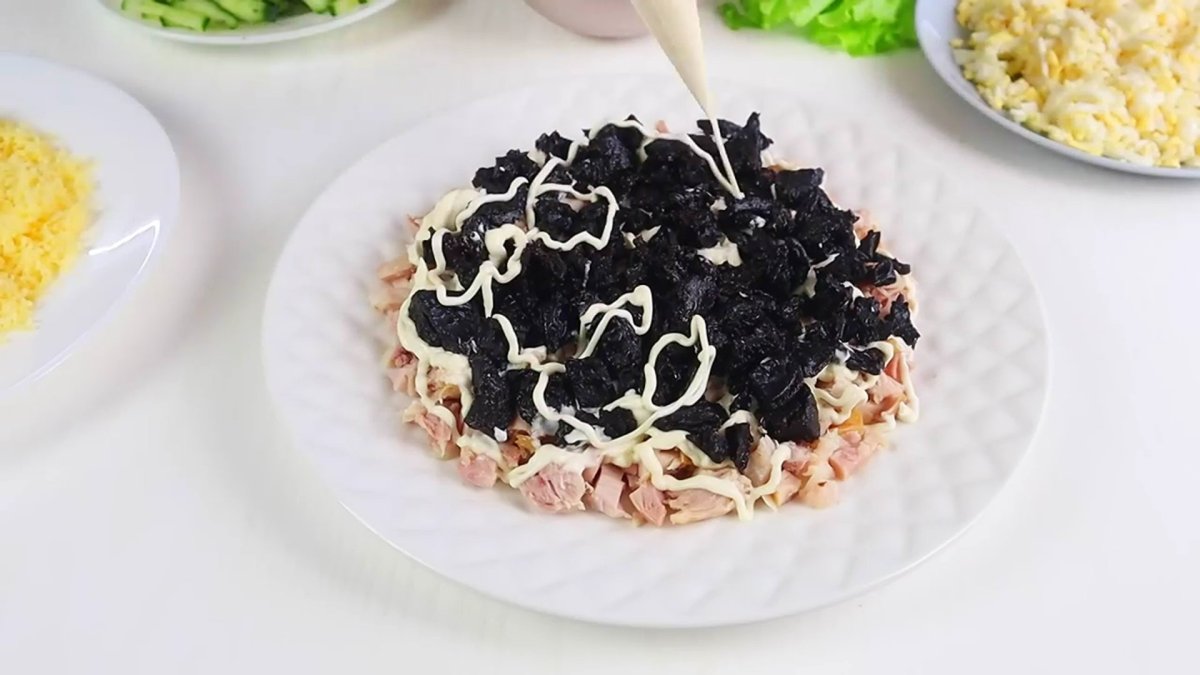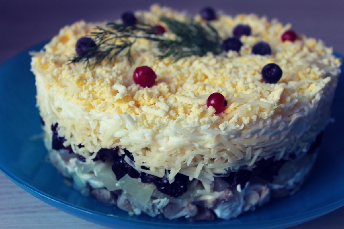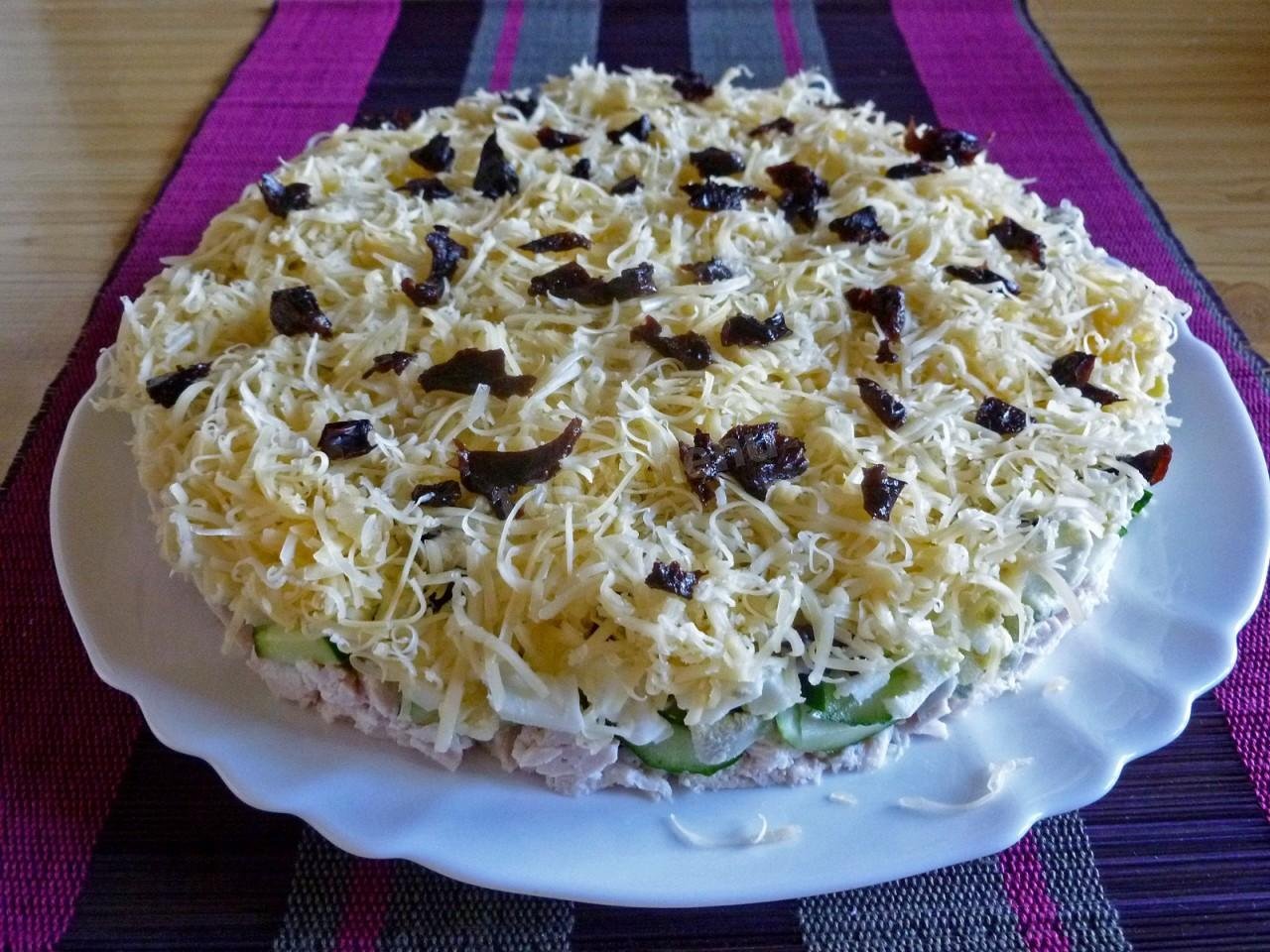 Слоеный салат с копченой курицей черносливом грецкими орехами