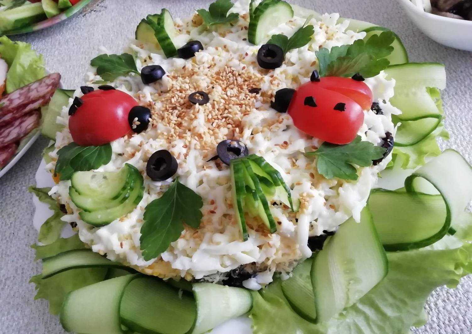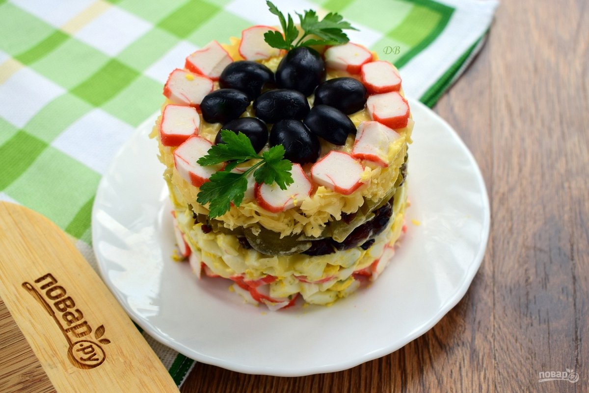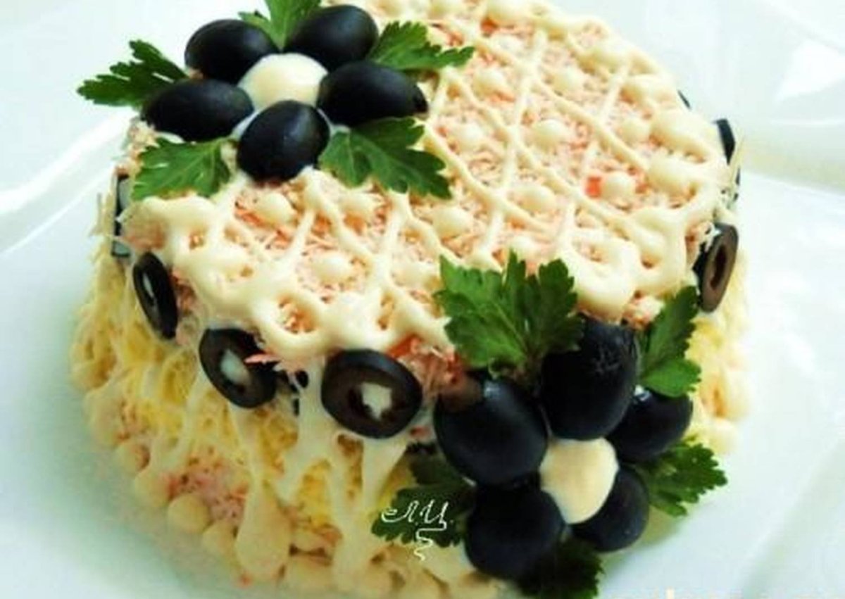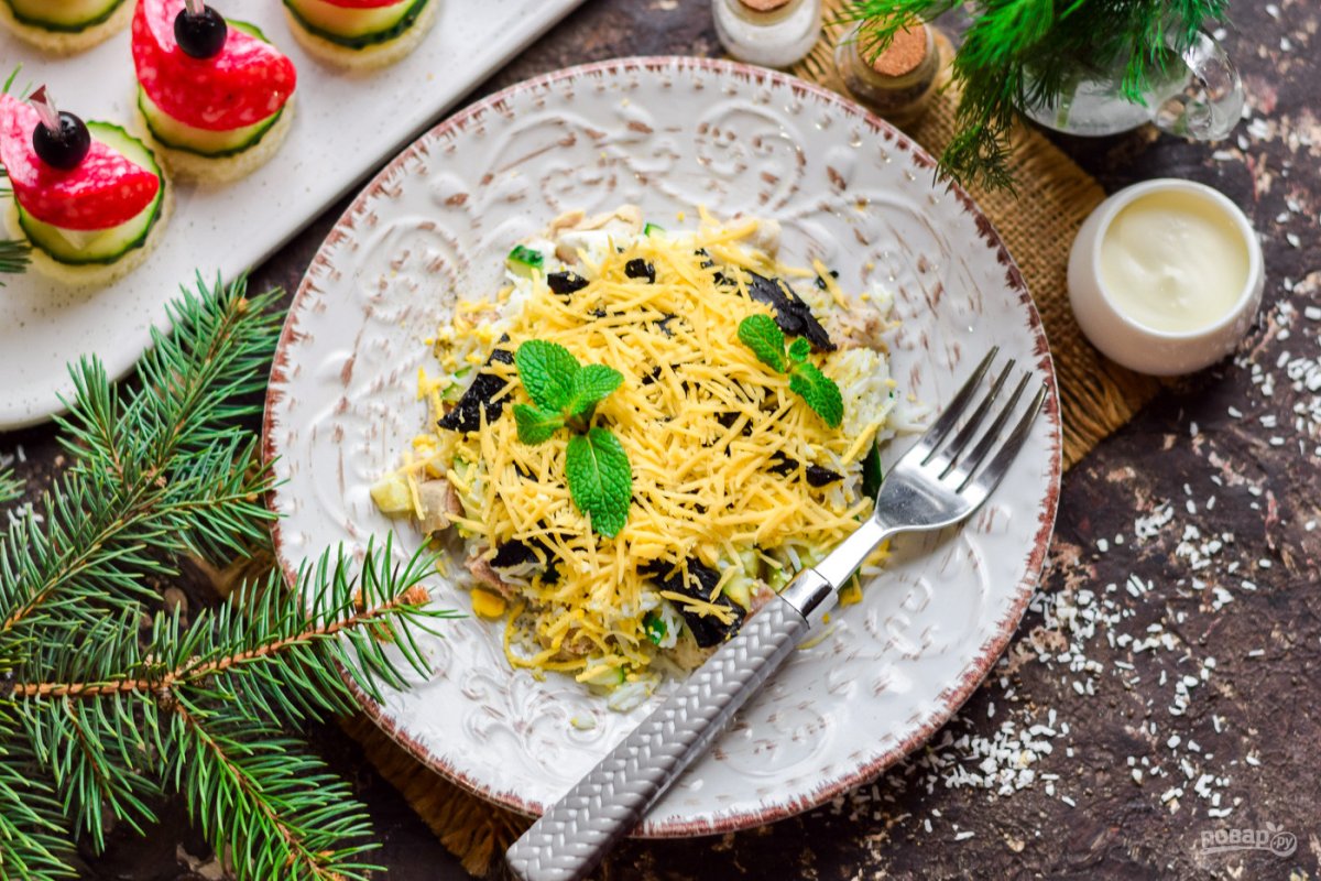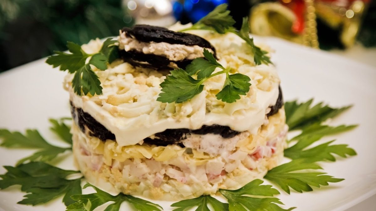 Слоеный салат с копченой курицей черносливом грецкими орехами