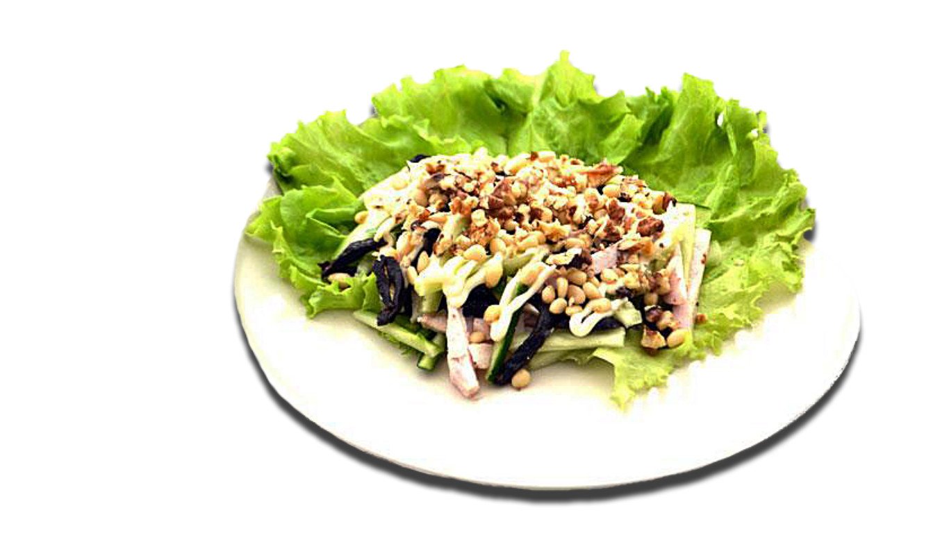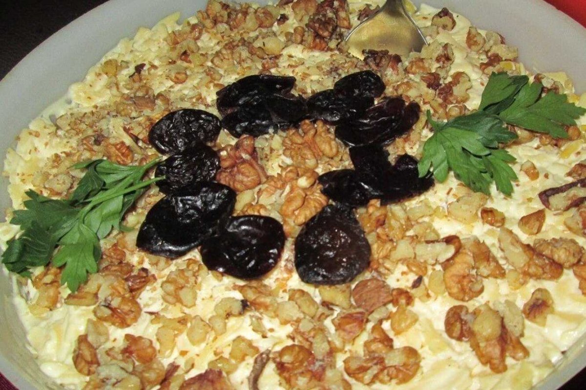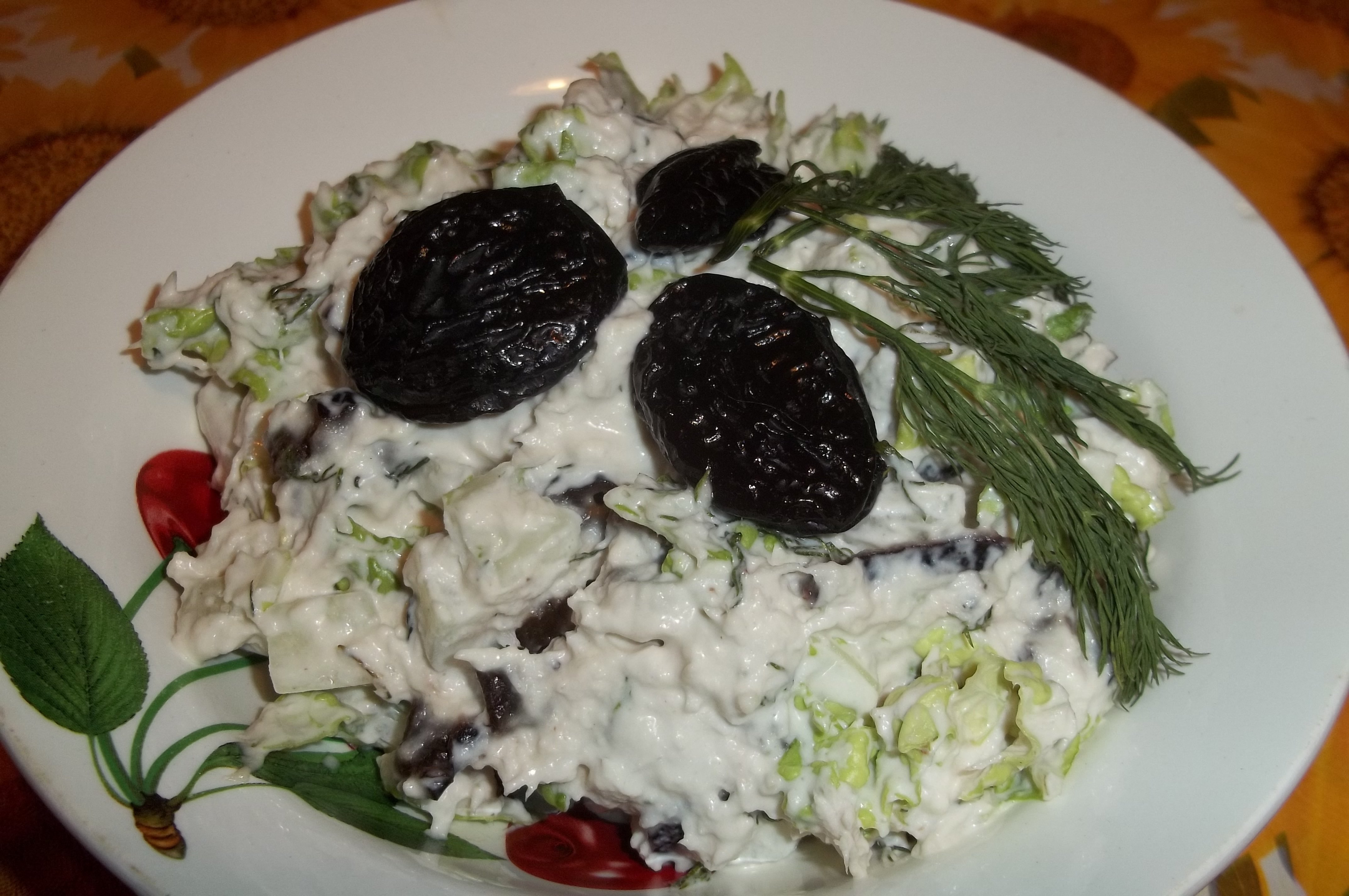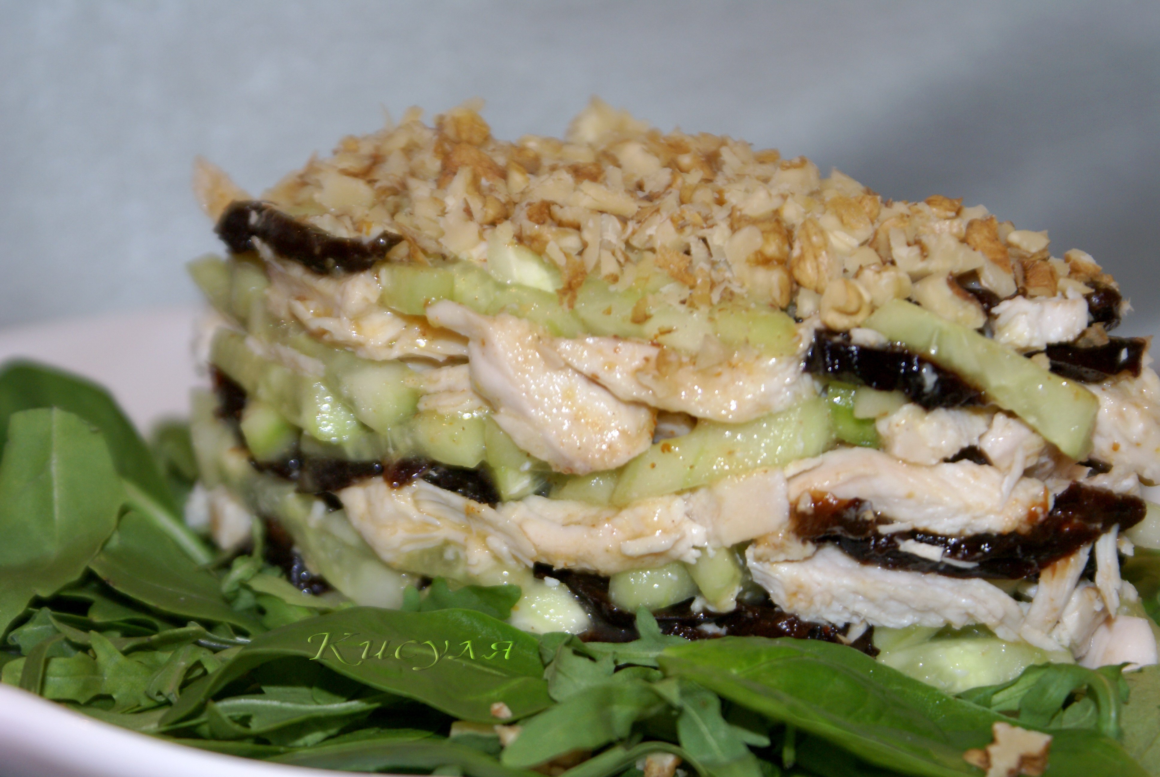 Салат с черносливом и курицей и грецкими орехами и огурцом