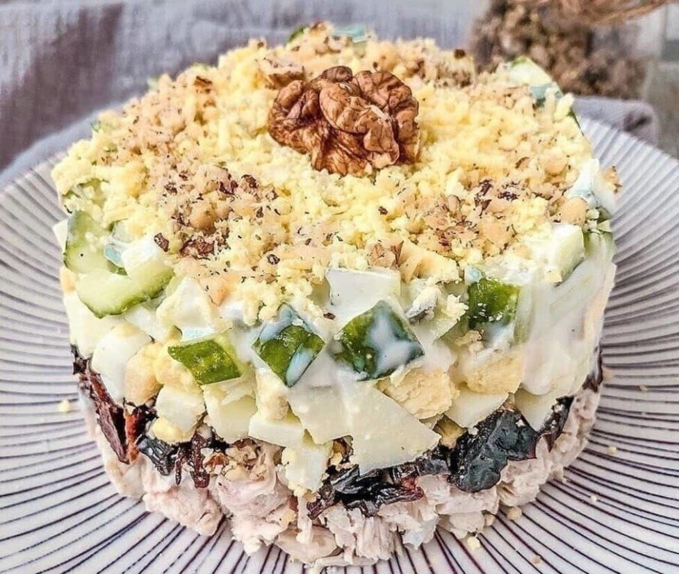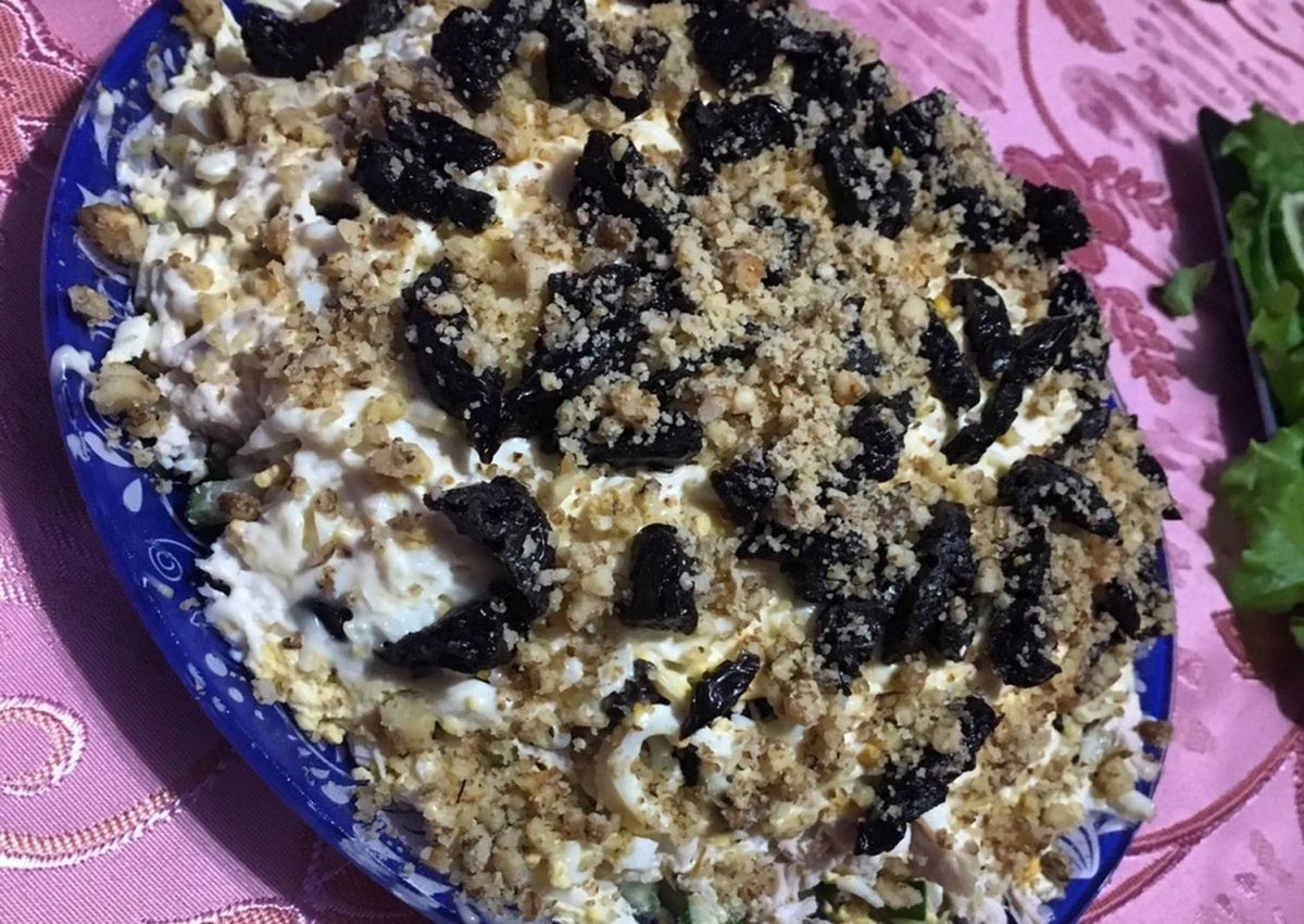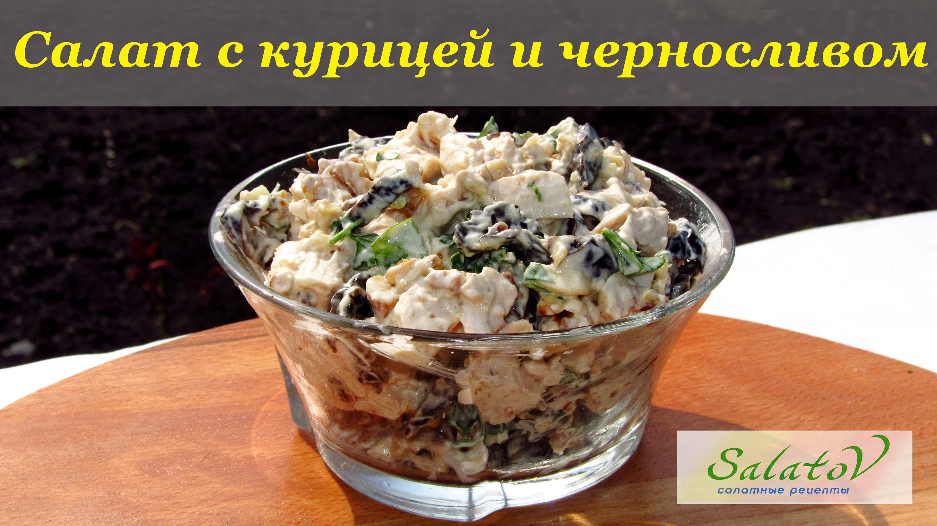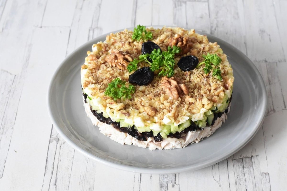 Салат с черносливом и курицей и грецкими орехами и огурцом