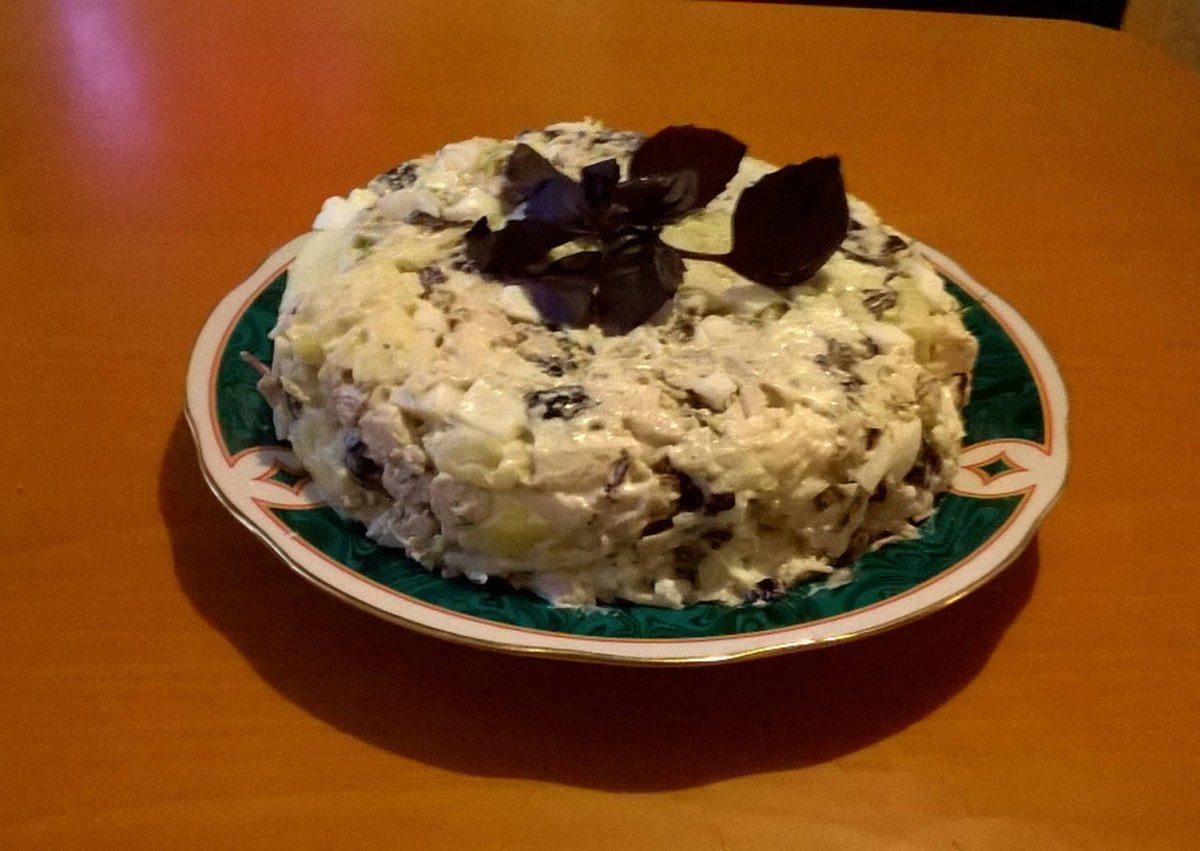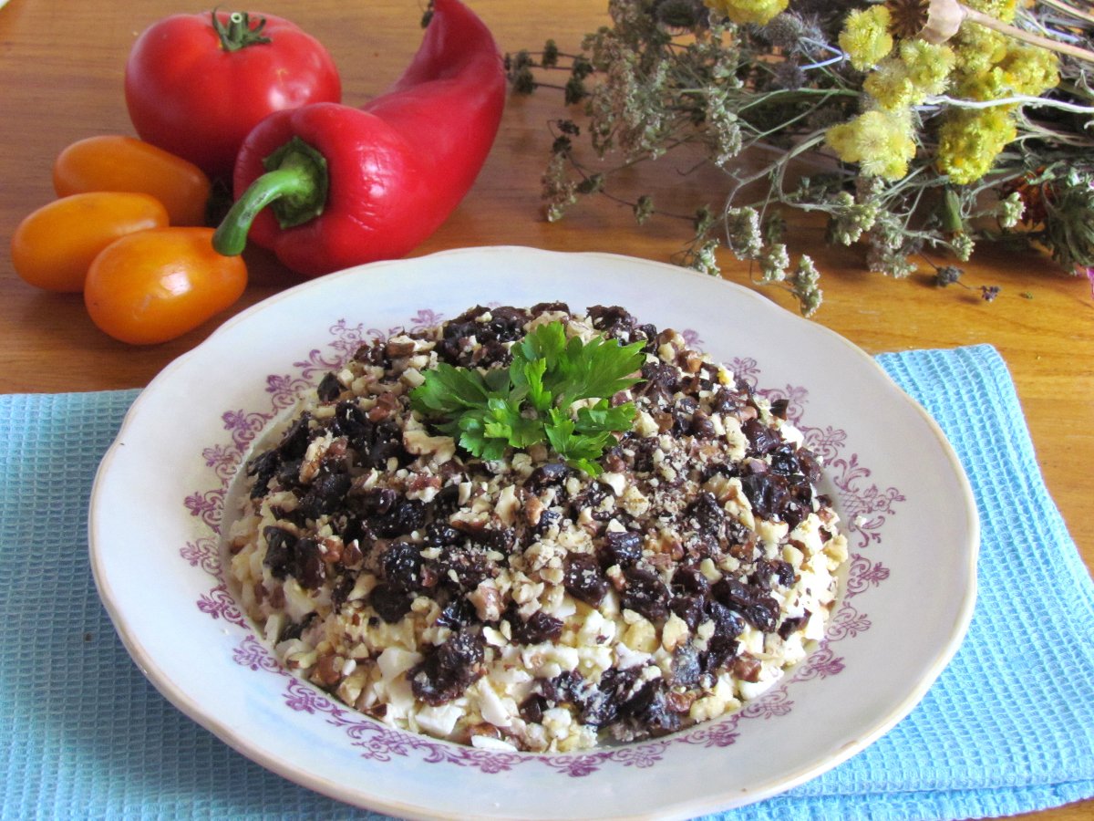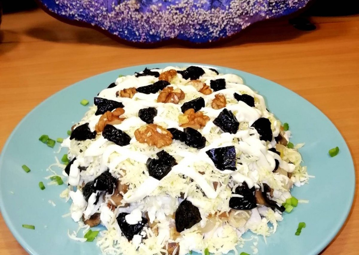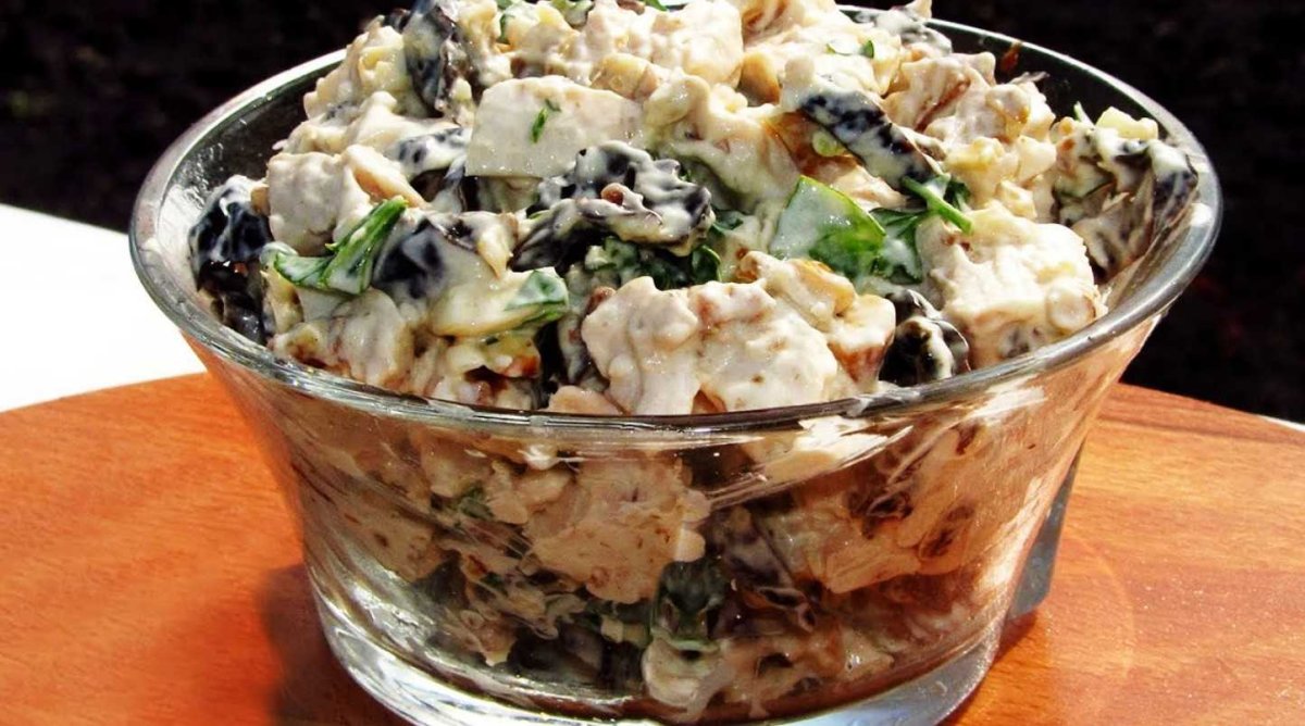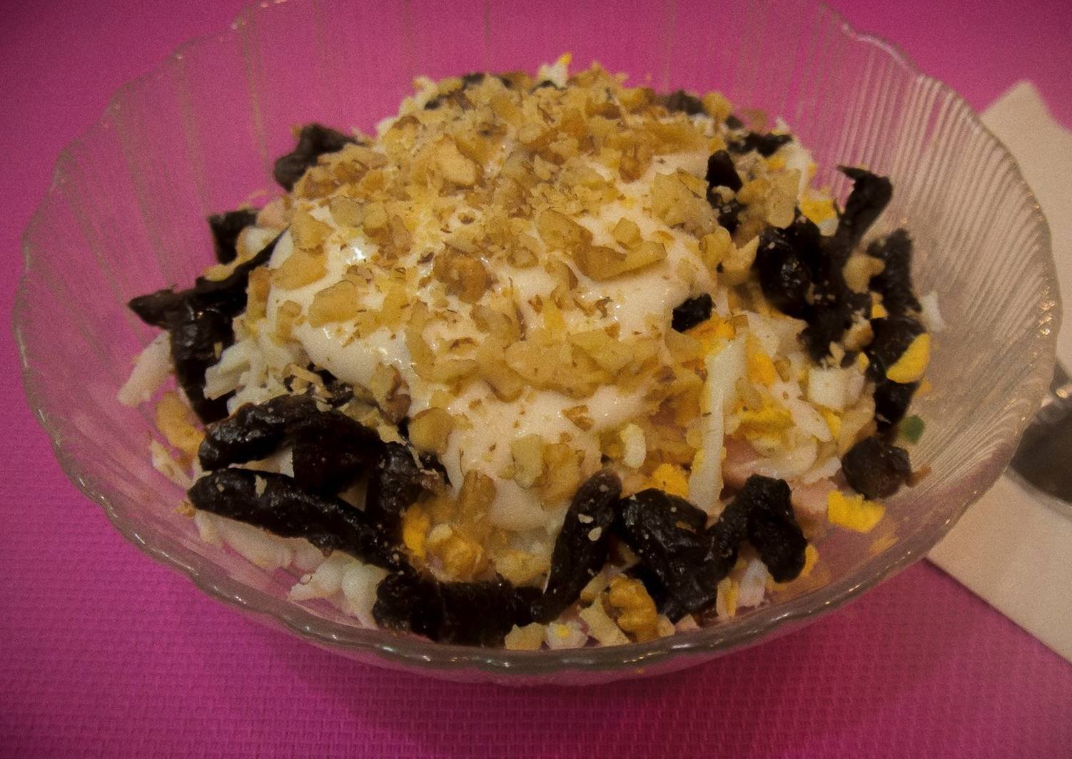 Салат из курицы с грибами и черносливом и грецкими орехами