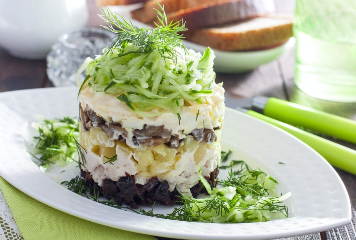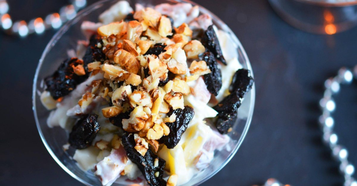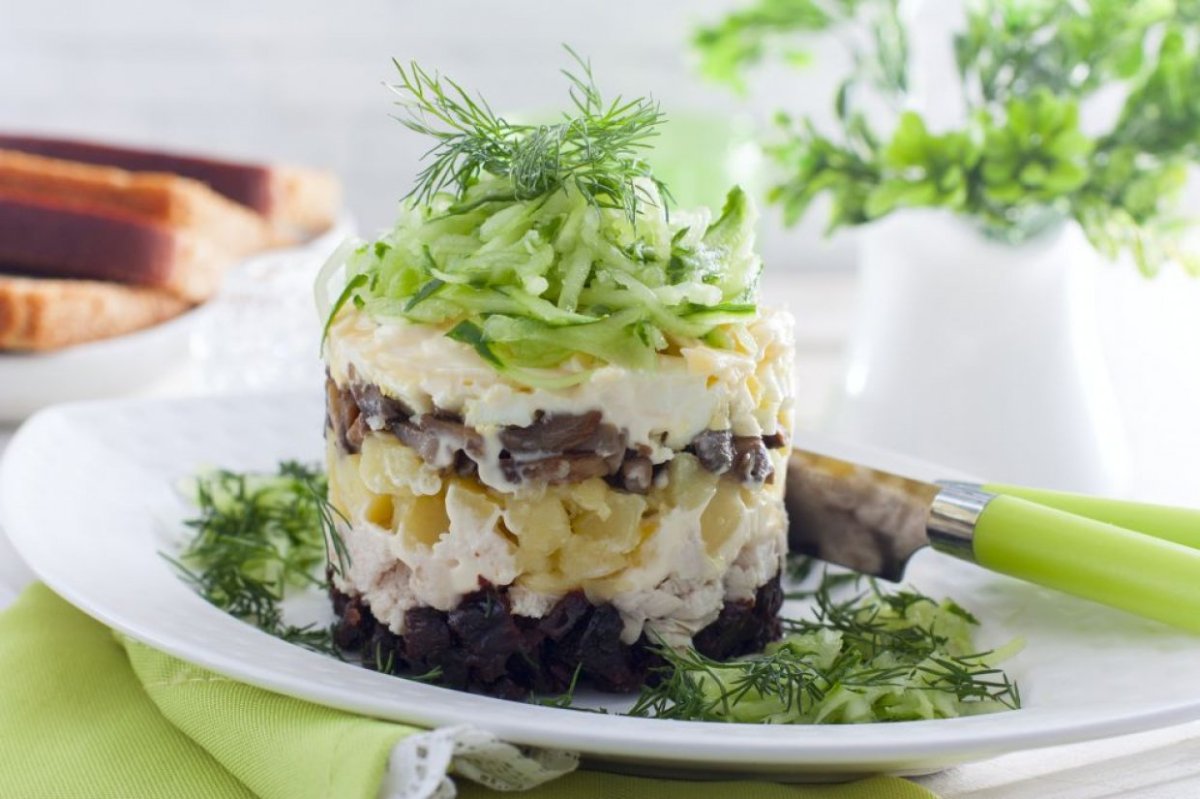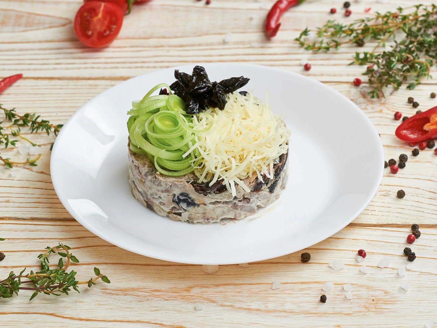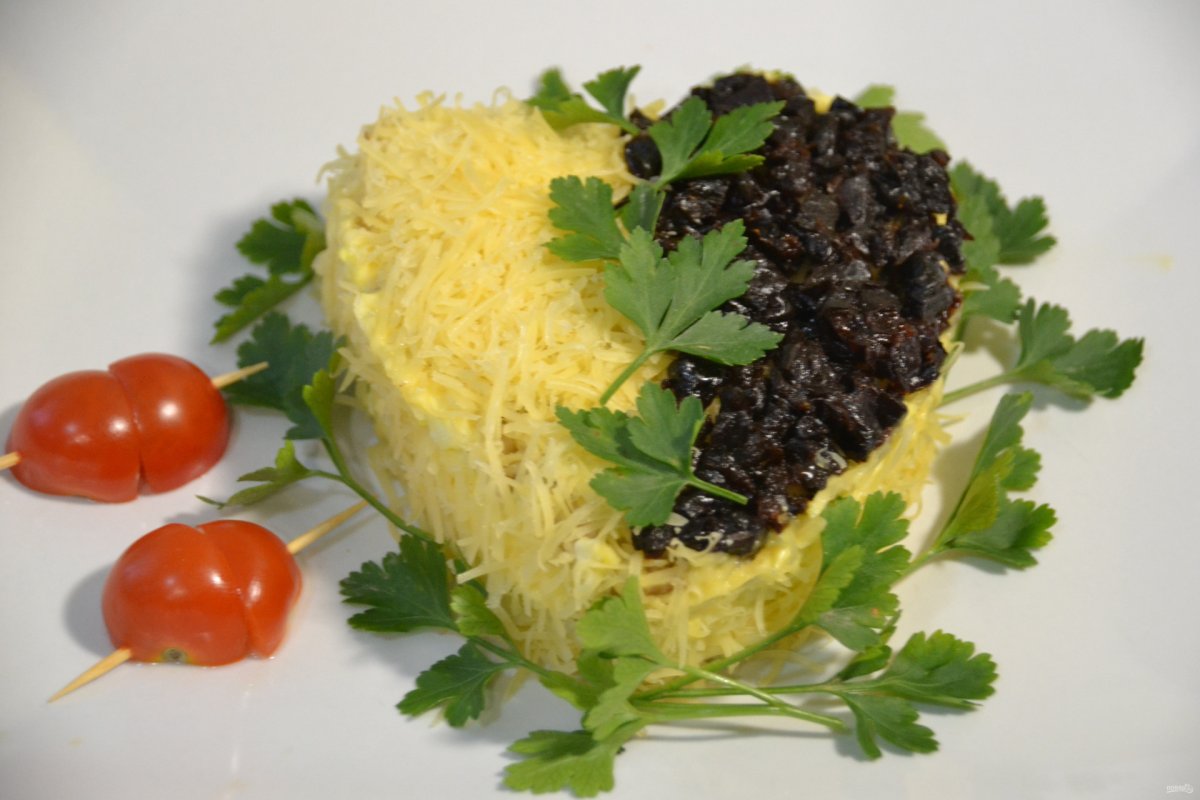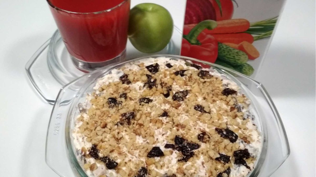 Салат из курицы с грибами и черносливом и грецкими орехами