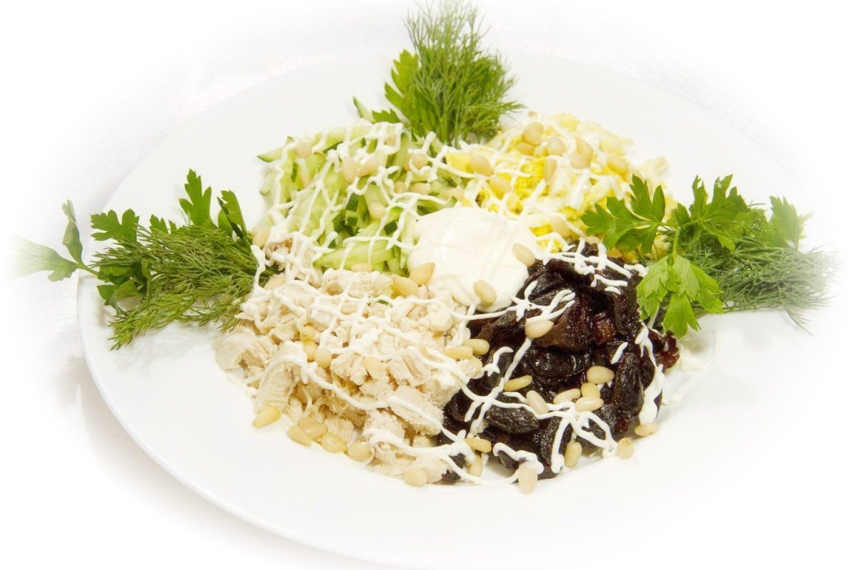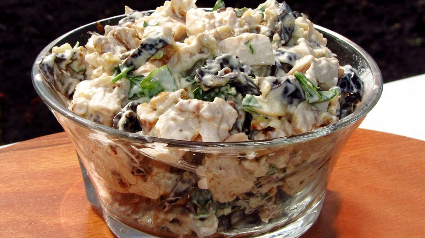 Салат нежность с курицей и черносливом и грецкими орехами