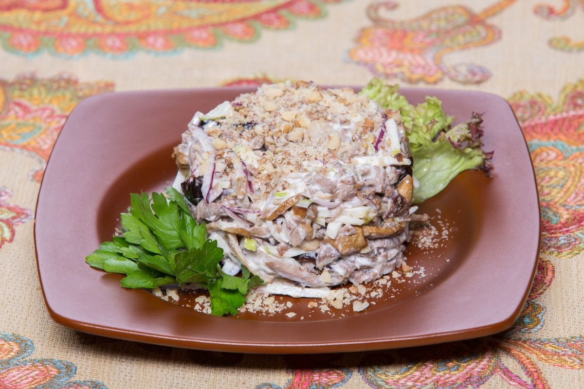 Салат с курицей и грибами грецкими орехами и черносливом слоями