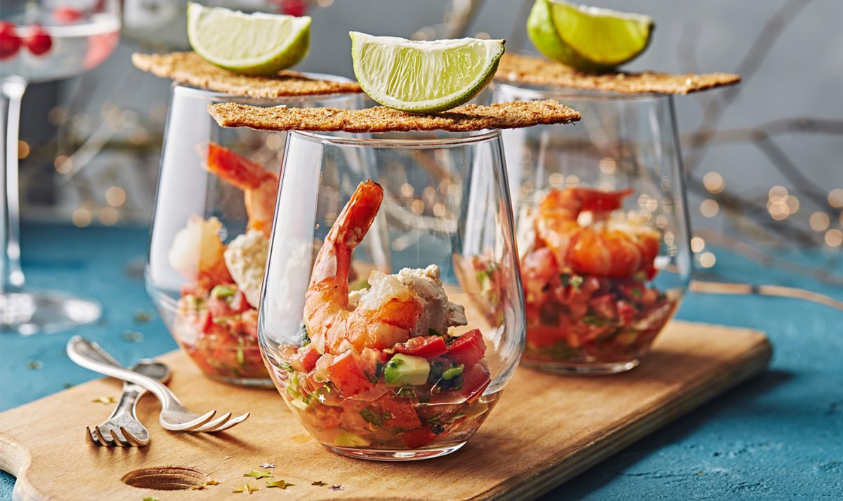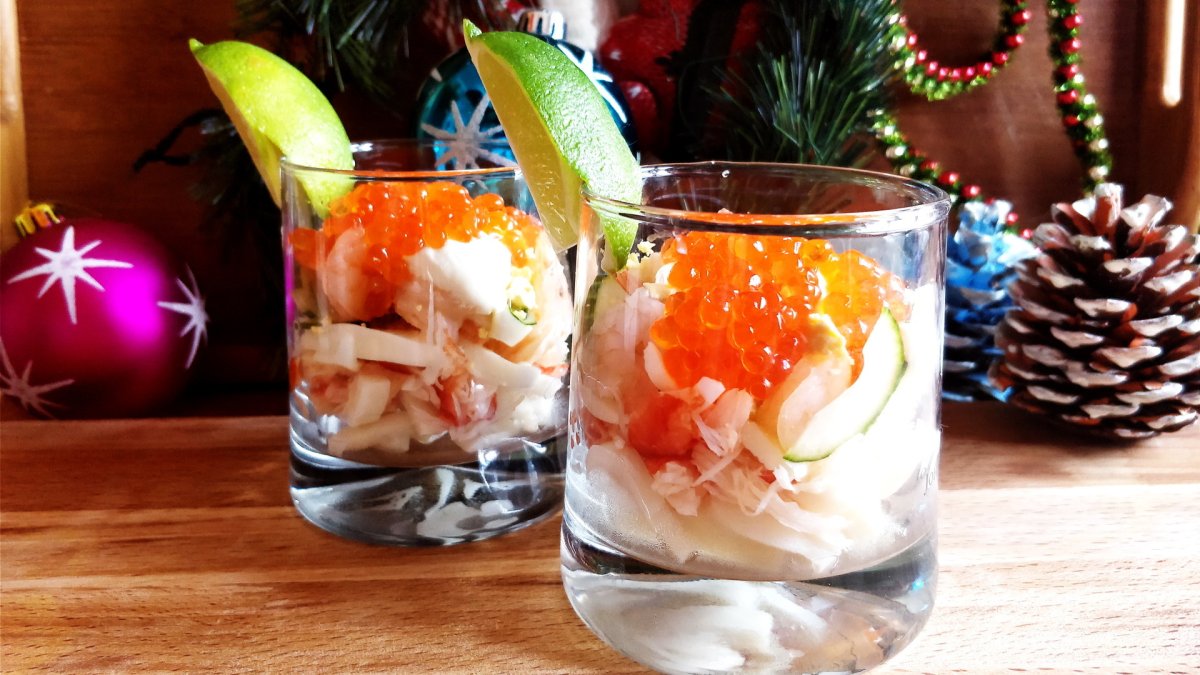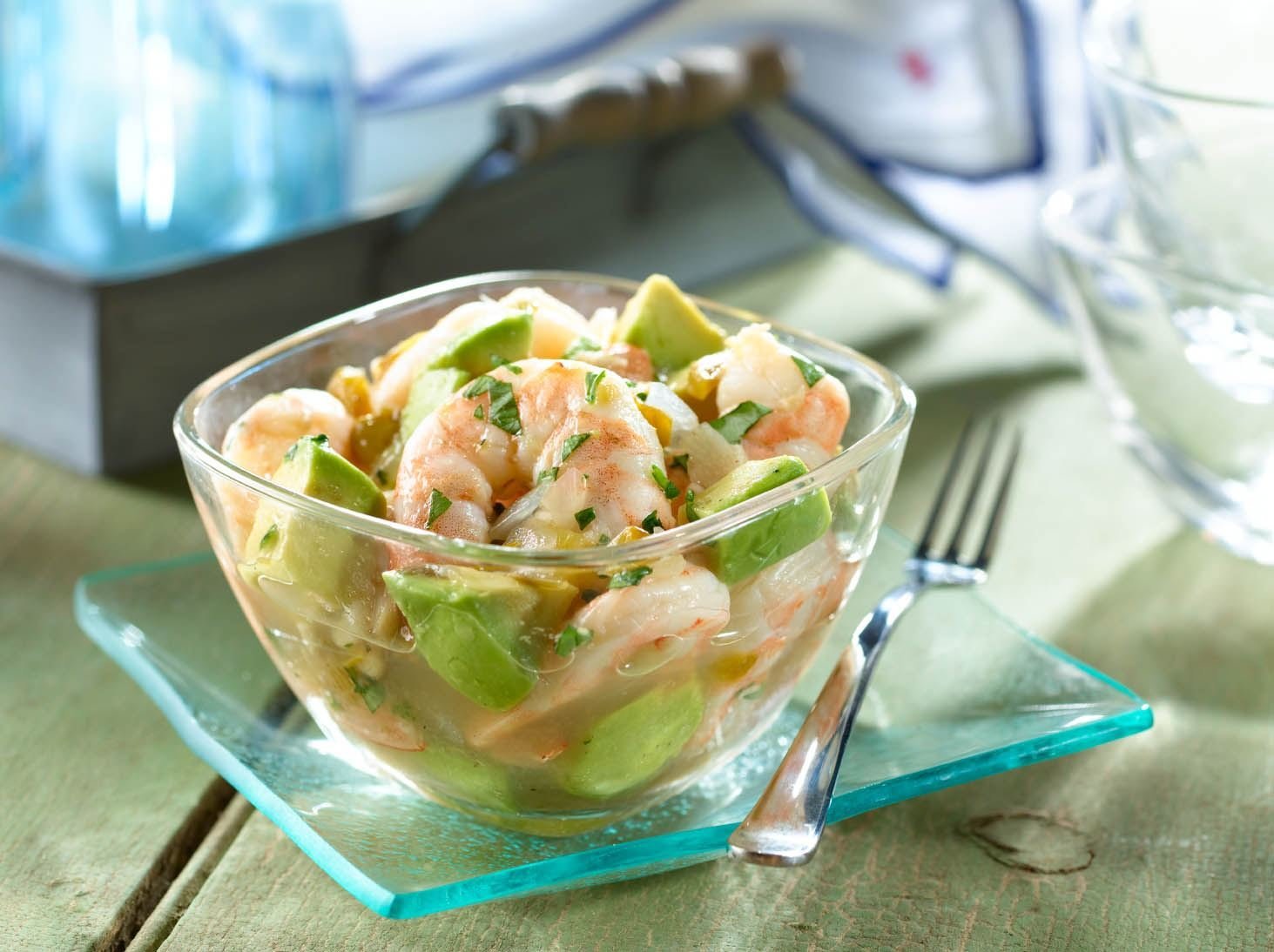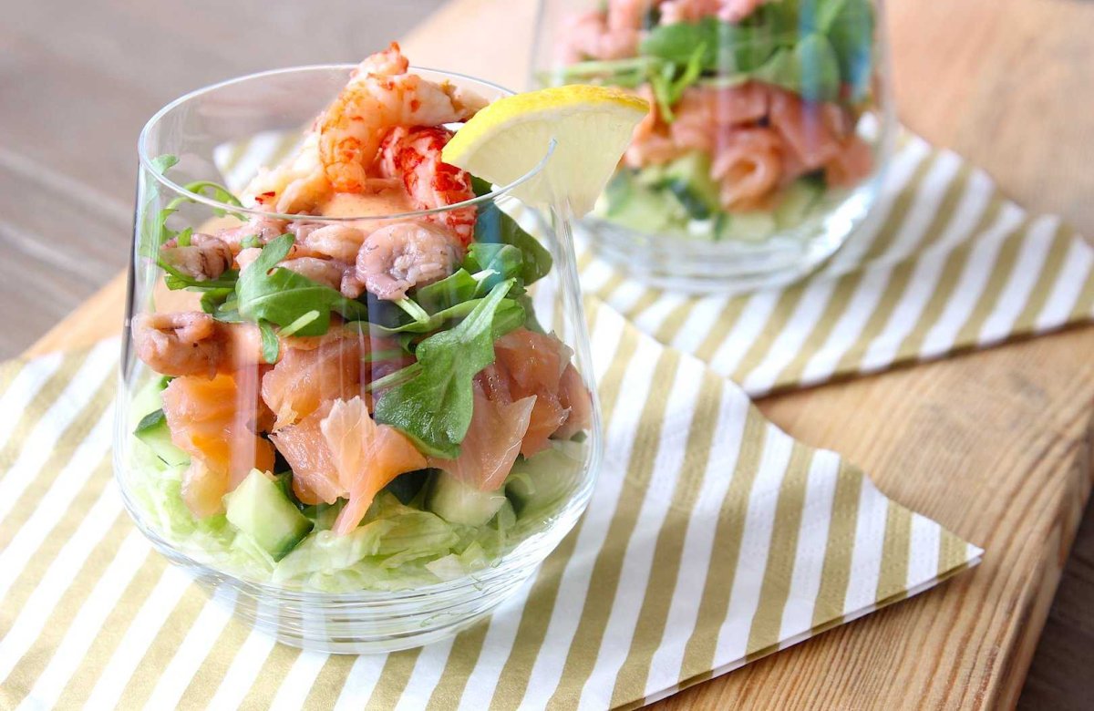 Салат с креветками и авокадо в стакане