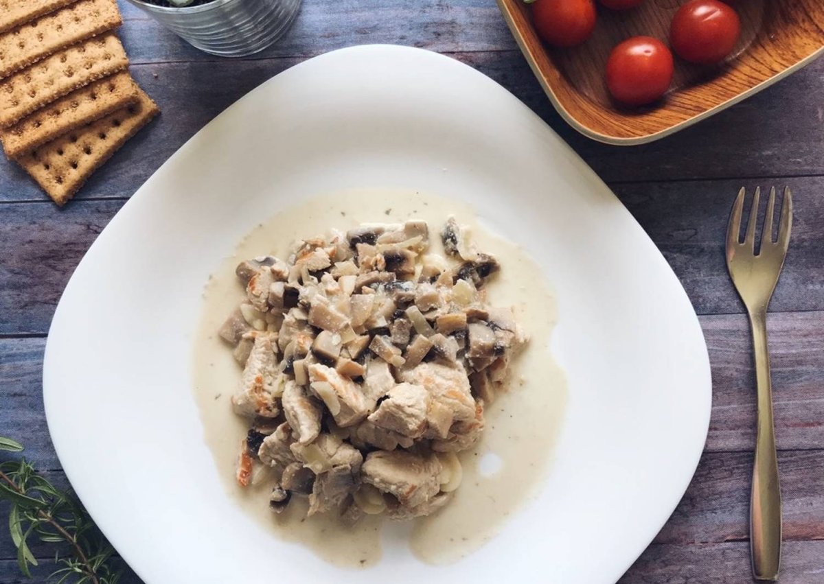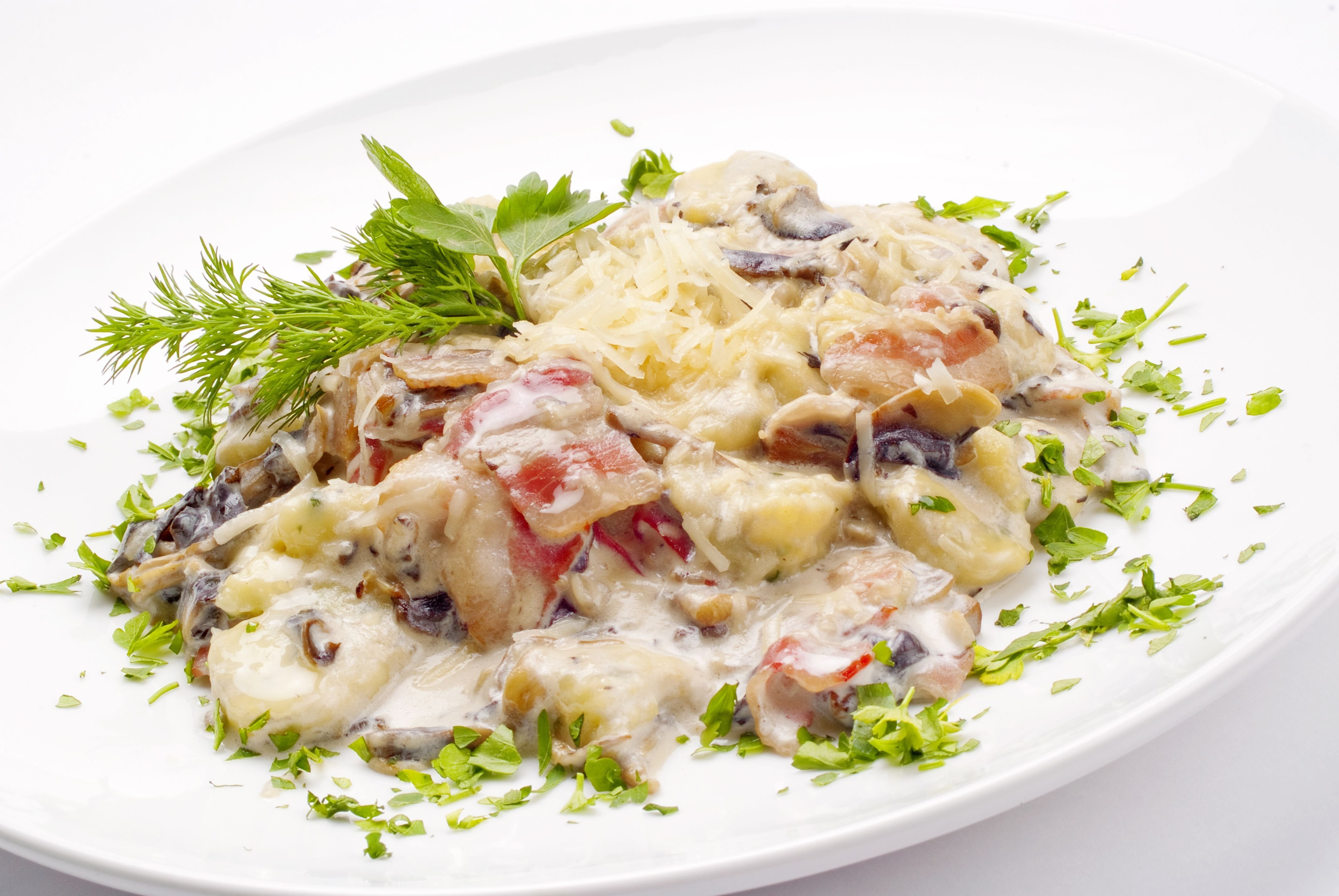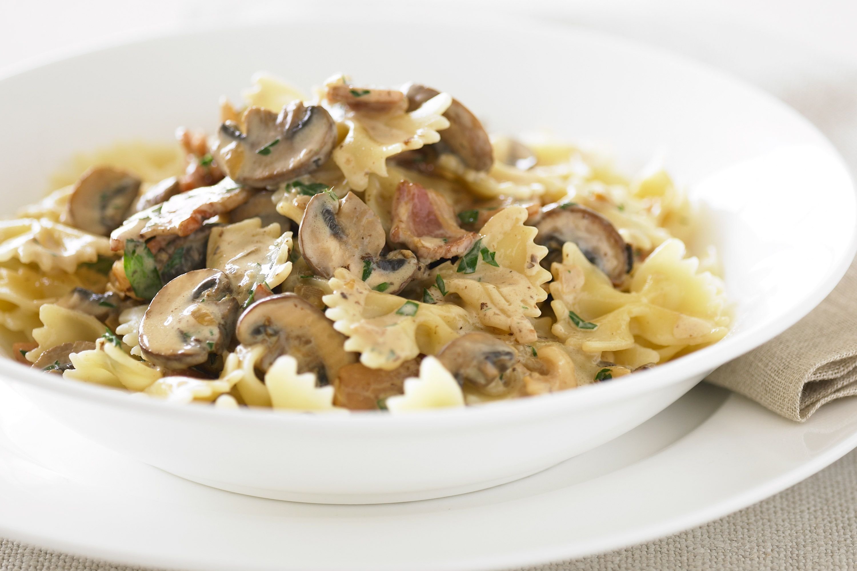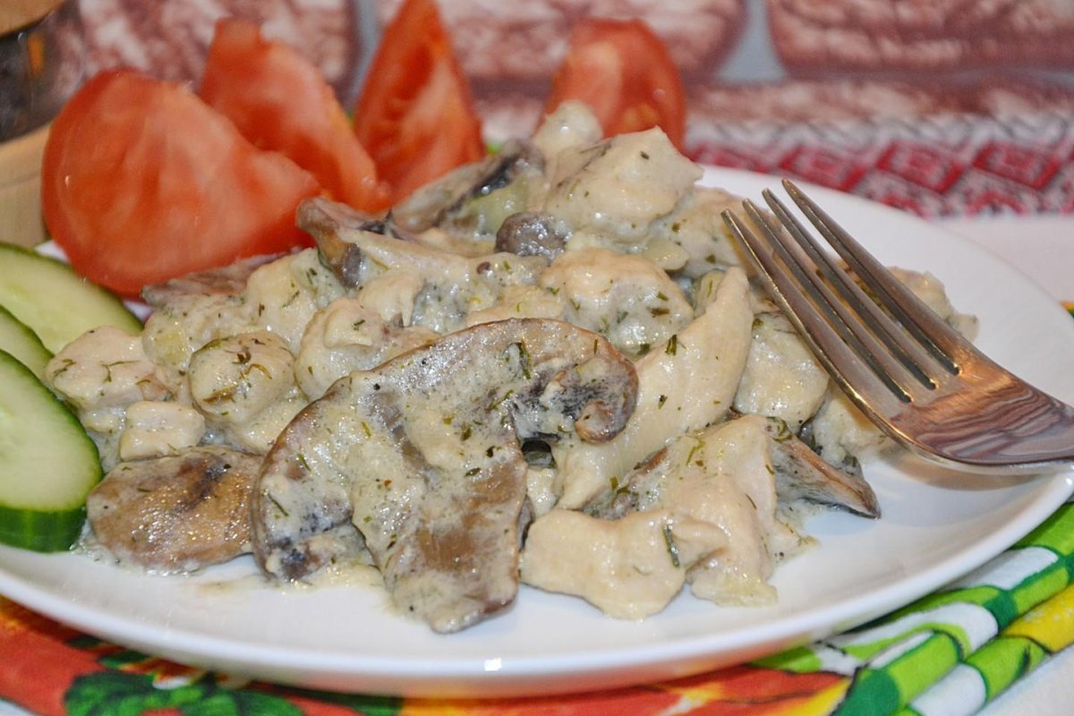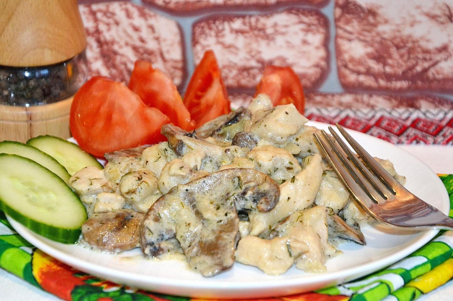 Паста с грибами и курицей в сливочном соусе и курицей.