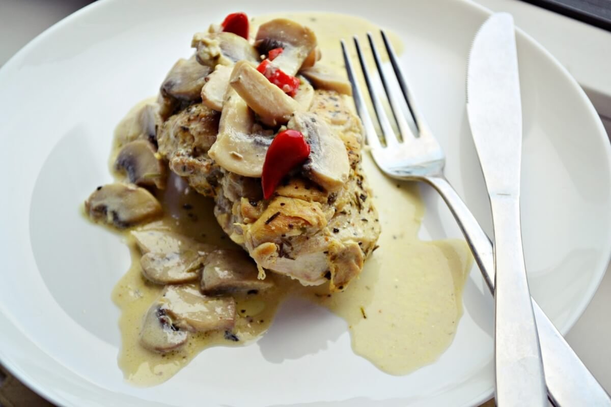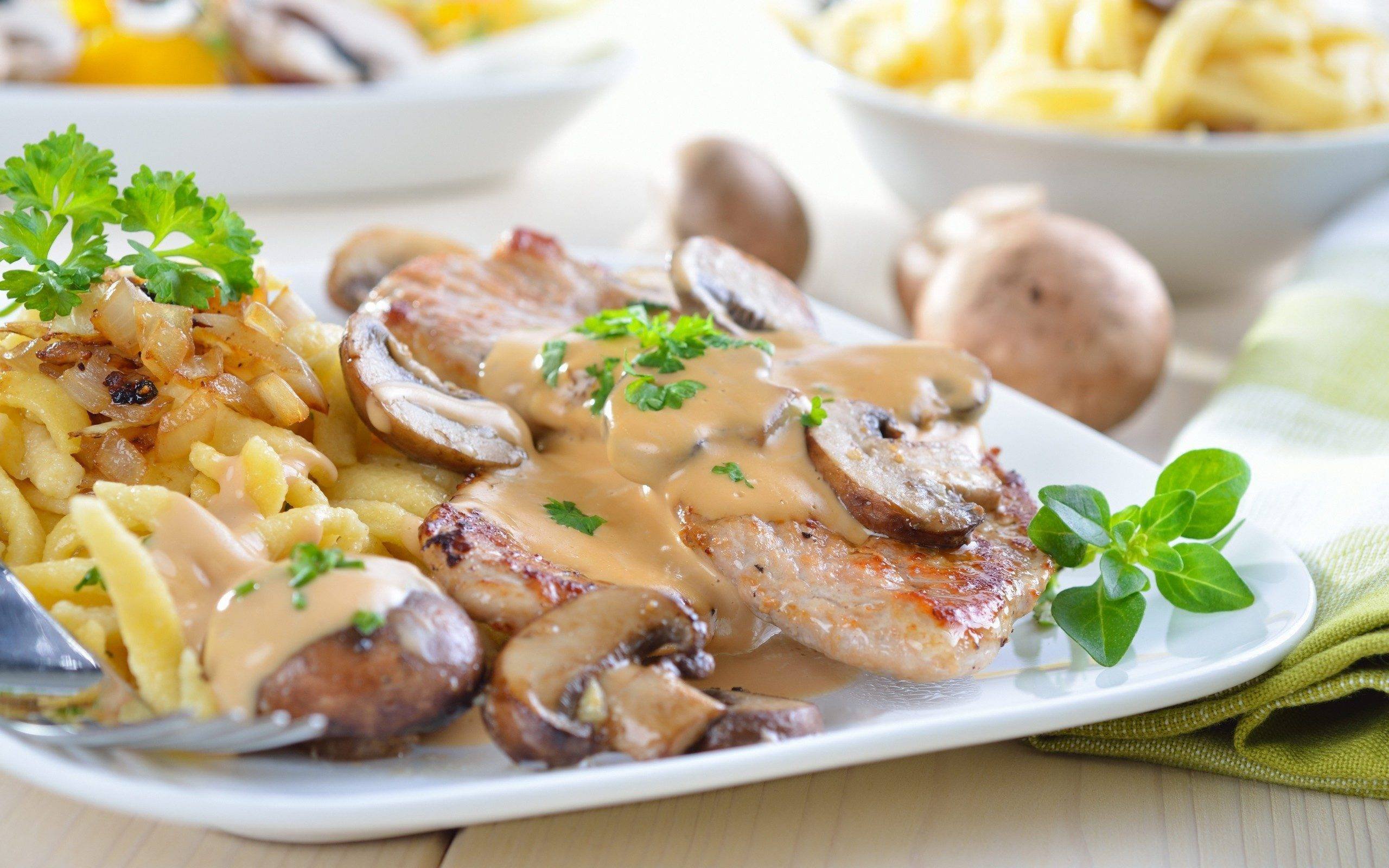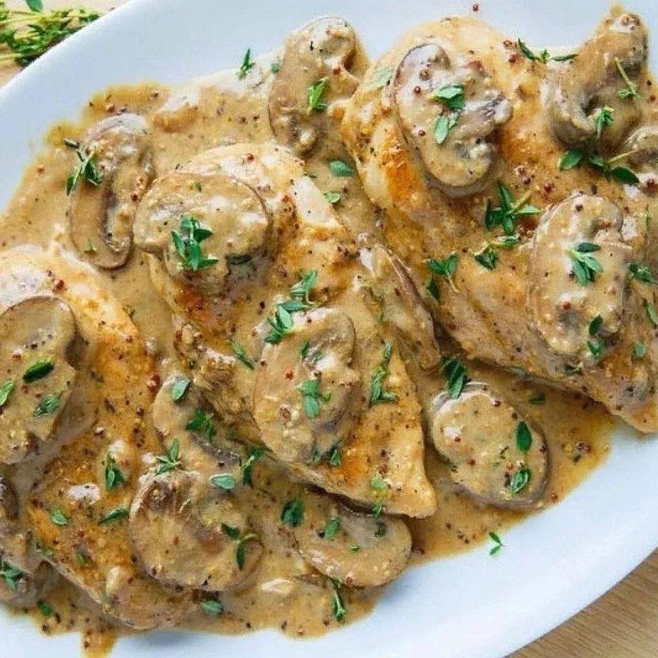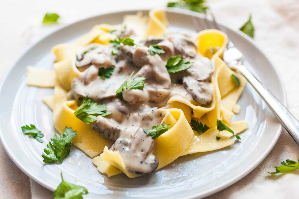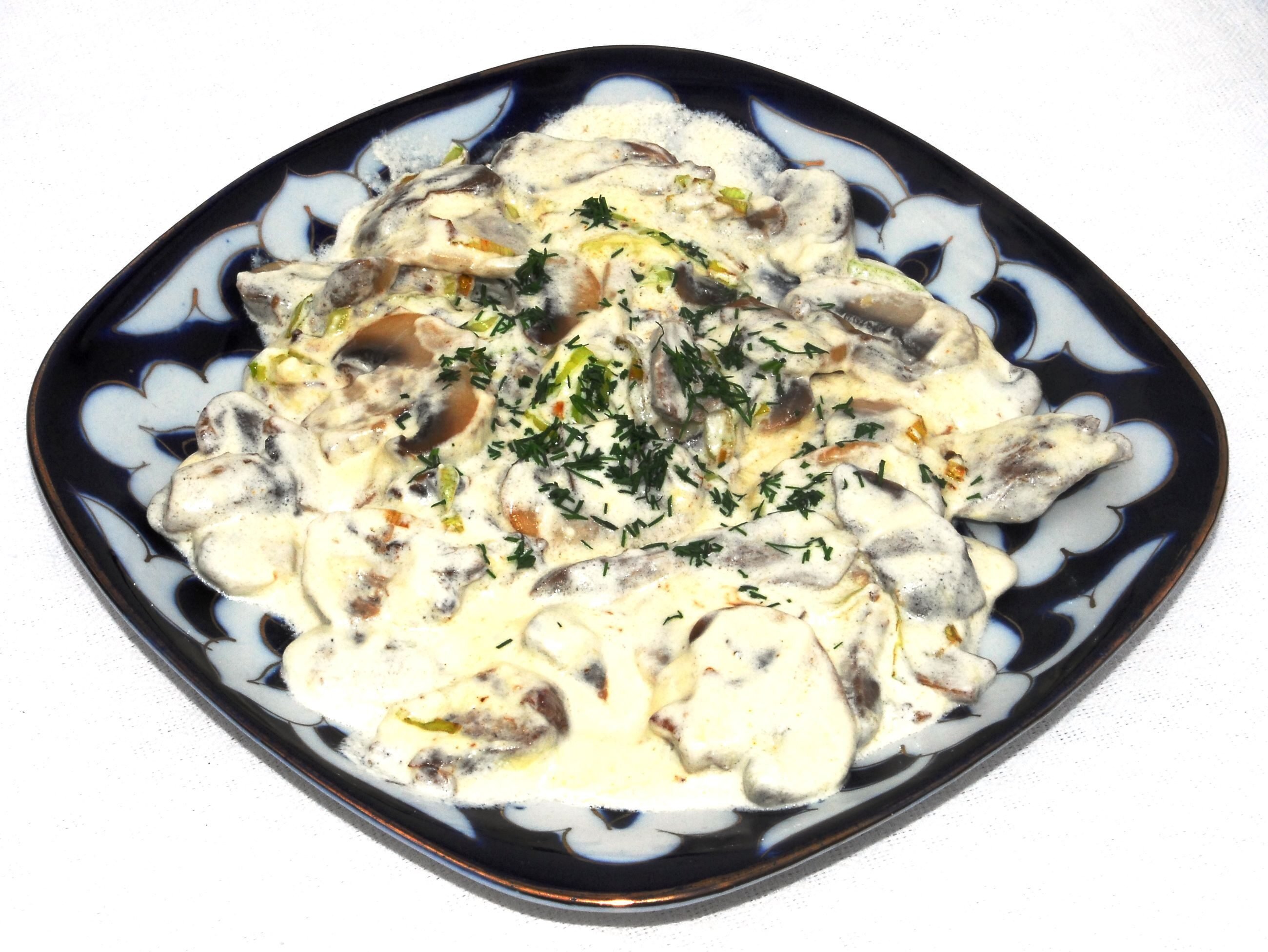 Паста с грибами и курицей в сливочном соусе и курицей.