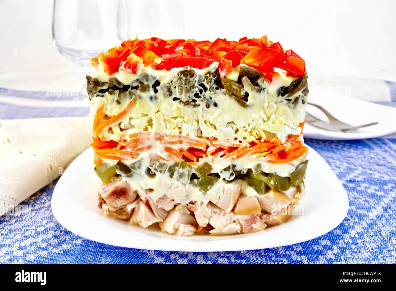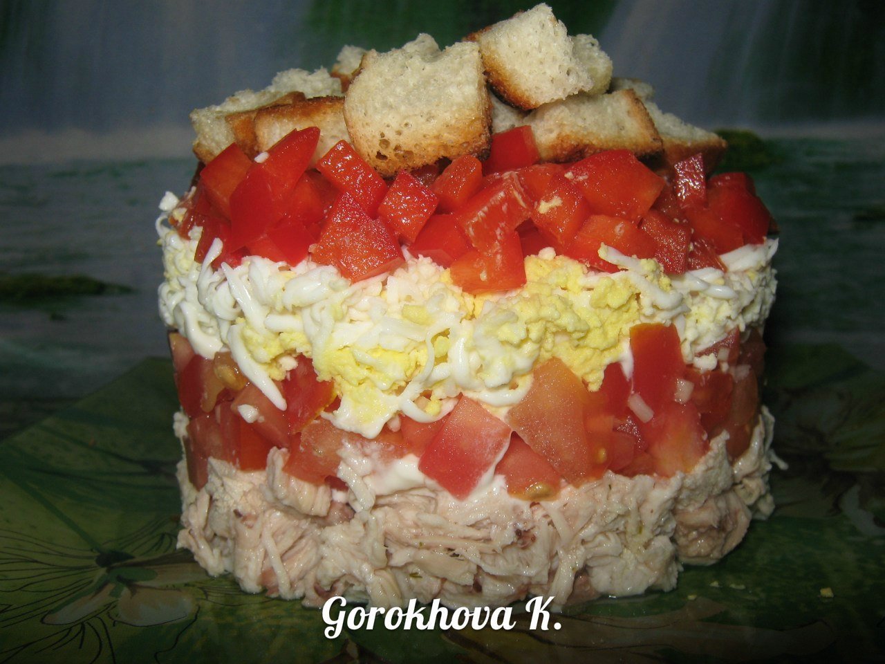 Слоёный салат с курицей и помидорами