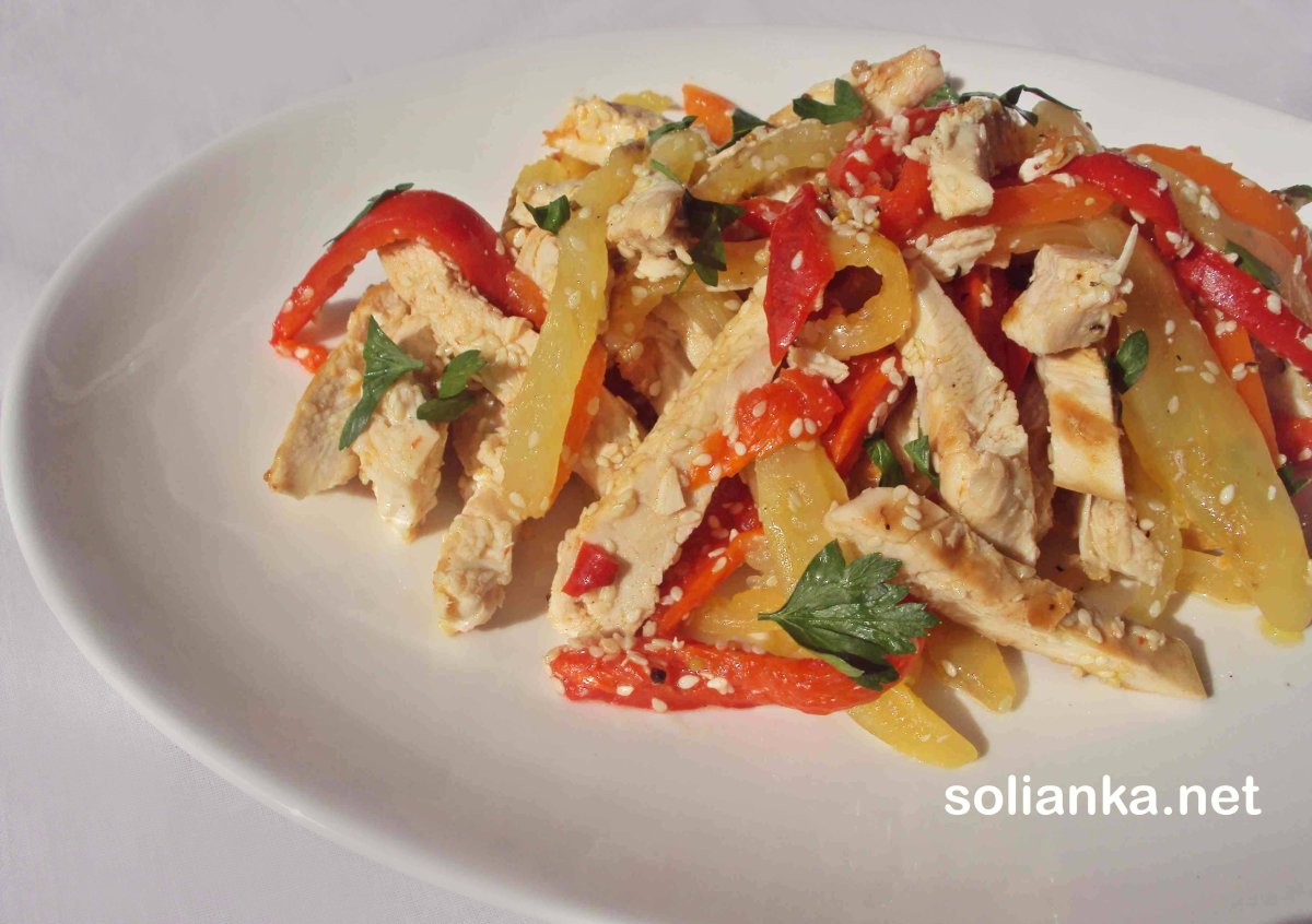 Тёплый салат с курицей сладким перцем
