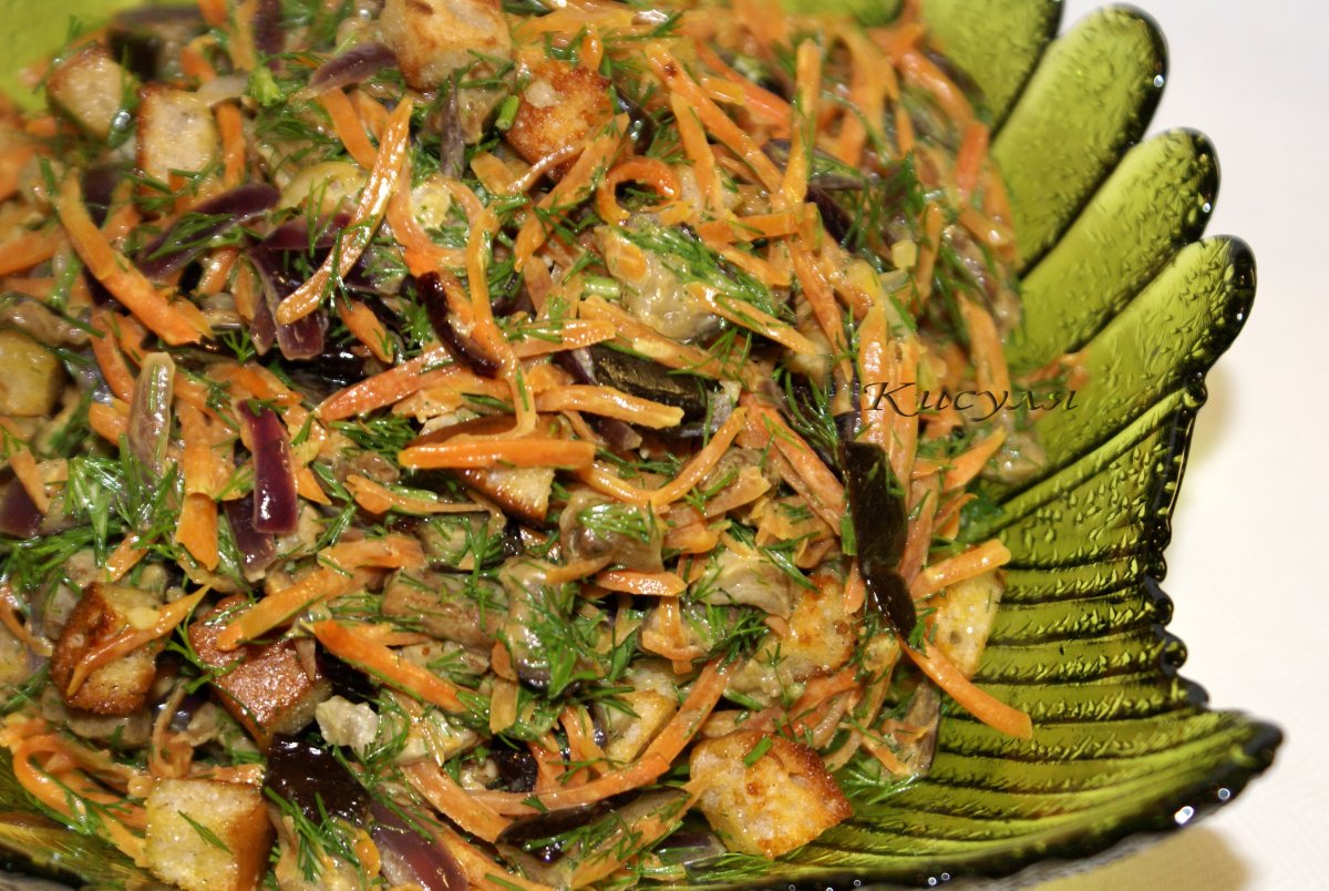Салат с копчёной курицей помидорами и сыром и сухариками